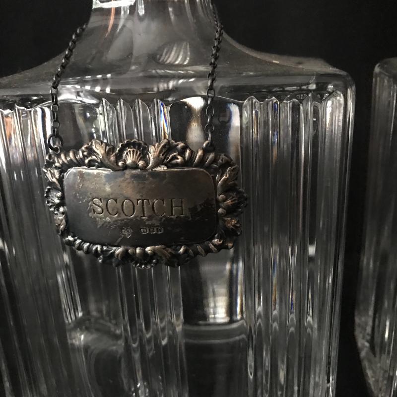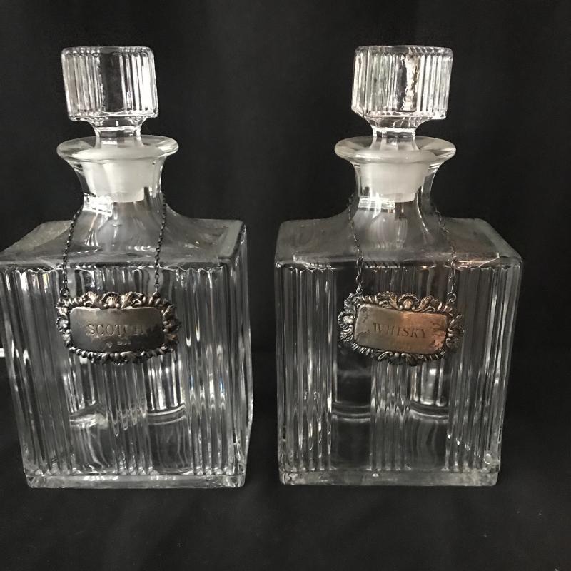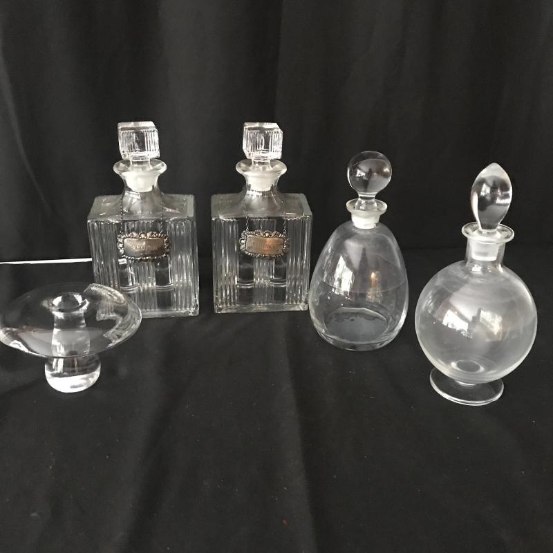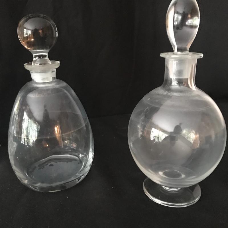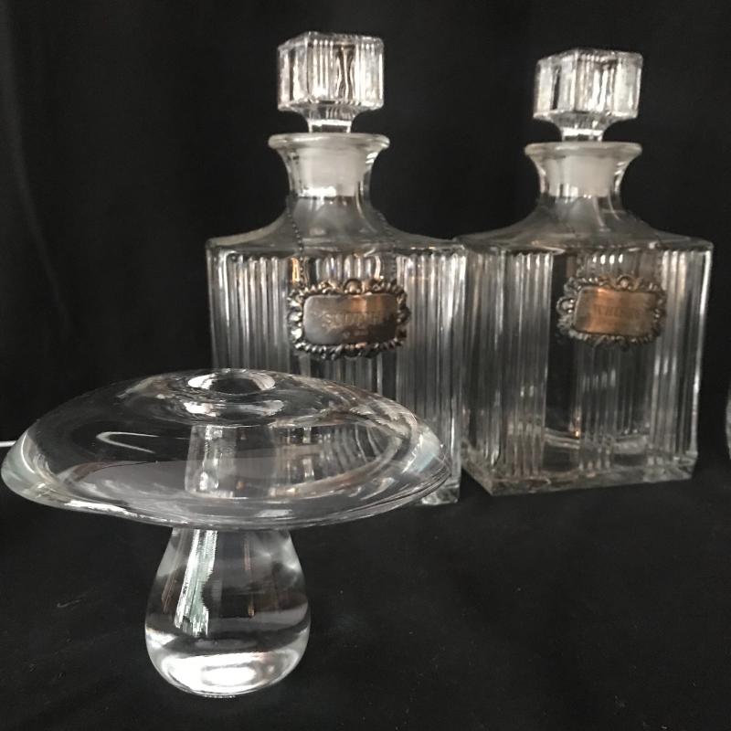 Two matching decanters with liquor tags and two that complement each other. Solid glass mushroom shaped piece. No apparent marking on any. Lot available for shipping.