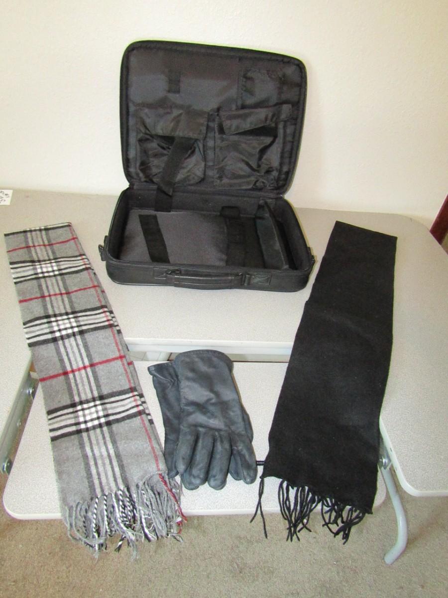 KENNETH COLE LAPTOP CARRY CASE THAT HAS VERY LIGHT WEAR AND 2 MEN'S SCARVES AND GLOVES