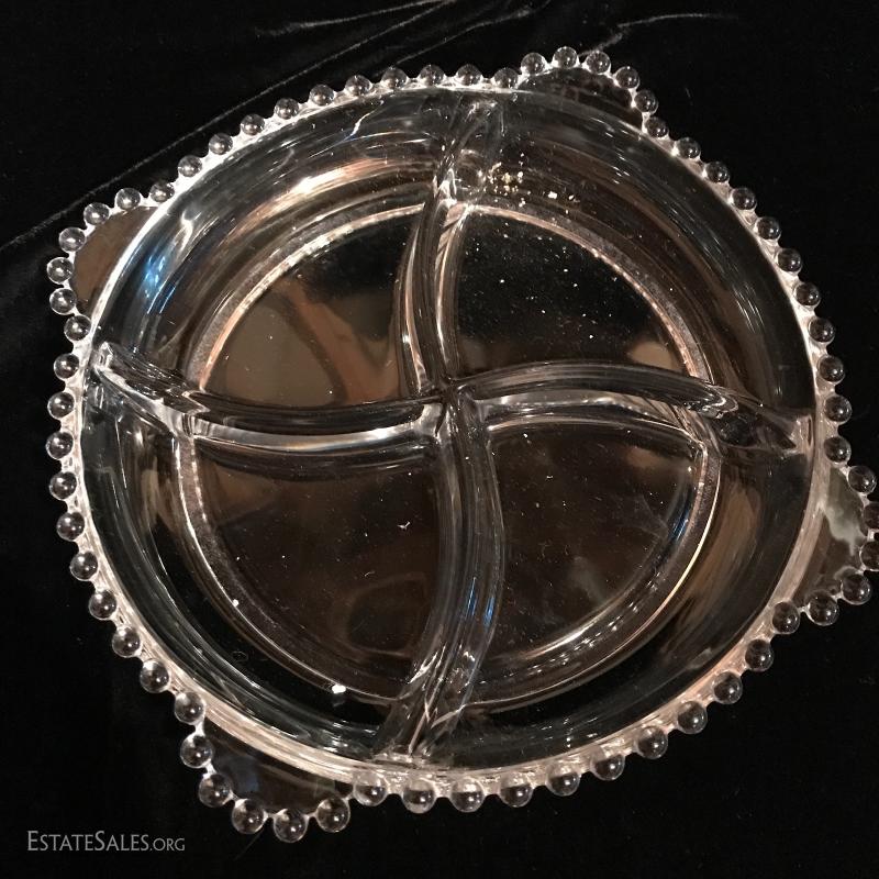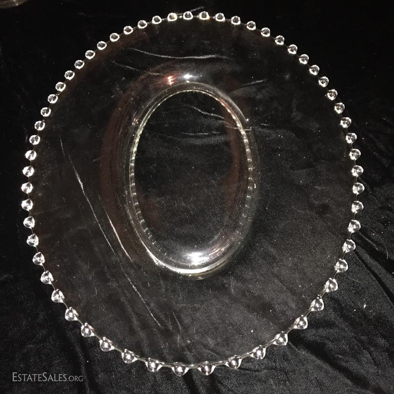7 pieces of clear glass service pieces with knob edging. No chips or scratches apparent. Platter measures 16.5" x 13.5". This lot is available for shipping or local pick up in Flat Rock, NC.