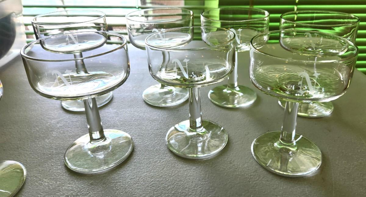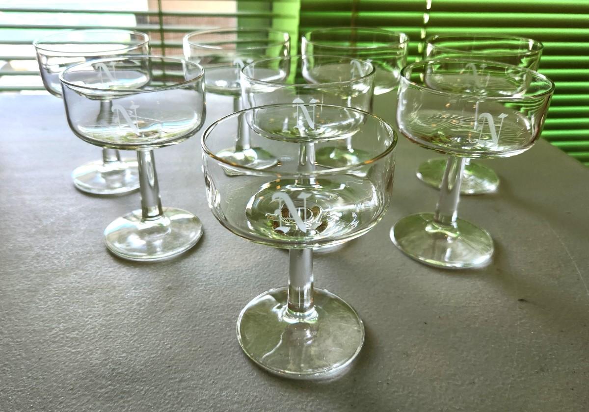 Lot of 7 vintage champagne glasses, etched initial "N". Each 4.5" tall - good condition.