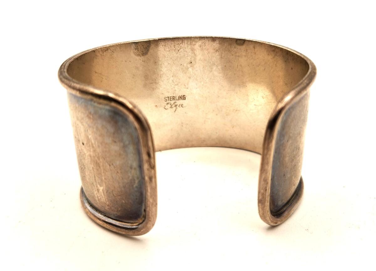 Pretty Sterling Silver (marked) cuff bracelet with oval Mother of Pearl insert. I have a 7.5" wrist and I find this bracelet a little on the small side. It fits me, but be aware. Cuff is 1.25" wide. Good condition.