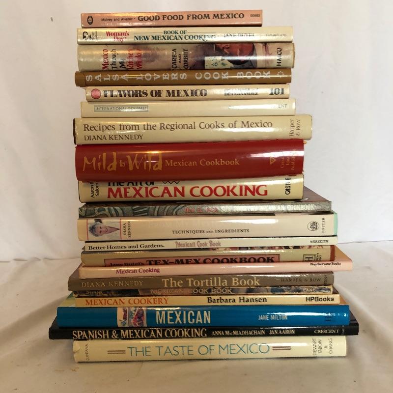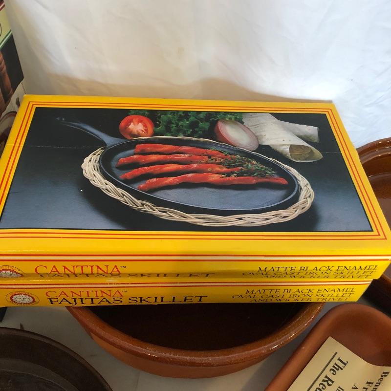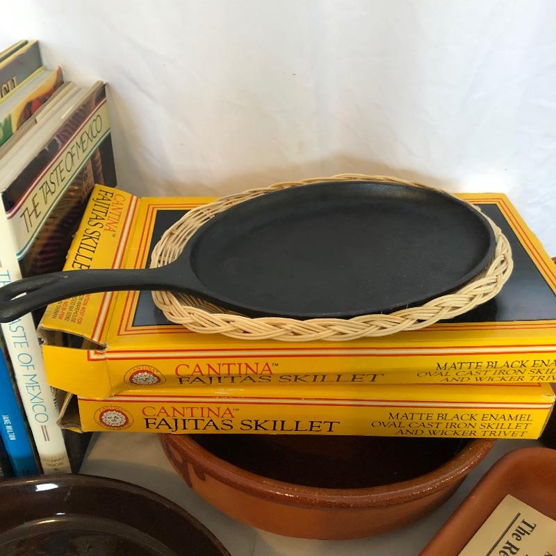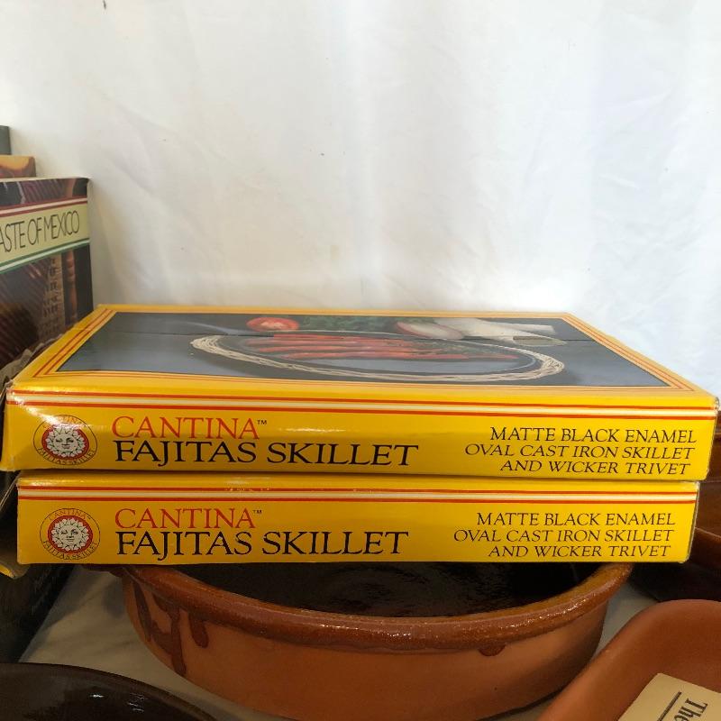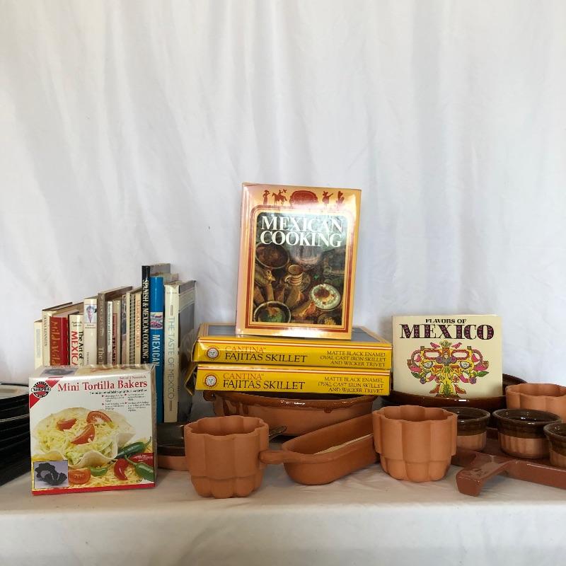 All you could possibly need to serve up delicious Mexican cuisine is in this lot. Over 20 Mexican cook books will have you covered, not to mention a slew of tools that includes 2 fajita skillets new in their boxes, six metal fajita plates, brand new in box pair of mini tortilla bakers, two large terra cotta bowls and much more; see images for everything that is included.