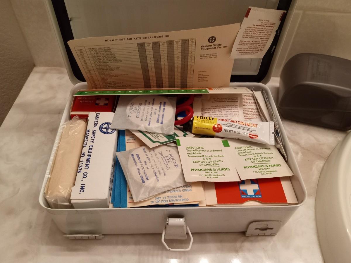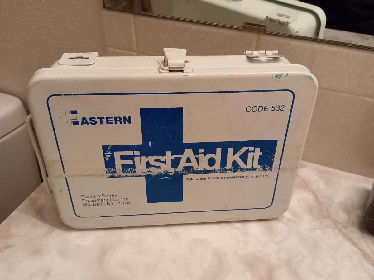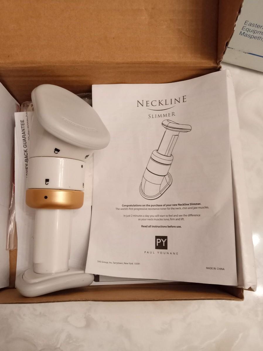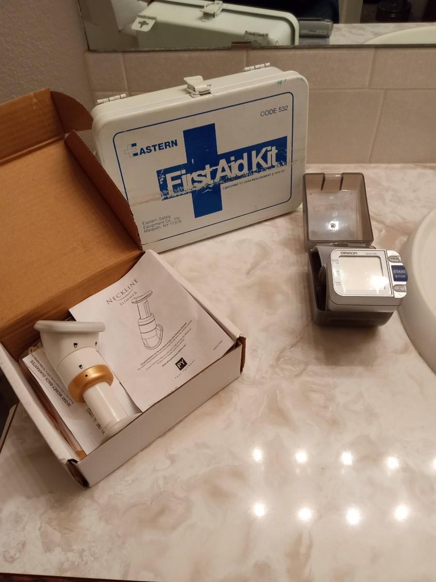 THE FIRST AID KIT IS METAL AND CAN BE MOUNTED ON THE WALL, THE NECKLINE SLIMMER IS SUPPOSE TO REDUCE THAT DOUBLE CHIN