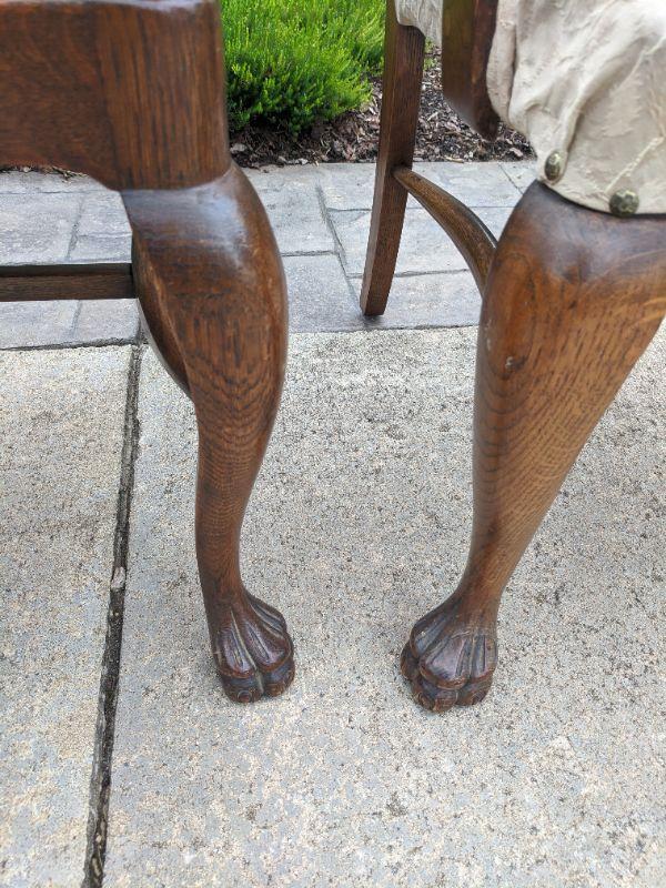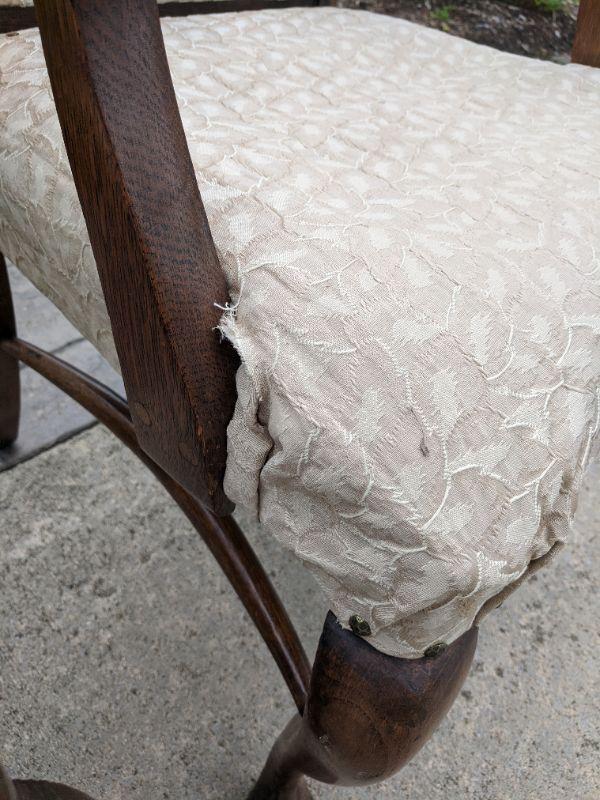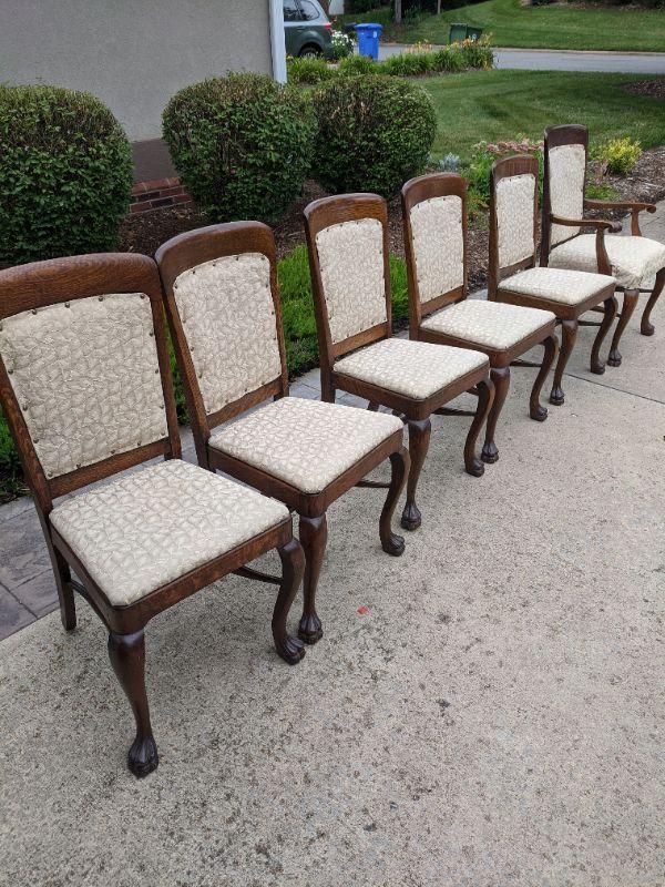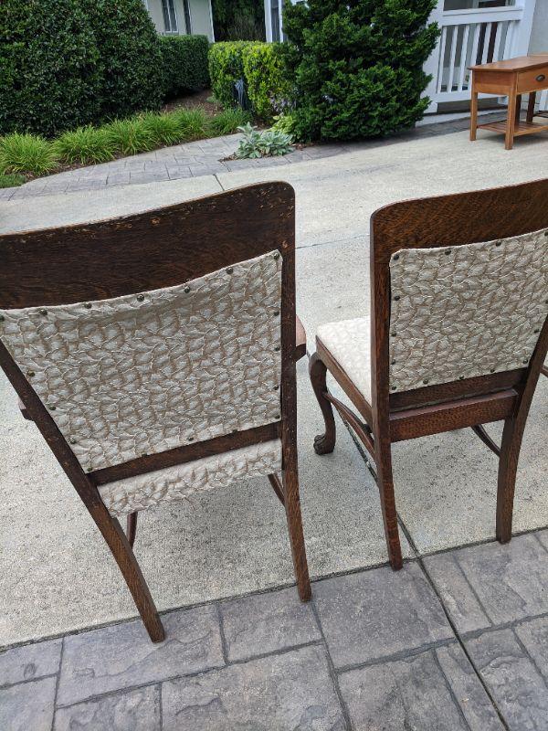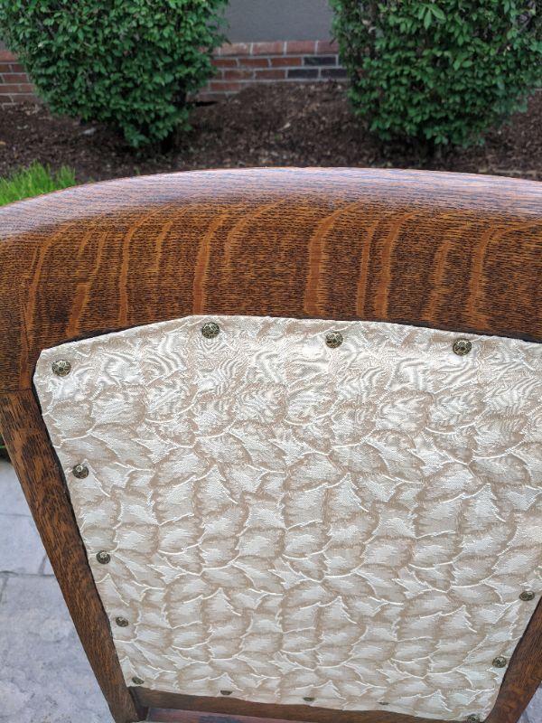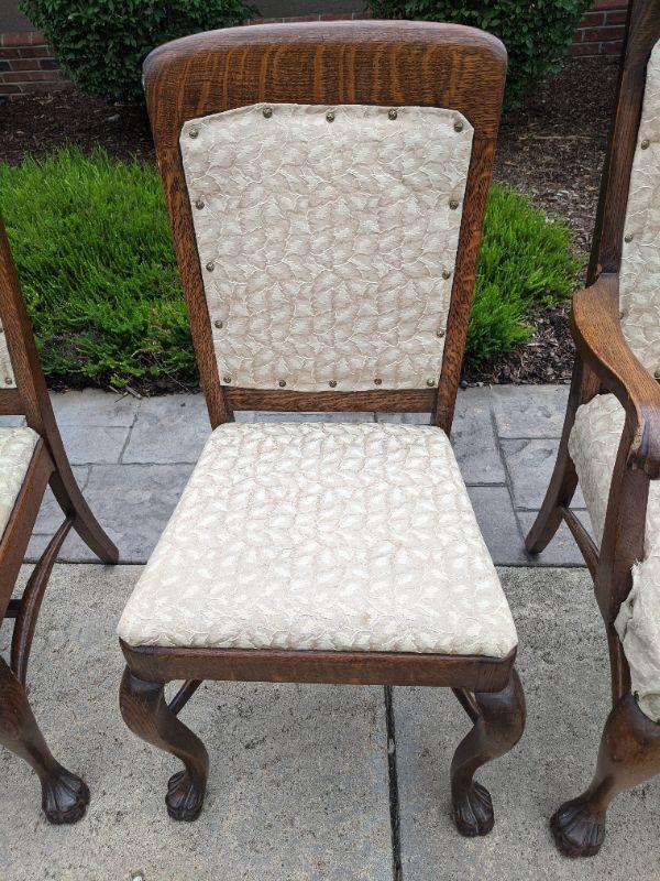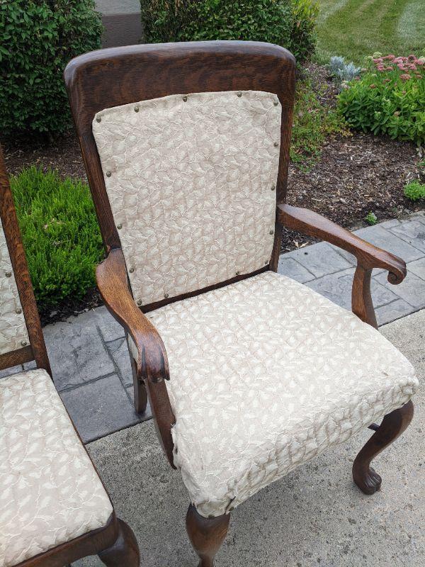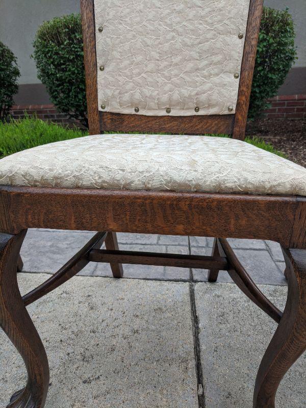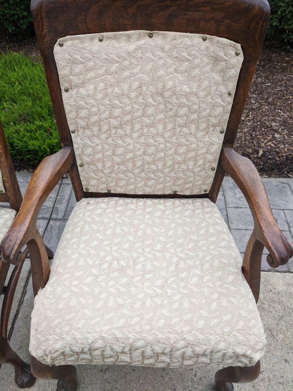 There are six beautiful antique Tiger Oak dining chairs in this lot. The fabric of the chair is a nice neutral color that has been redone, some areas are loose and the fabric warps in some spots. You can easily reupholster to enjoy these for years to come. The Tiger wood is gorgeous. There are five side chairs and one arm chair. The chairs are rather sturdy considering their age. This lot goes well with lot 177. No shipping.
