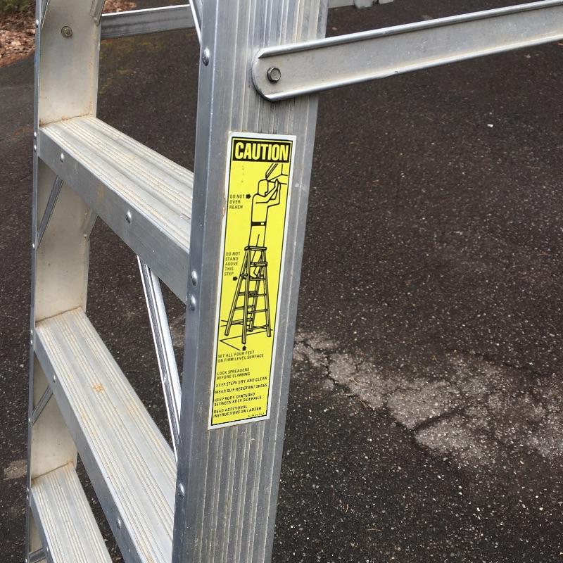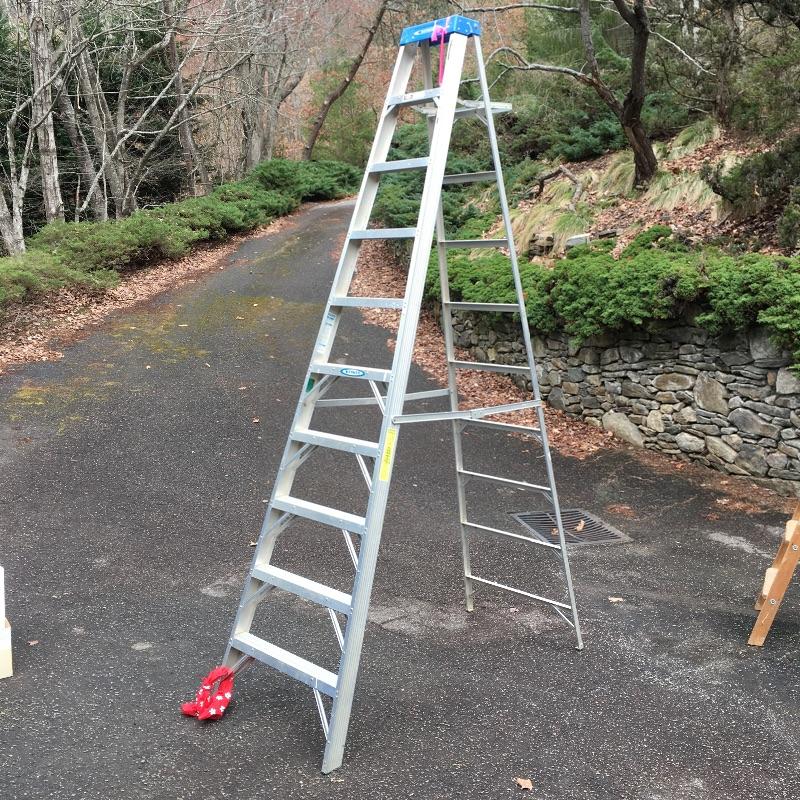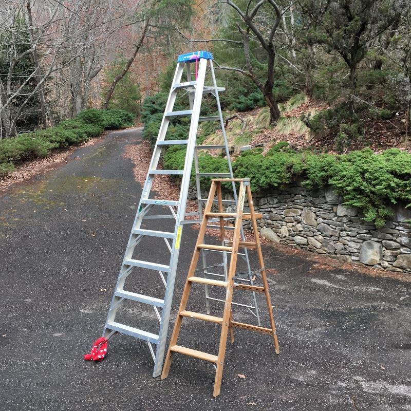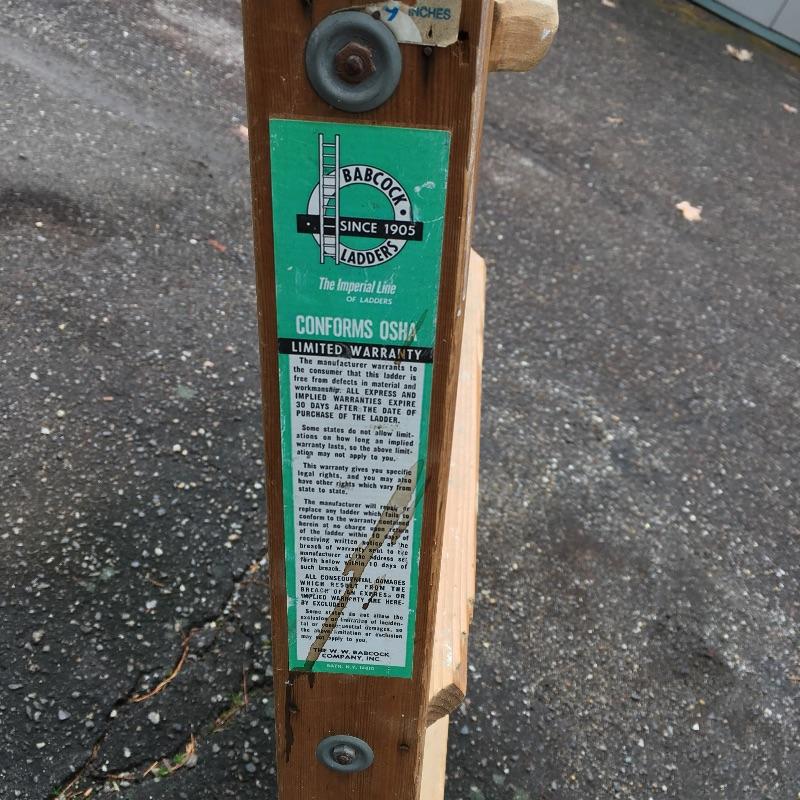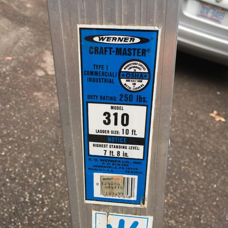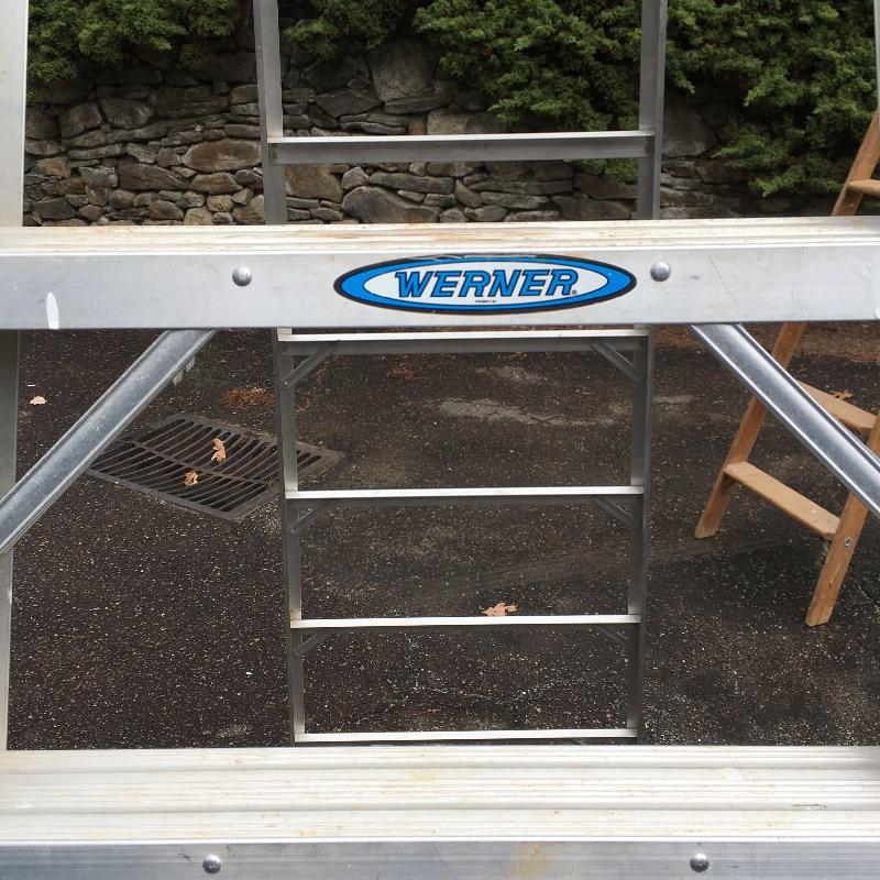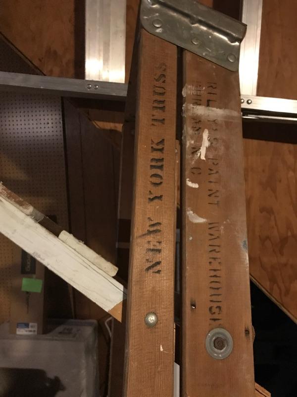 Pair of ladders includes Werner 10’ aluminum step ladder and wooden ladder stamped “New York Truss” that also has a sticker that says “Babcock” .