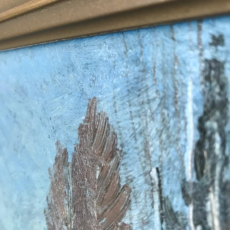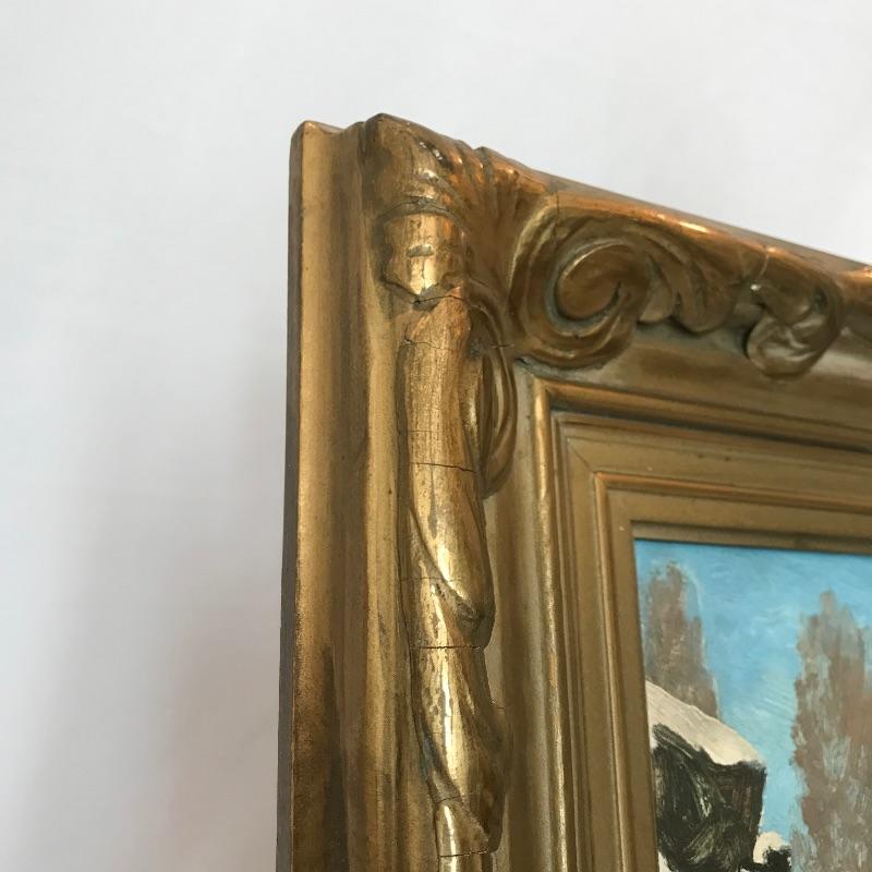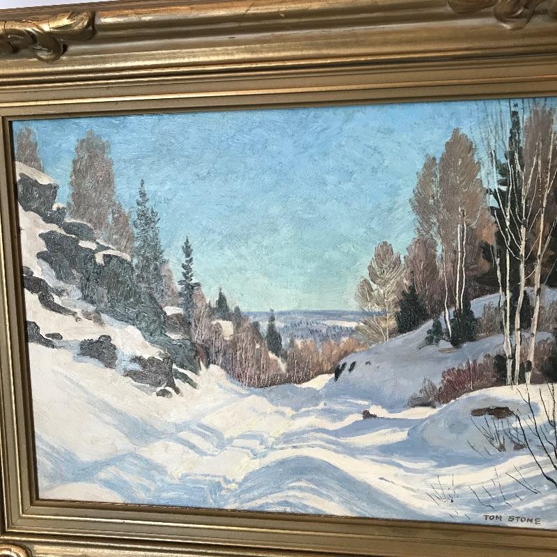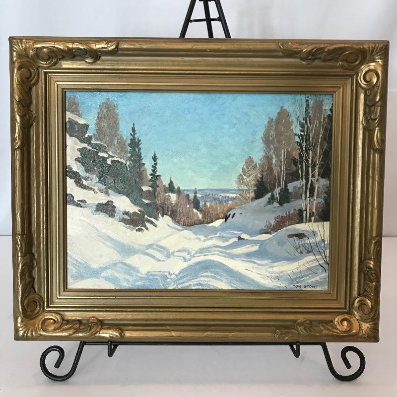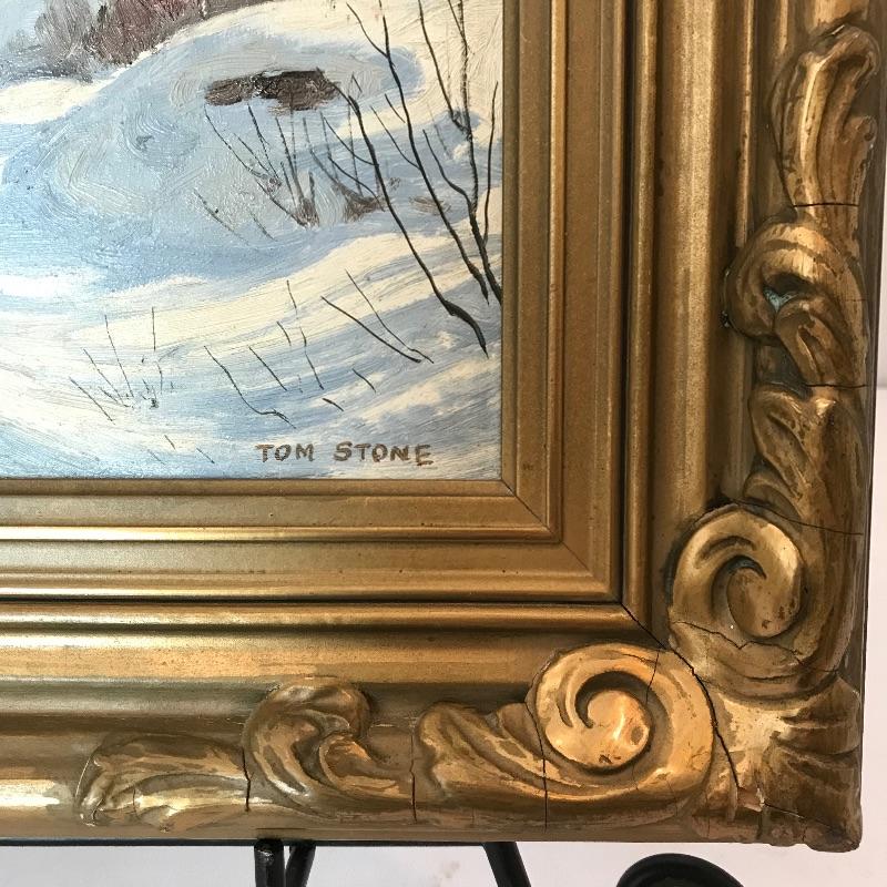 Beautiful snowy scene by Tom Stone. This oil painting appears to be on canvas and sits in a lovely gold painted wooden frame. Frame measures 21.75” x 17.75”. See photos. Shipping available. Please call UPS with dimensions at 828-252-6930 for a shipping quote prior to bidding.