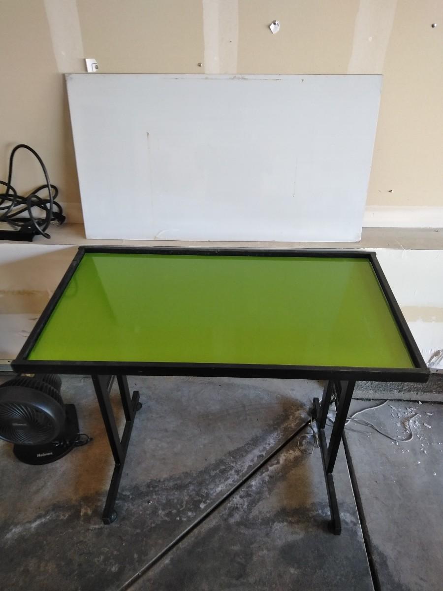 SMALL BLACK METAL DESK WITH 4 CHANGABLE COLORED TOPS. COMES WITH A SMALL DESK FAN, A CORK BOARD, AND A POWER STRIP. DESK IS 29" X 35.5" X 20"