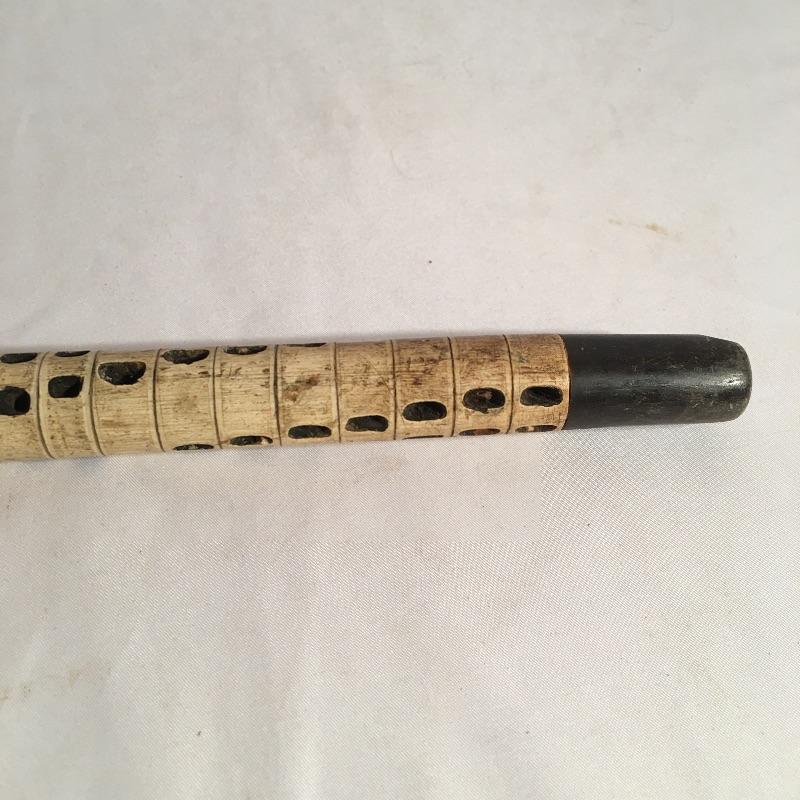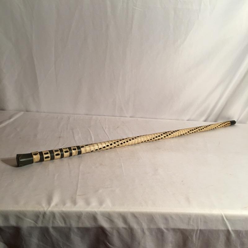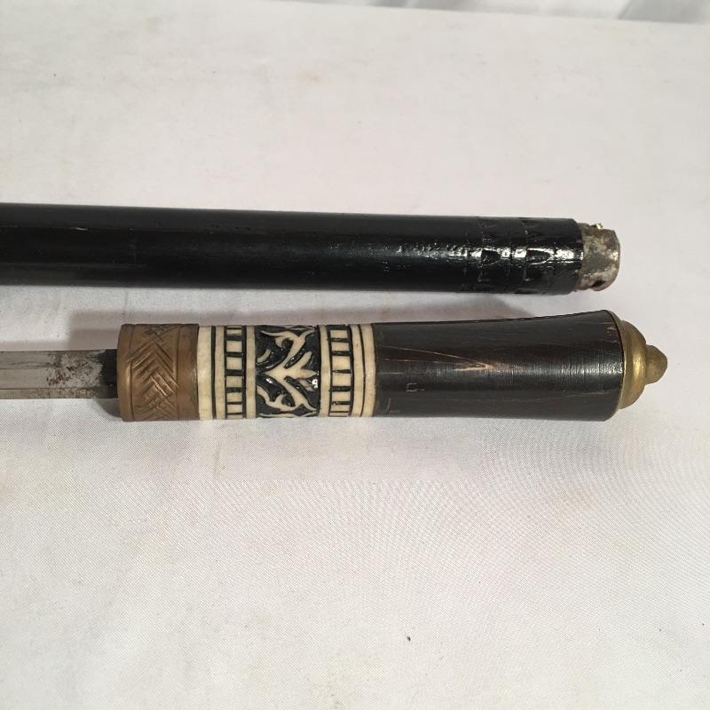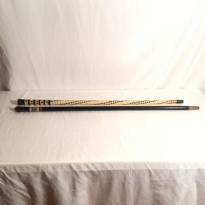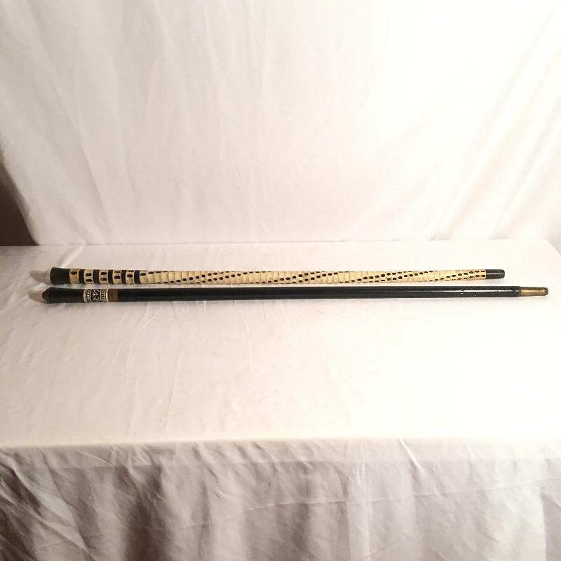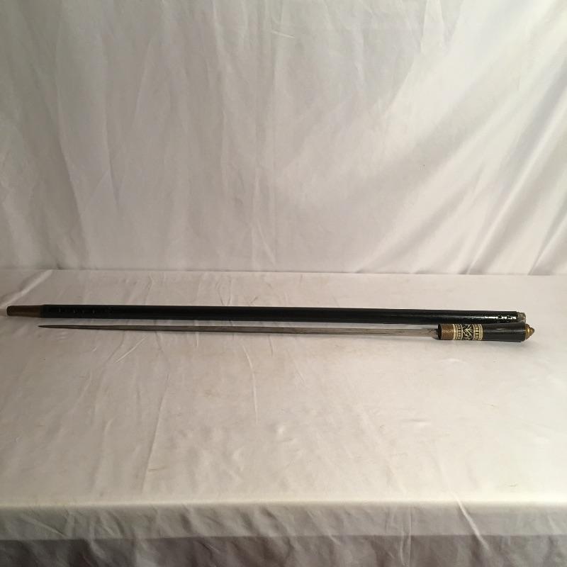 This unique sword with brass top and ivory colored design on handle that pulls out to reveal a 23.5” long blade. Also includes a white and black colored cane that has some wear on the tip, see pictures. Sword cane measures 36”.
