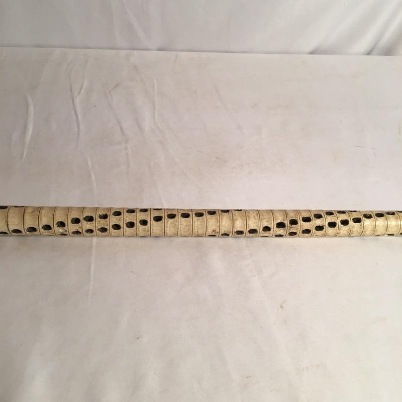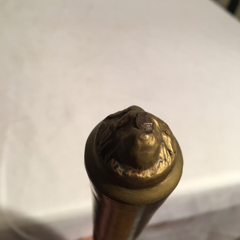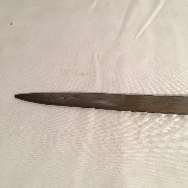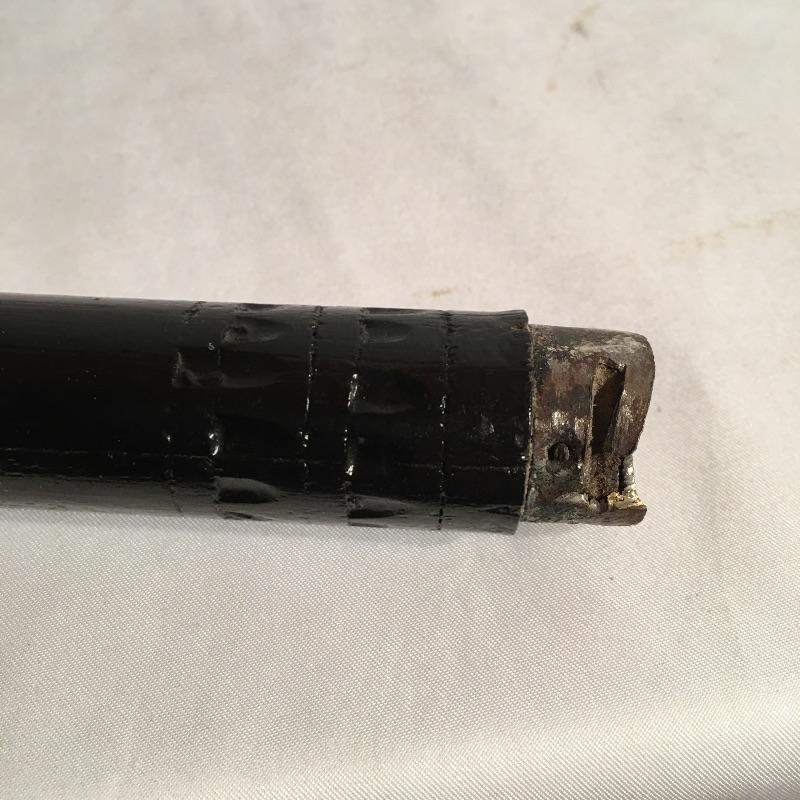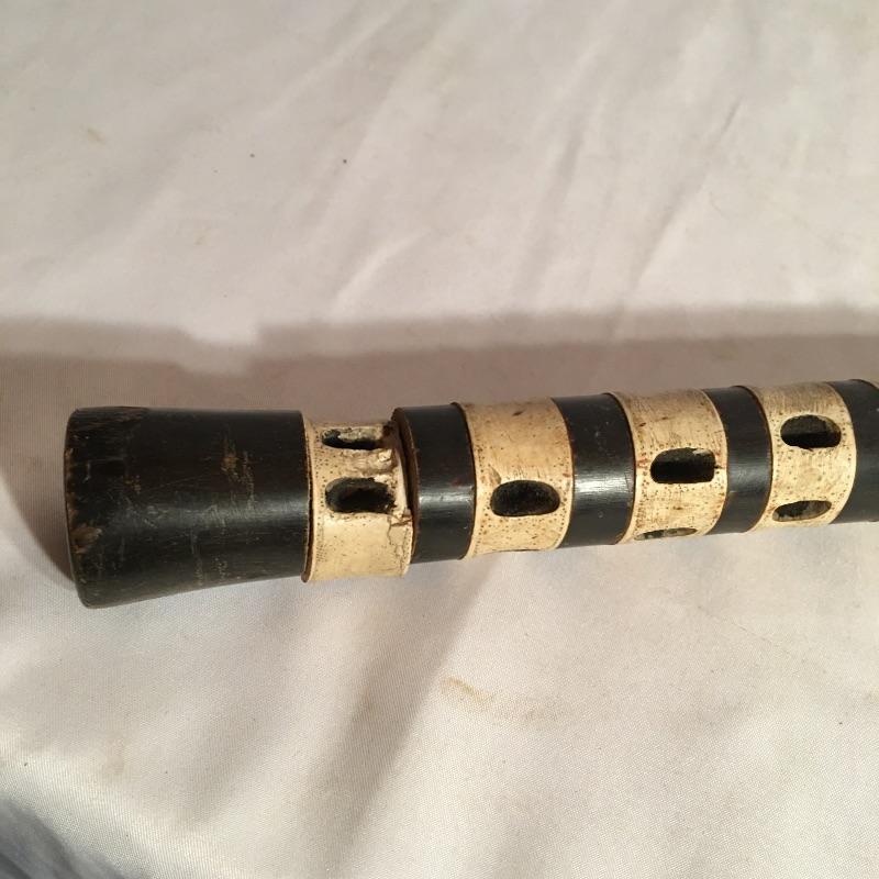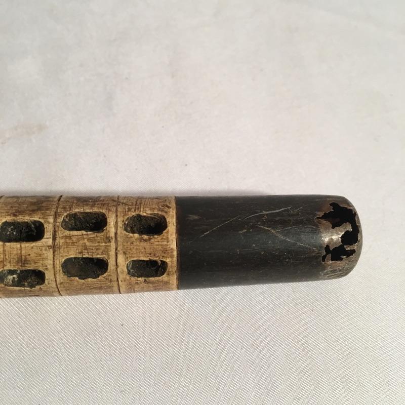 This unique sword with brass top and ivory colored design on handle that pulls out to reveal a 23.5” long blade. Also includes a white and black colored cane that has some wear on the tip, see pictures. Sword cane measures 36”.