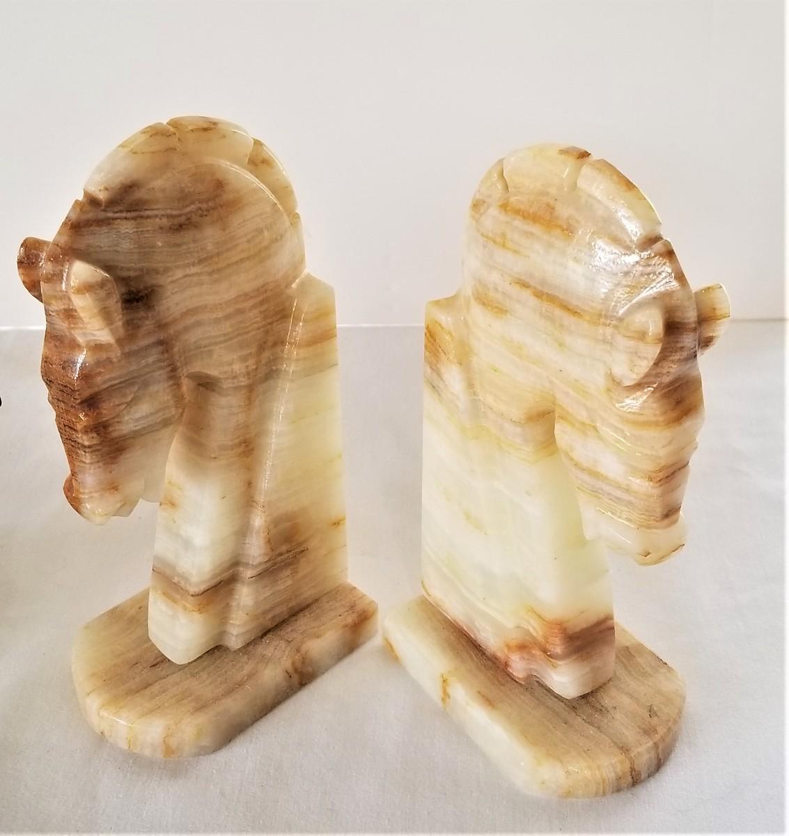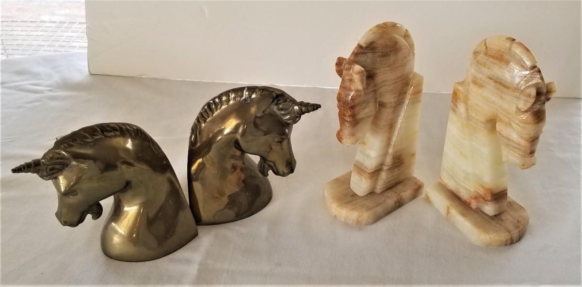 Bookend Lot - heavy brass set of unicorn bookends, 6.5" tall. and a classic set of Onyx Horse Head bookends, 8.5." tall. Both are unmarked.