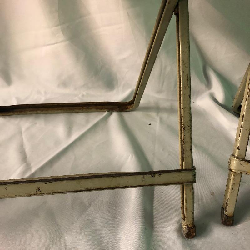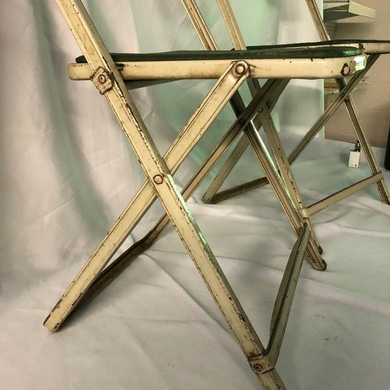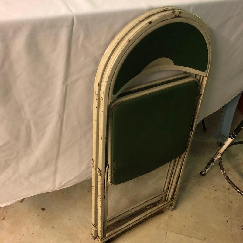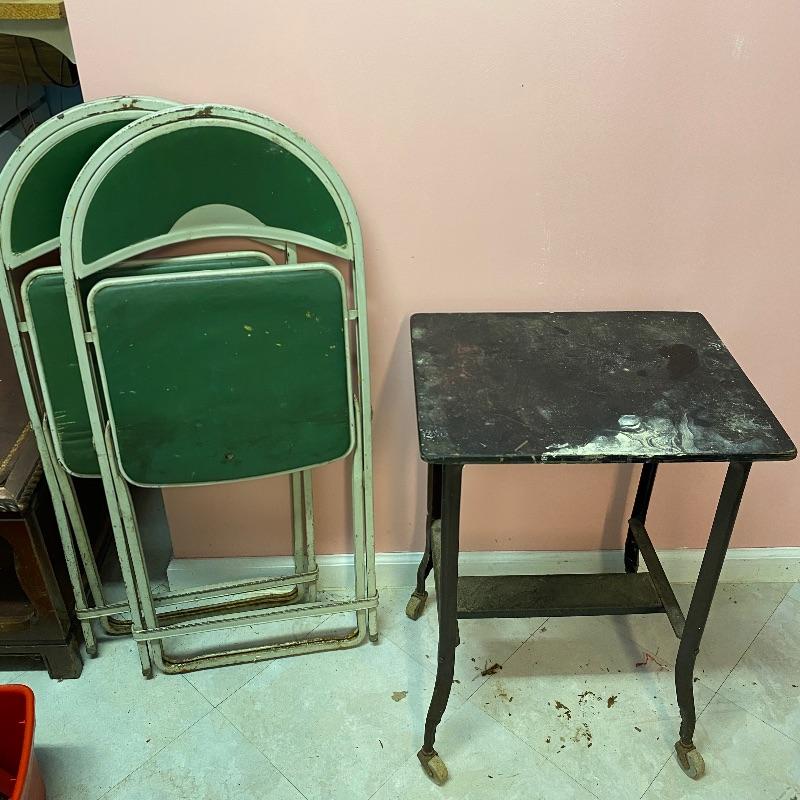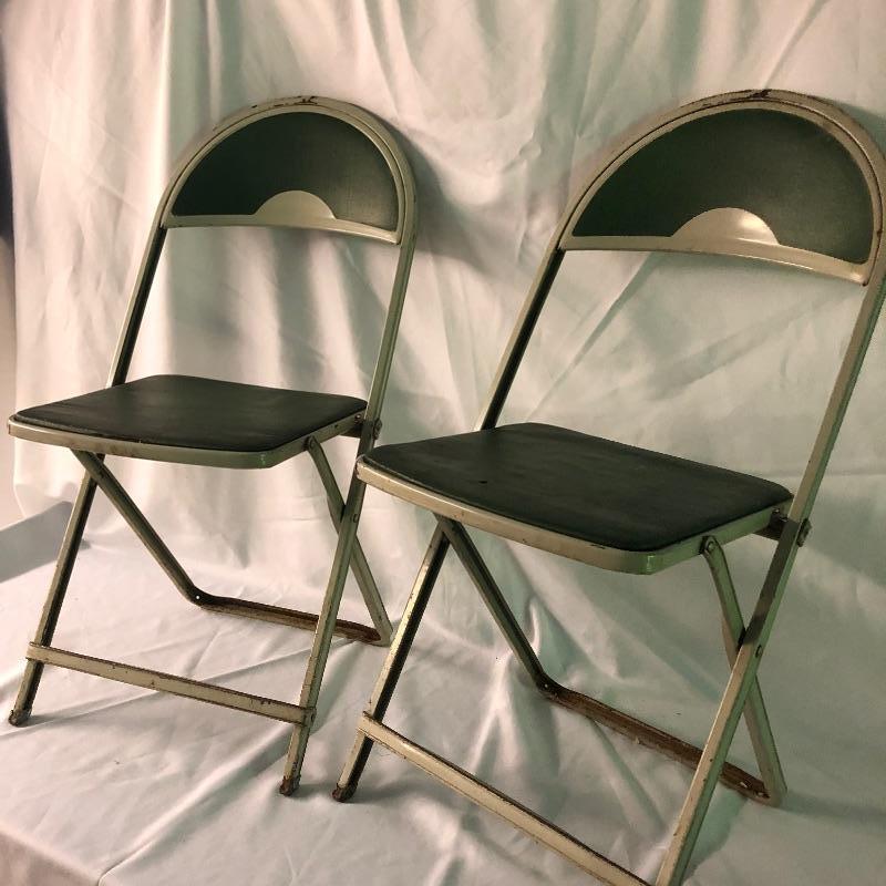 This pair of matching vintage chairs are a light grey metal with green vinyl seats. They fold up easily and are in decent condition for their age. There are some signs of age however and one seat has a burn hole in it which is shown in an image. There is also a small black metal table on wheels included in this lot. Has some paint stains but adds to the charm.