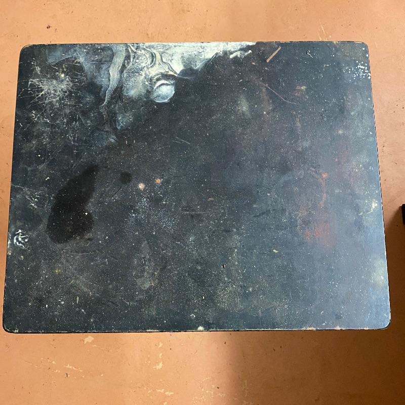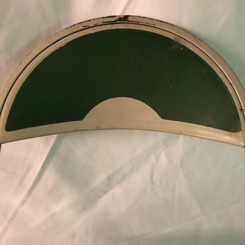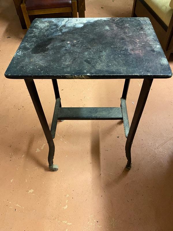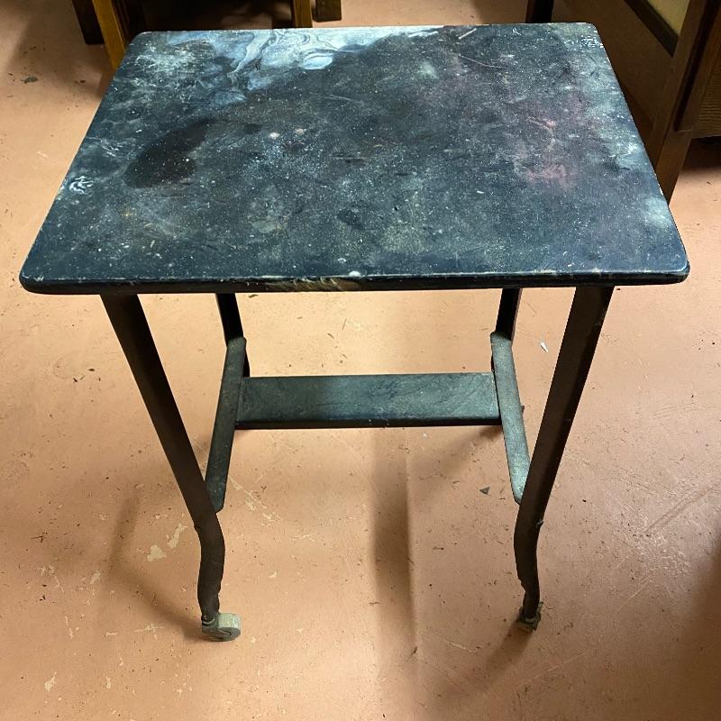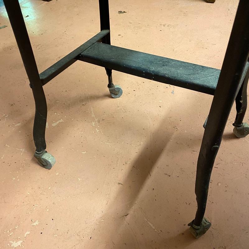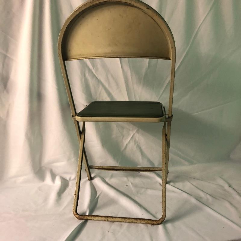 This pair of matching vintage chairs are a light grey metal with green vinyl seats. They fold up easily and are in decent condition for their age. There are some signs of age however and one seat has a burn hole in it which is shown in an image. There is also a small black metal table on wheels included in this lot. Has some paint stains but adds to the charm.
