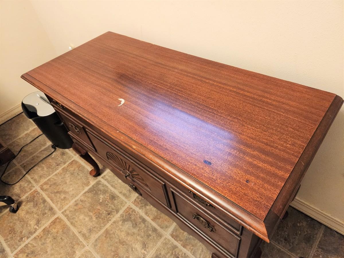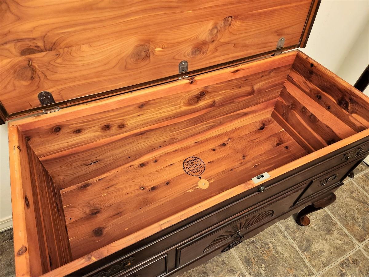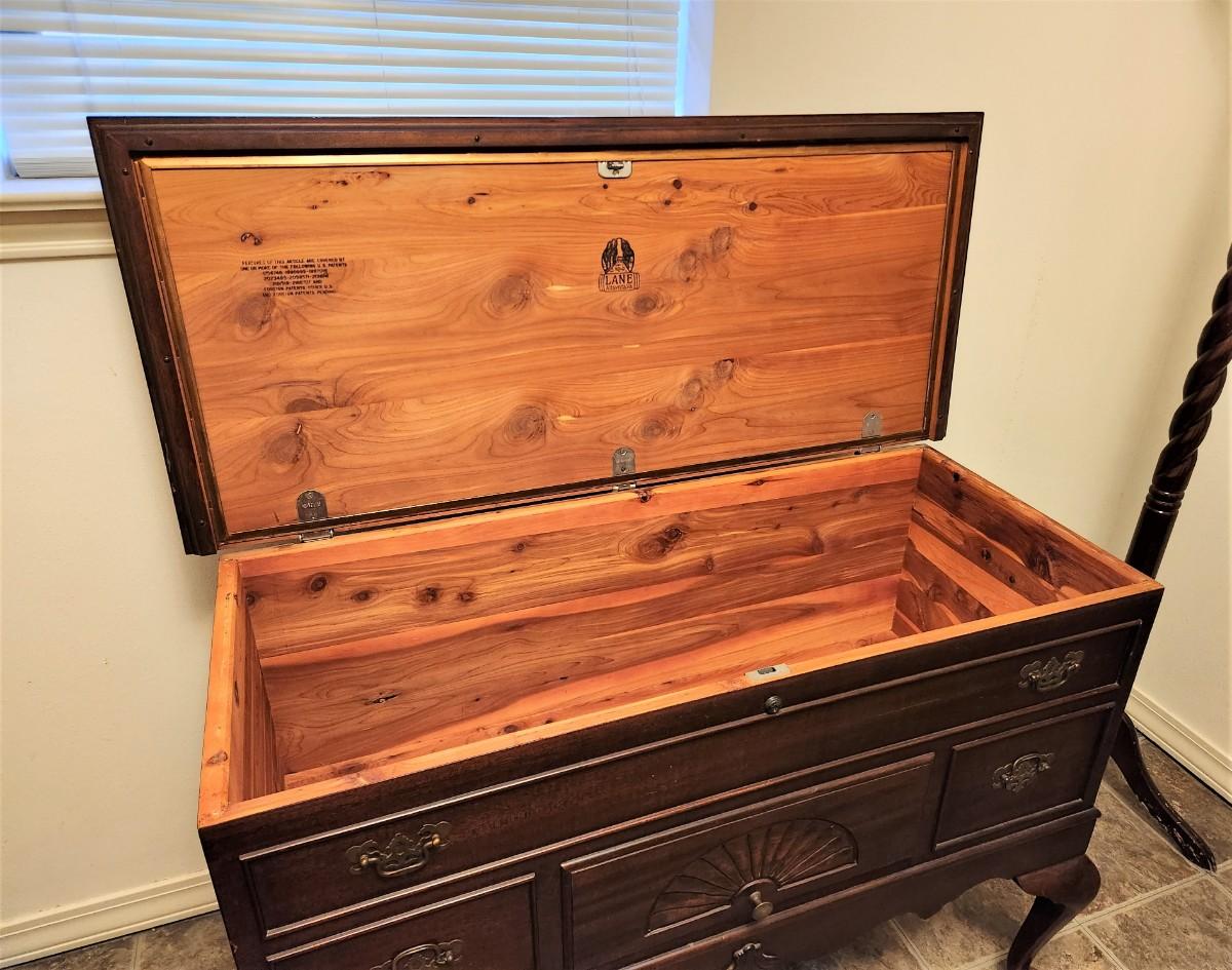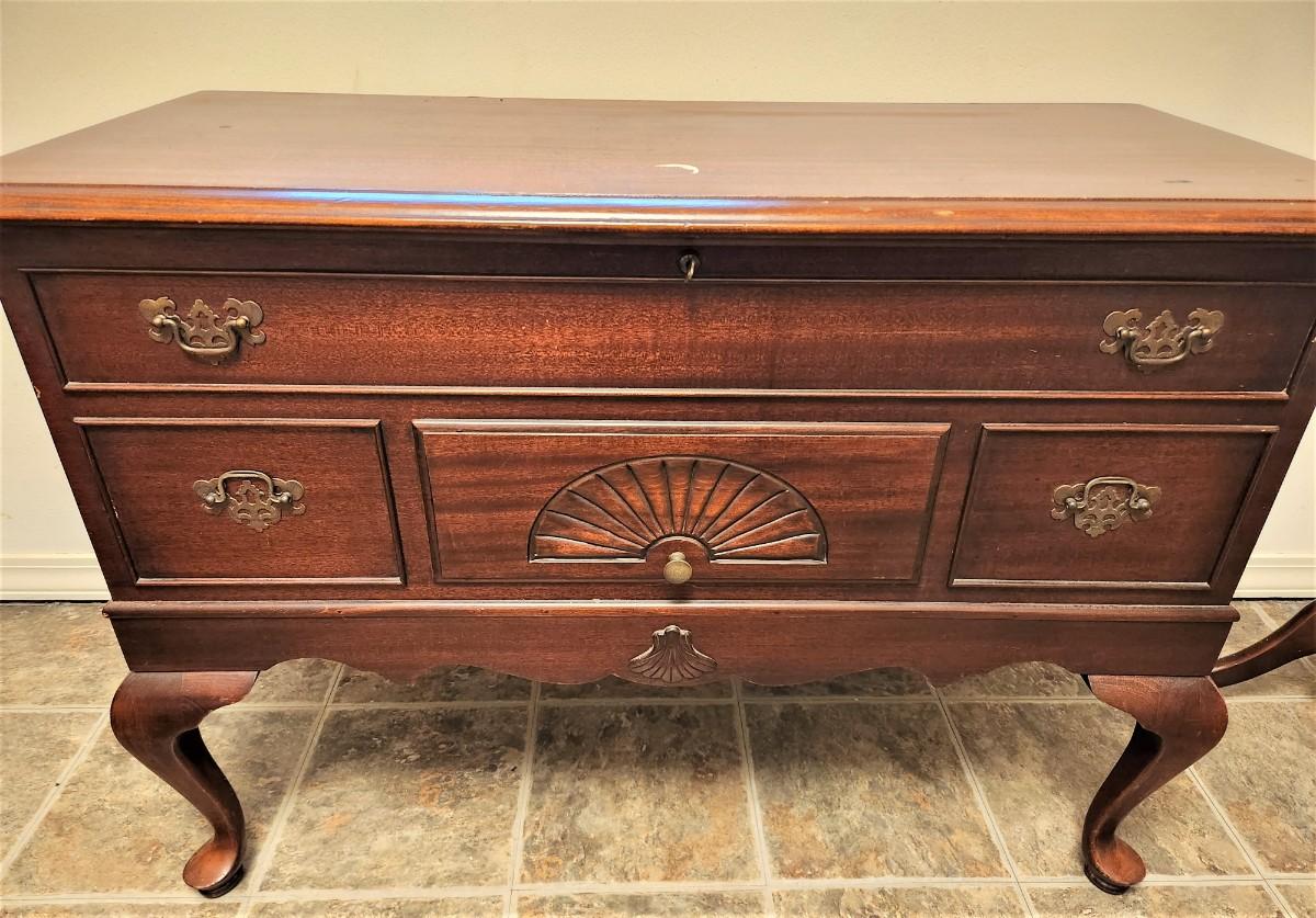 45" across, 19.5" deep, 32" tall - false drawer fronts - LANE Cedar Chest Queen Anne Style, clean, with working key. Note "half-moon" bit of damage to the finish on the top.