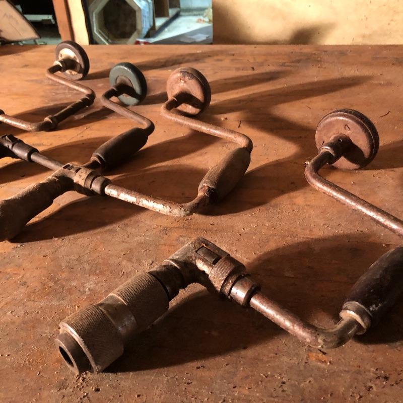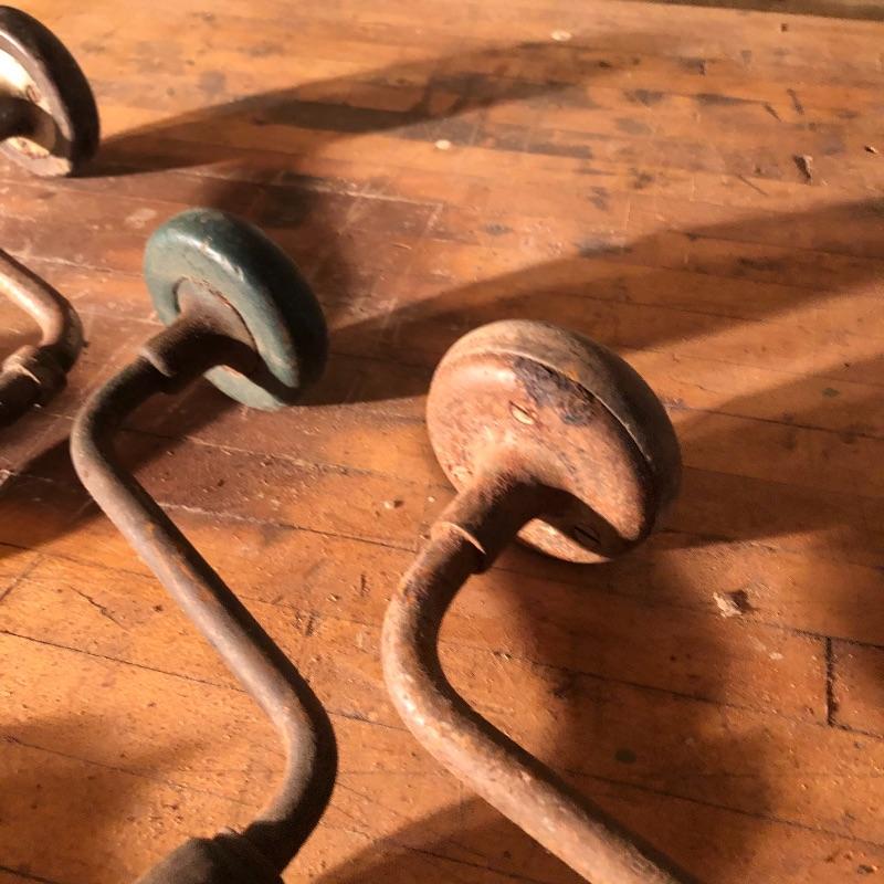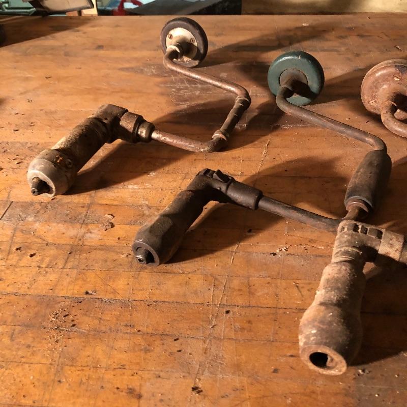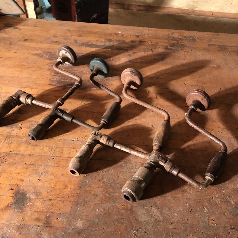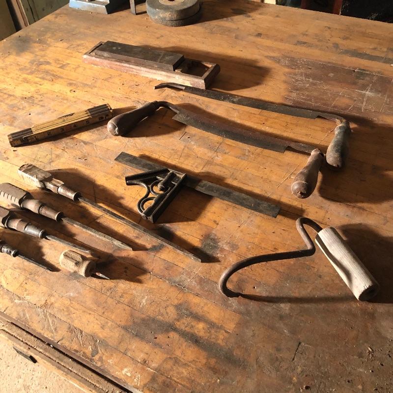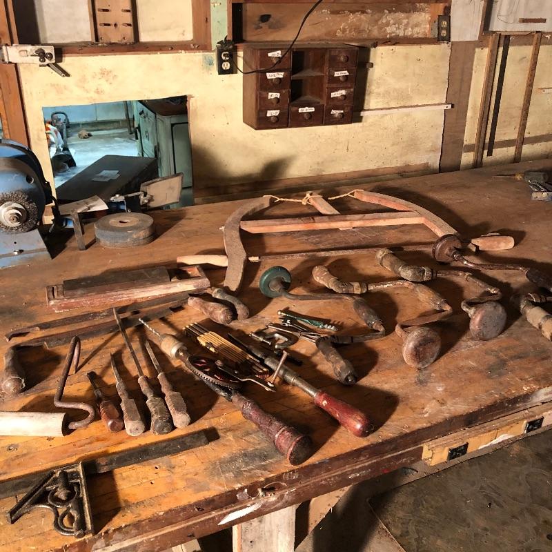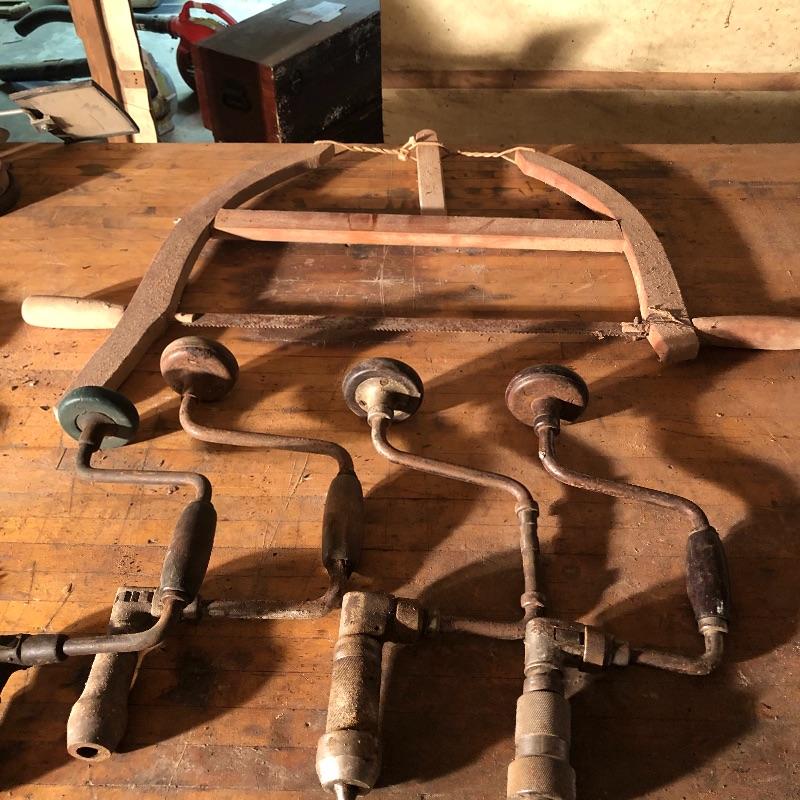 This is an interesting tool lot! It contains a handcrafted hand saw, hand drills, wooden tools and so much more! The grinder affixed to the work bench is not included in this lot. Shipping Available!