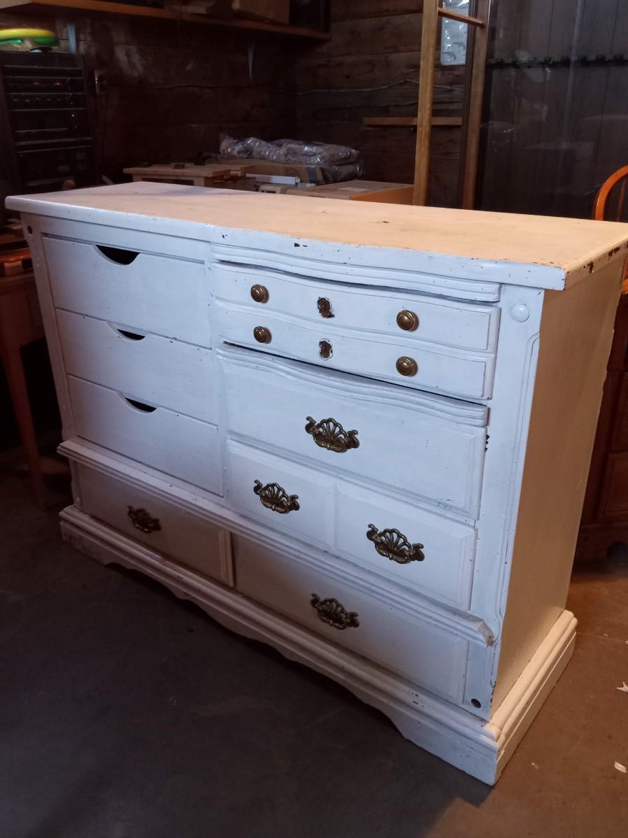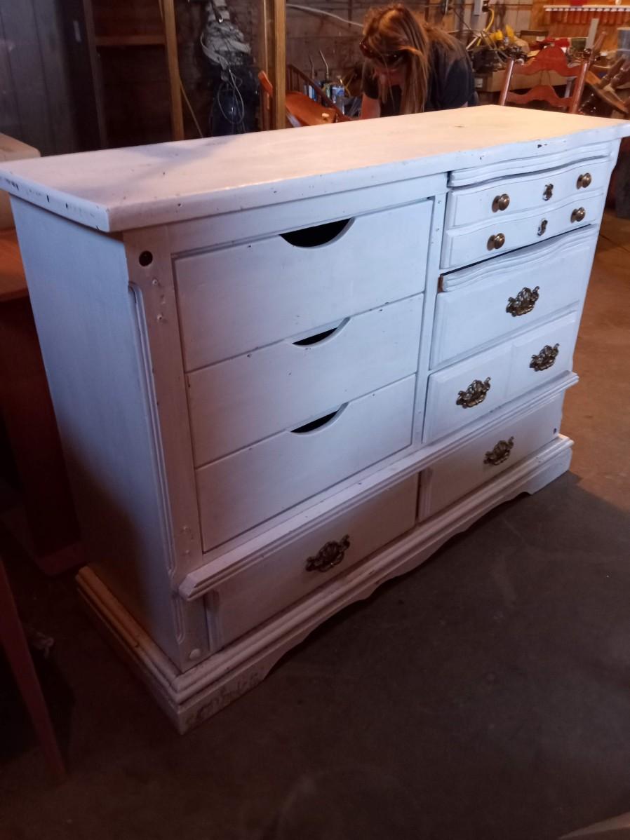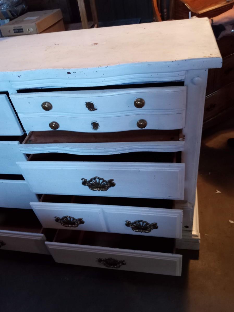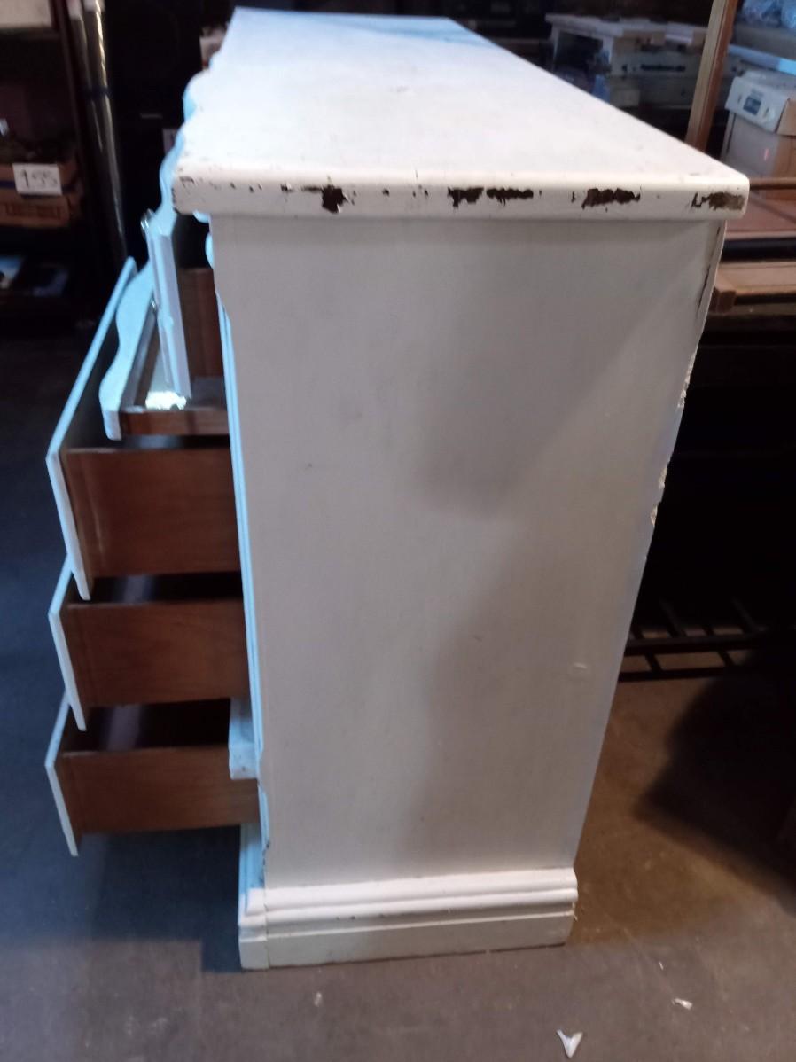 WHITE DRESSER WITH 8 DRAWERS AND A PULL-OUT WRITING TABLE.? IT IS MISSING A DOOR ON THE LEFT SIDE THAT USE TO COVER THE 3 DRAWERS AND IT HAS SOME BUMPS AND SCRATCHES. IT MEASURES 56" X 18" X 39"