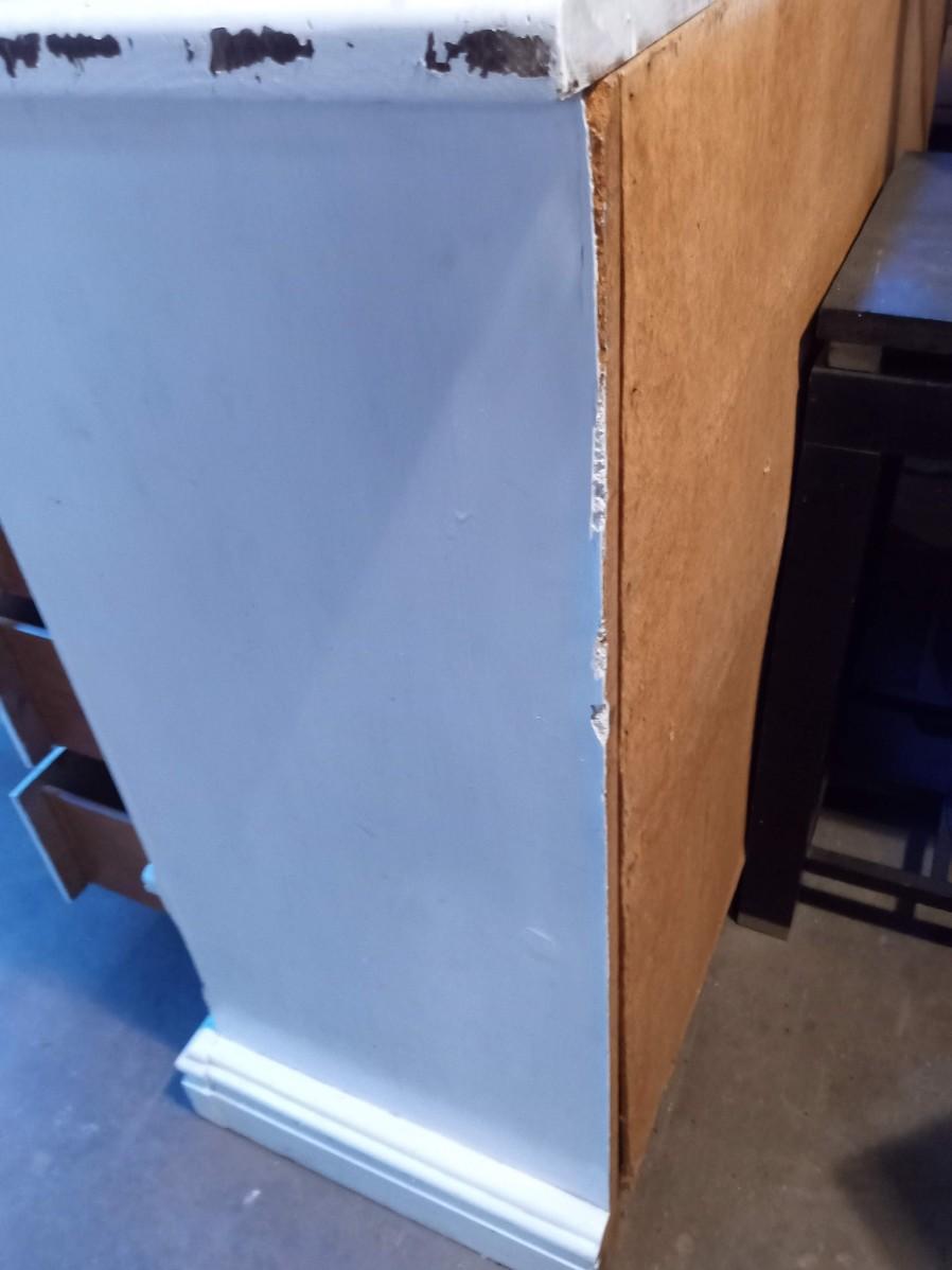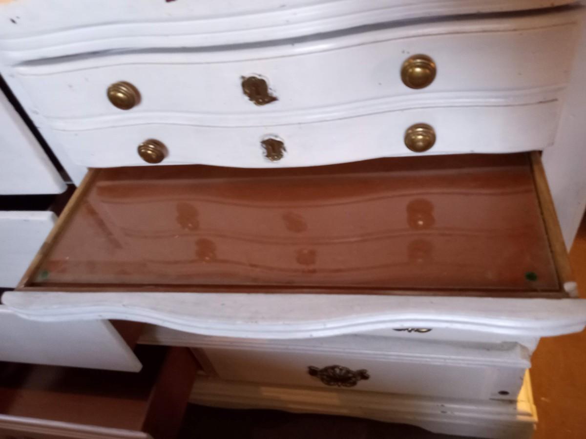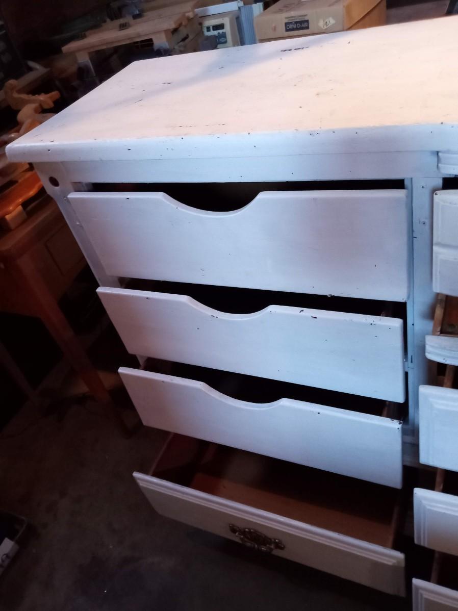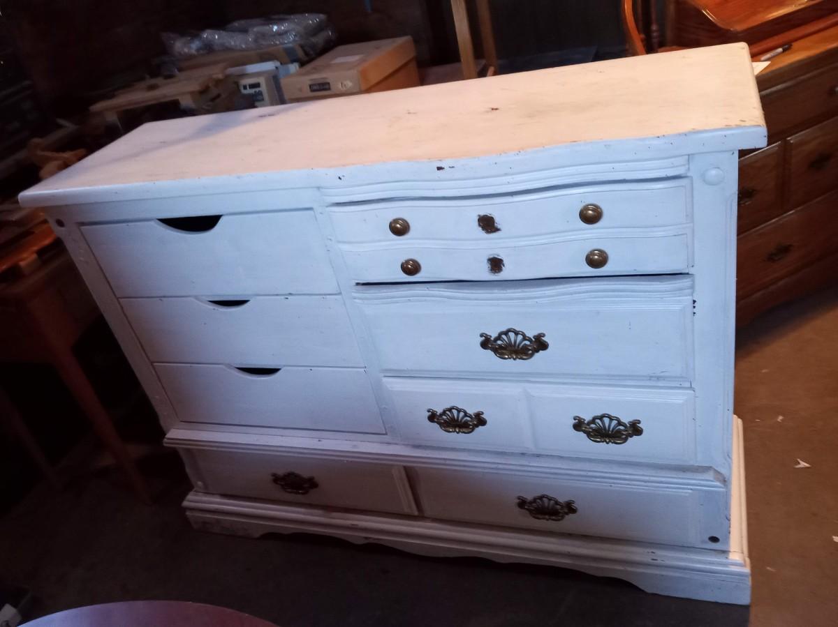 WHITE DRESSER WITH 8 DRAWERS AND A PULL-OUT WRITING TABLE.? IT IS MISSING A DOOR ON THE LEFT SIDE THAT USE TO COVER THE 3 DRAWERS AND IT HAS SOME BUMPS AND SCRATCHES. IT MEASURES 56" X 18" X 39"