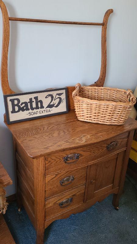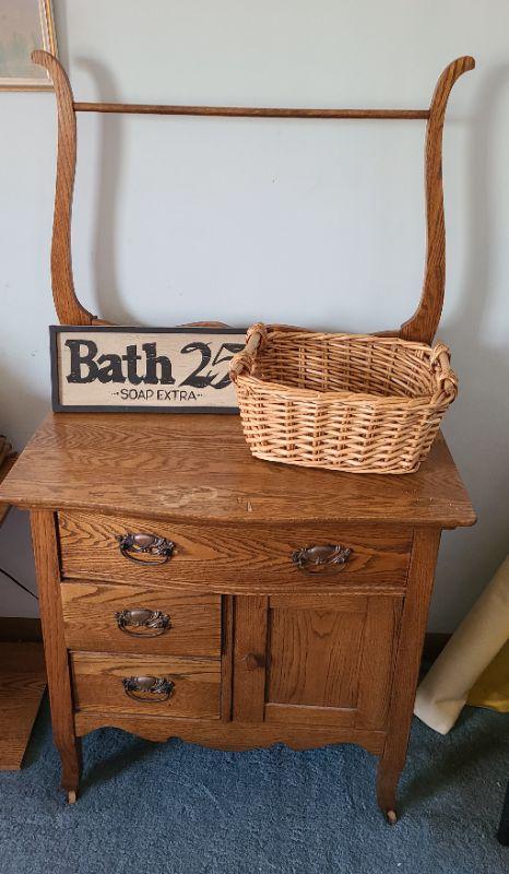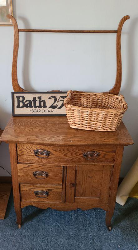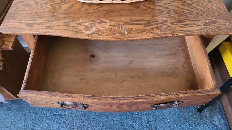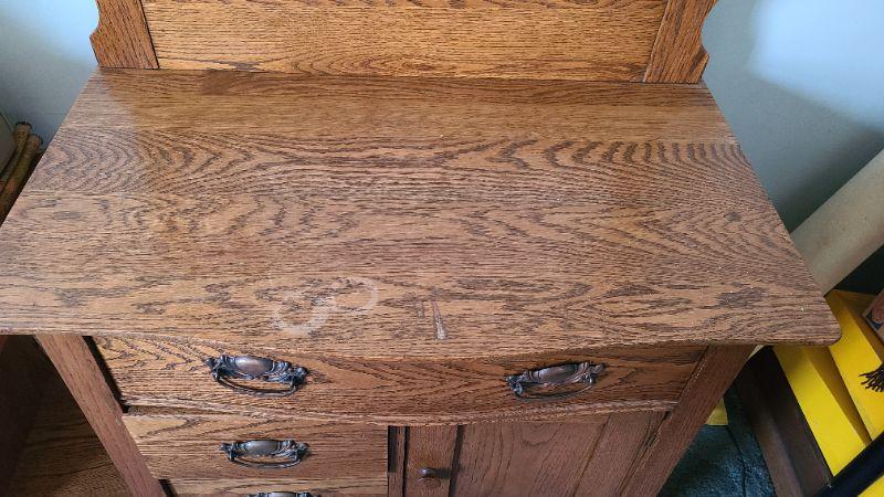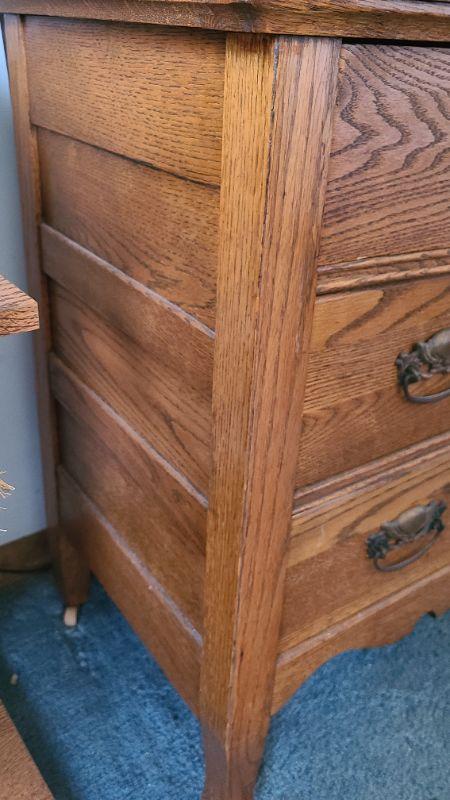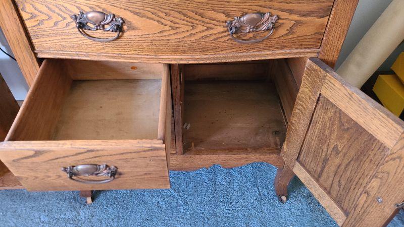 Nice wood piece with dovetailed drawers and original wood wheels.. Top shows a little wear. 31x17.5x 30 inches tall is the bottom piece. Top does come apart and adds 27 inches in height. Please see all pictures for content of the lot, condition of the lot, and measurements if taken. Pictures are the best representation of the items listed and items are untested unless indicated in description. Thank you for looking and have fun bidding!