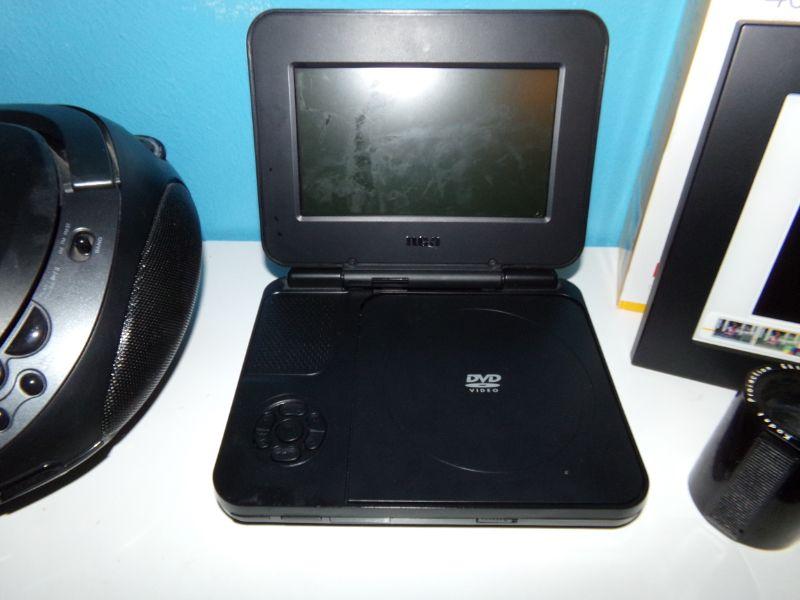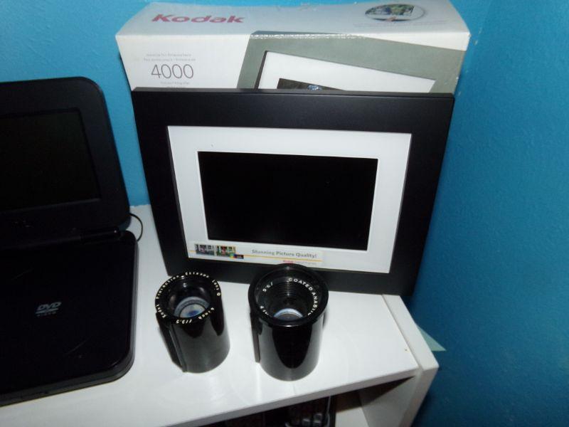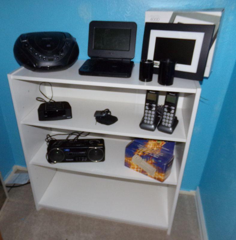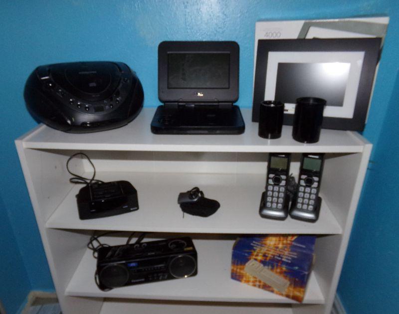 DIGITAL FRAME, PORTABLE DVD PLAYER, PORTABLE STEREO, 2 LENSES, 2 HANDSET CORDLESS PHONES AND WHITE BOOK SHELF