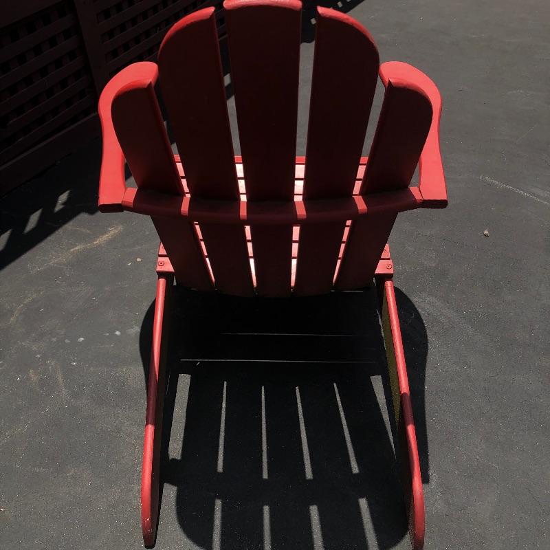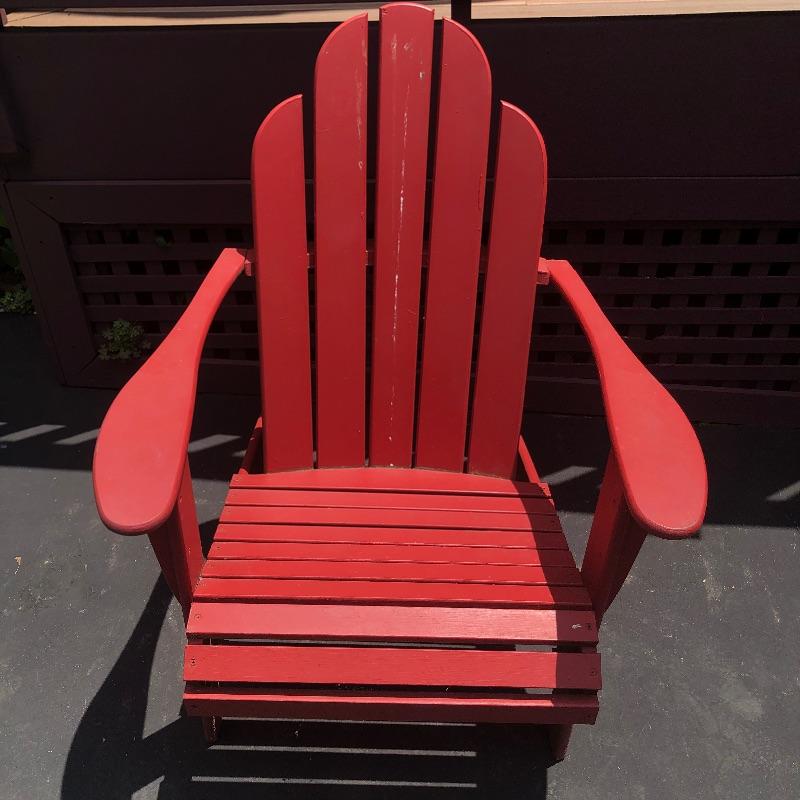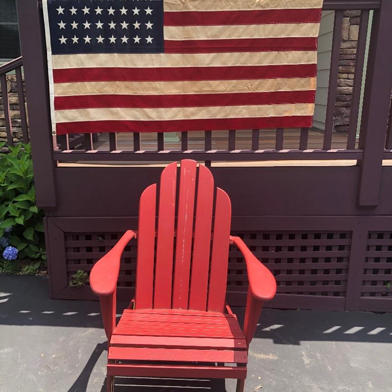 Lot includes a red adirondak chair and an American Flag. Chair is very sturdy. Flag has some staining.