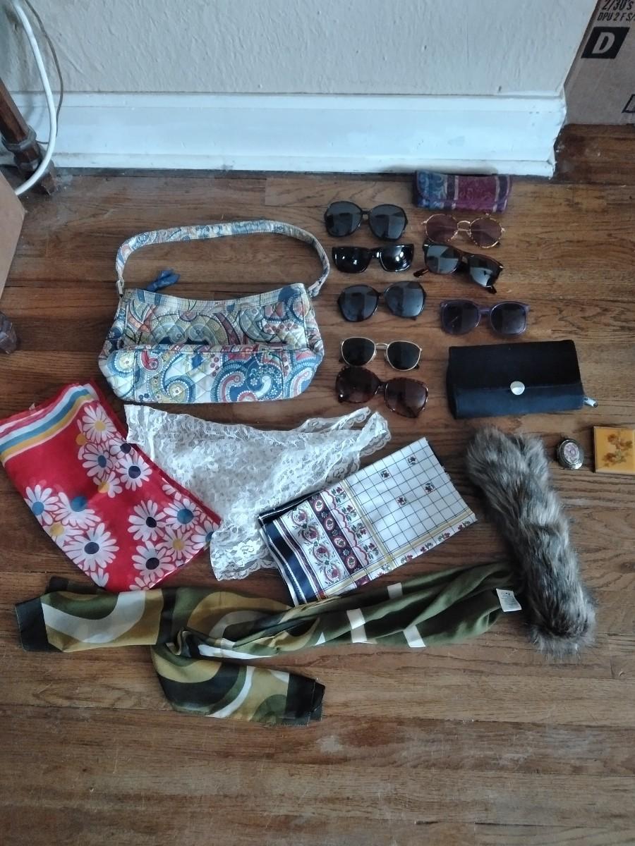 VERA BRADLEY PURSE, SEVERAL PAIRS OF SUNGLASSES, SOME SCARVES, FUR COLLAR, AND A NICE LOCKET