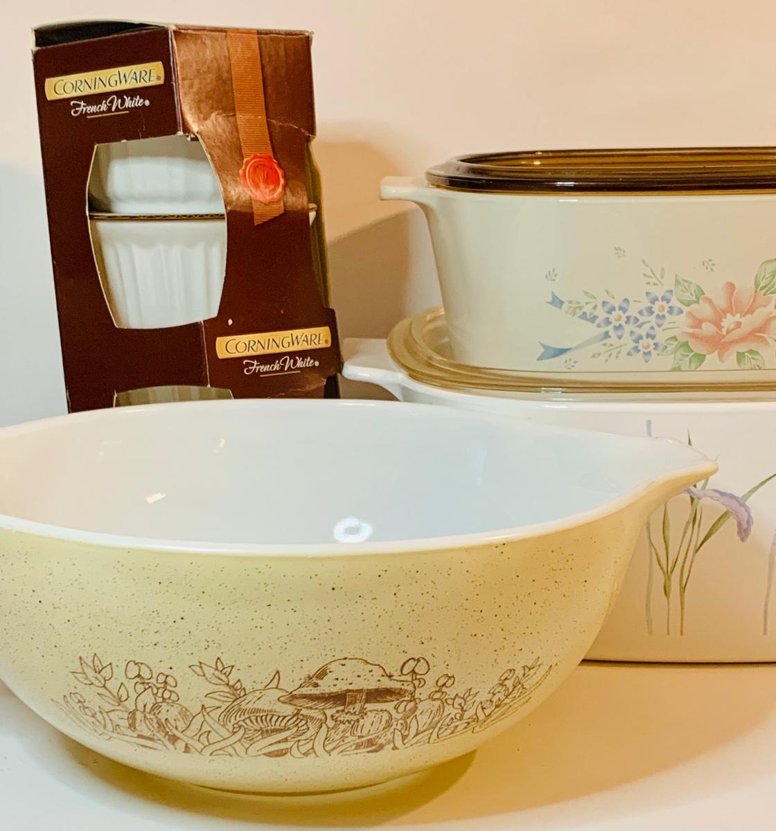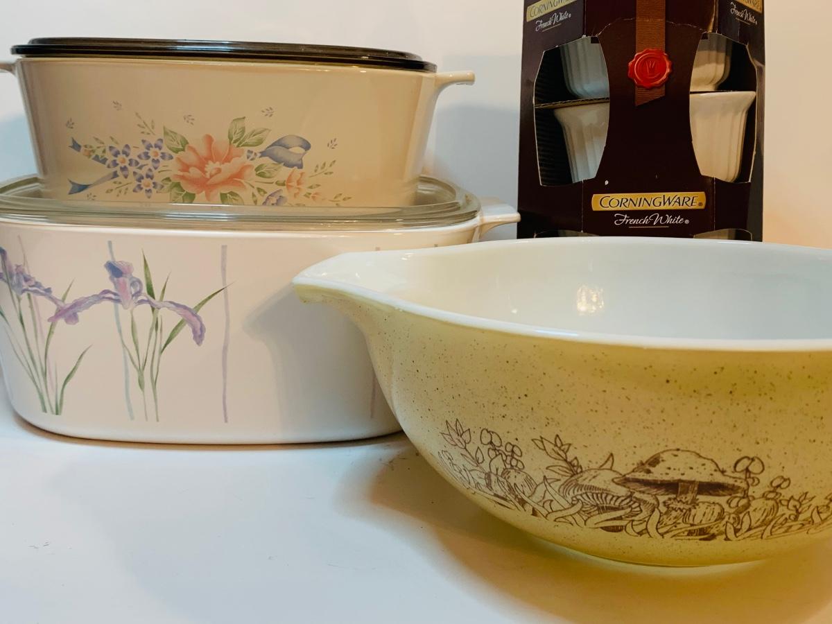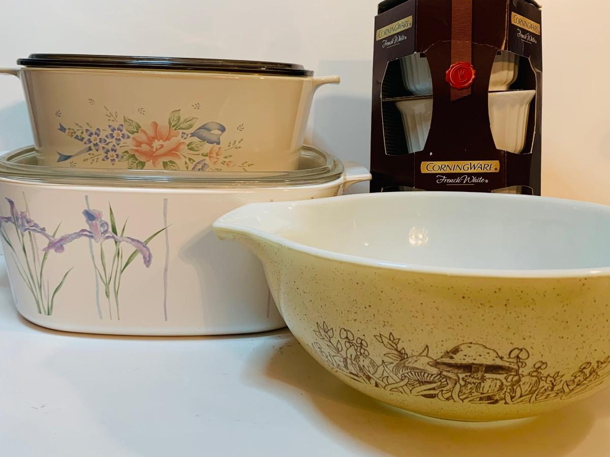 Lot 182: NIB Corning Ware Ramekins, Vintage Mushroom Pyrex & Corning Ware Casseroles