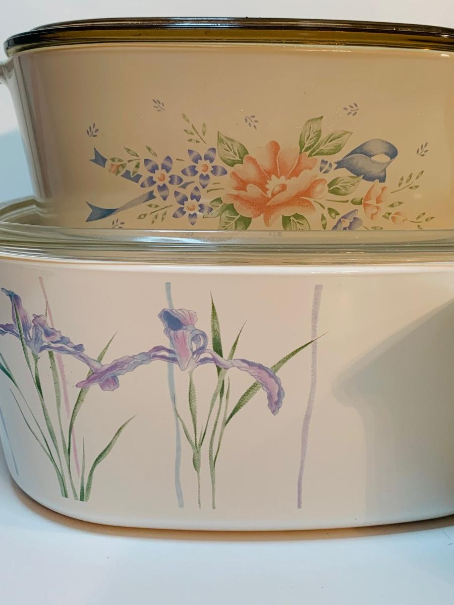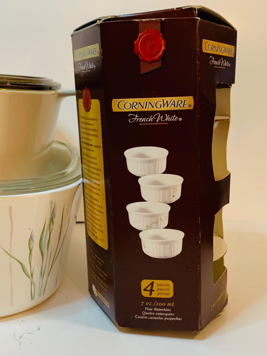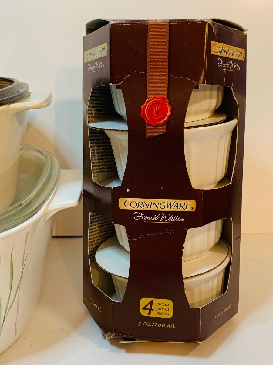 Collectible and useable corning ware & Pyrex including New in Box Corning Ware French White 7-ounce Ramekins.
