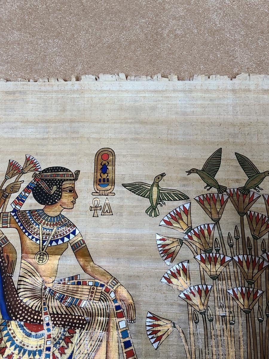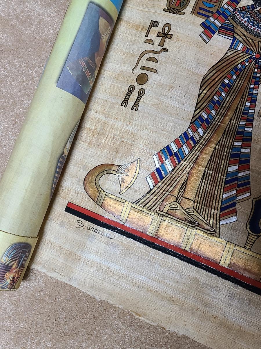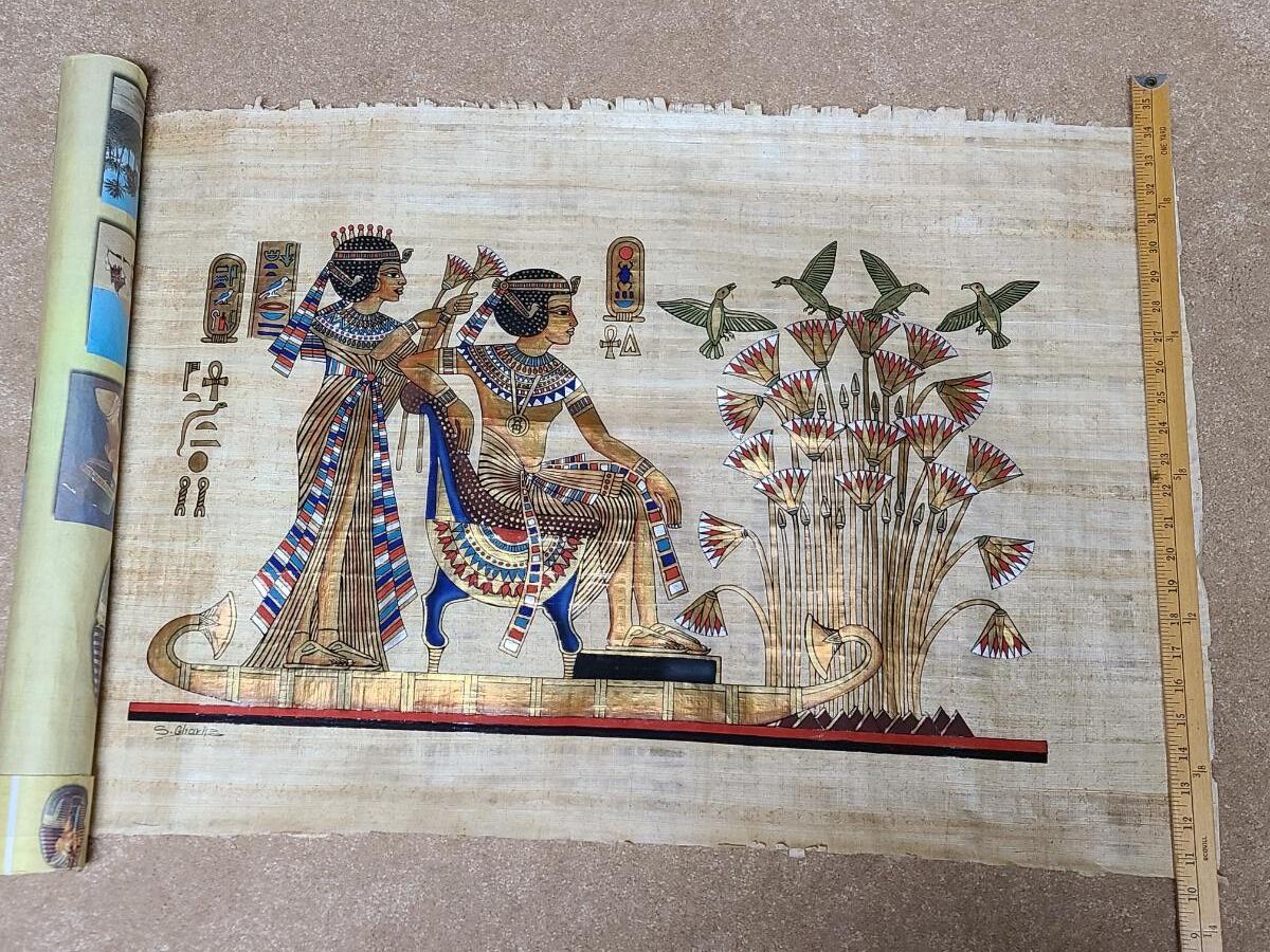 Large, artist signed painting on papyrus. The back has a marking on it, that looks like it reads the Papyrus Institute with an address. This came rolled in a tube as seen in the pictures. Would look amazing framed in black or gold! Please see all pictures as they are the best representation of the items. The pictures show condition, measurements if taken, and what is included in the lot. Due to the large amount that we photograph and the time frame, we are not always able to take measurements. All items unless noted, are pre-owned and have been used. If you purchased furniture, you must bring help. We do not allow one person to carry large furniture out on their own. Bring help, tools and a truck for the safety of our client’s homes, and your personal safety. Company policy. Thank you.