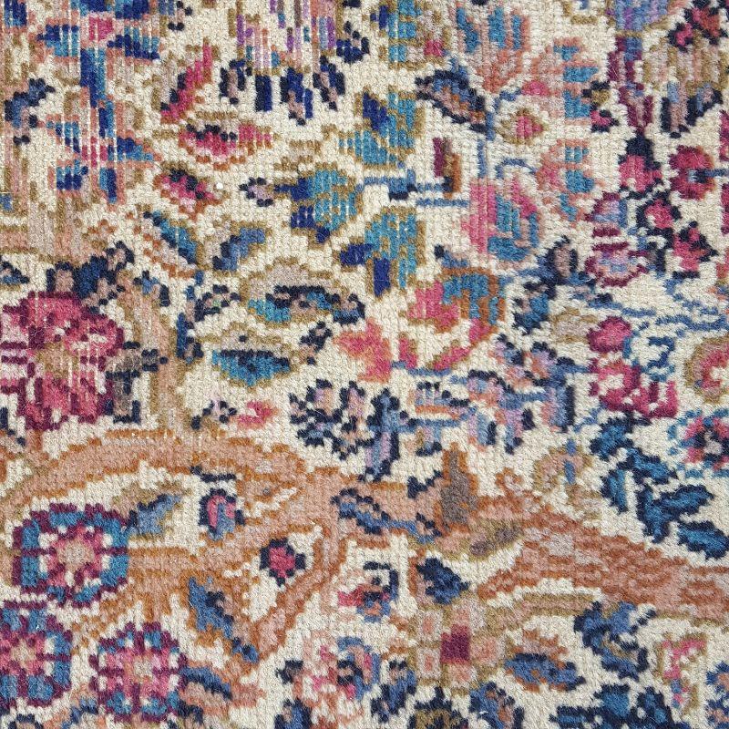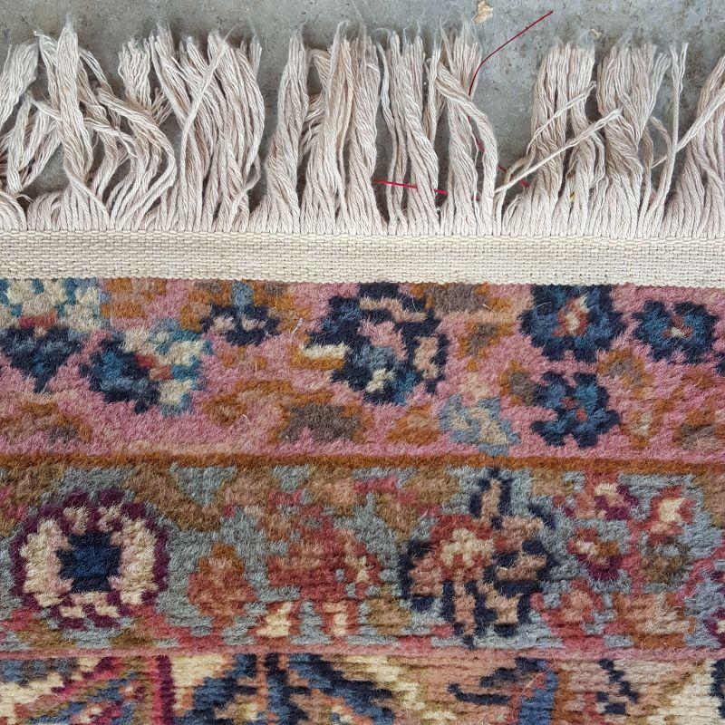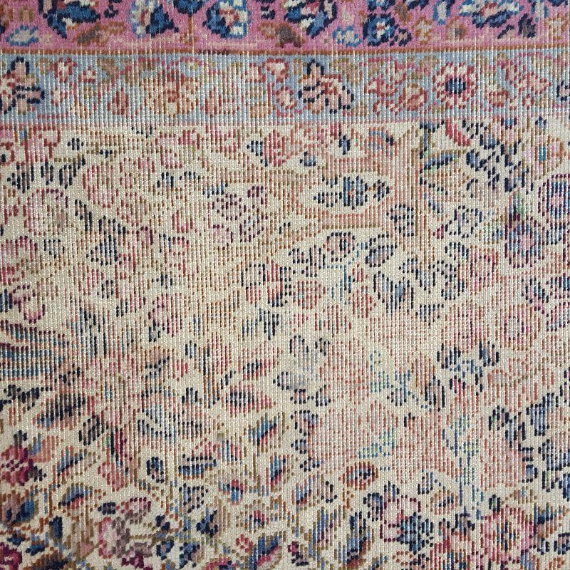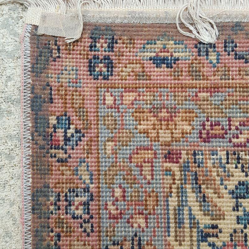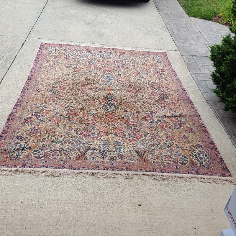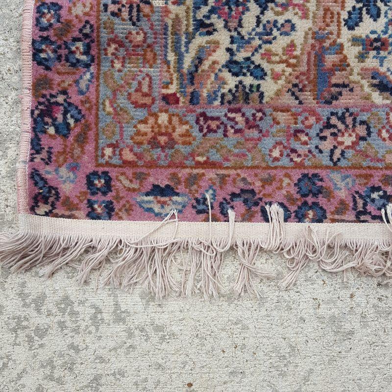This beautiful rug measures 76" x 113" inches. This would be a great rug for a bedroom, family or dining room! Lovely pinks, red and blues in color. The rug has one spot that is worn down that is about 12x12 inches, see pictures. There is no tag to identify the manufacturer. No shipping.