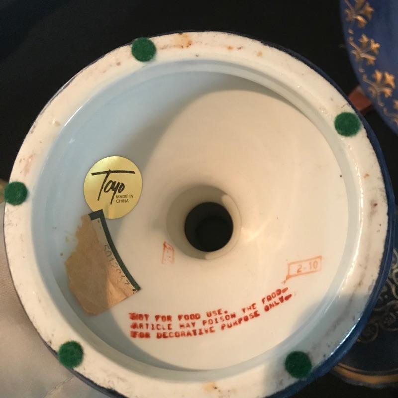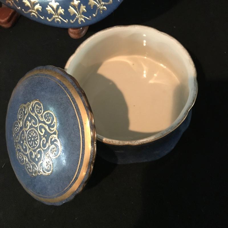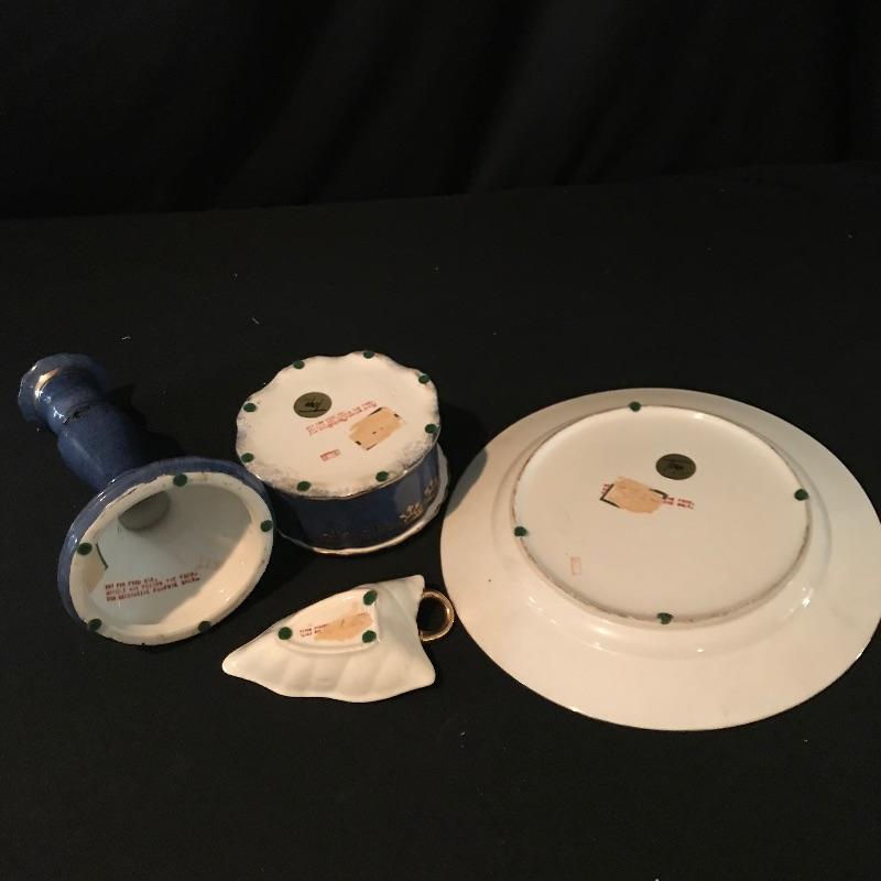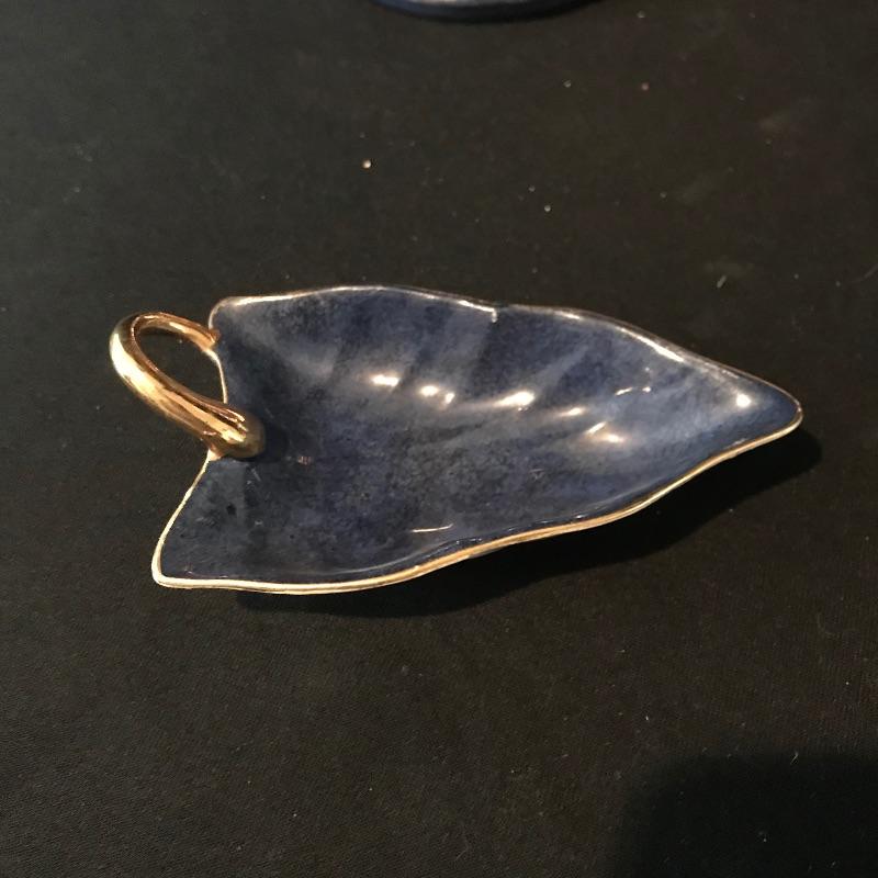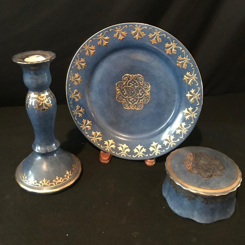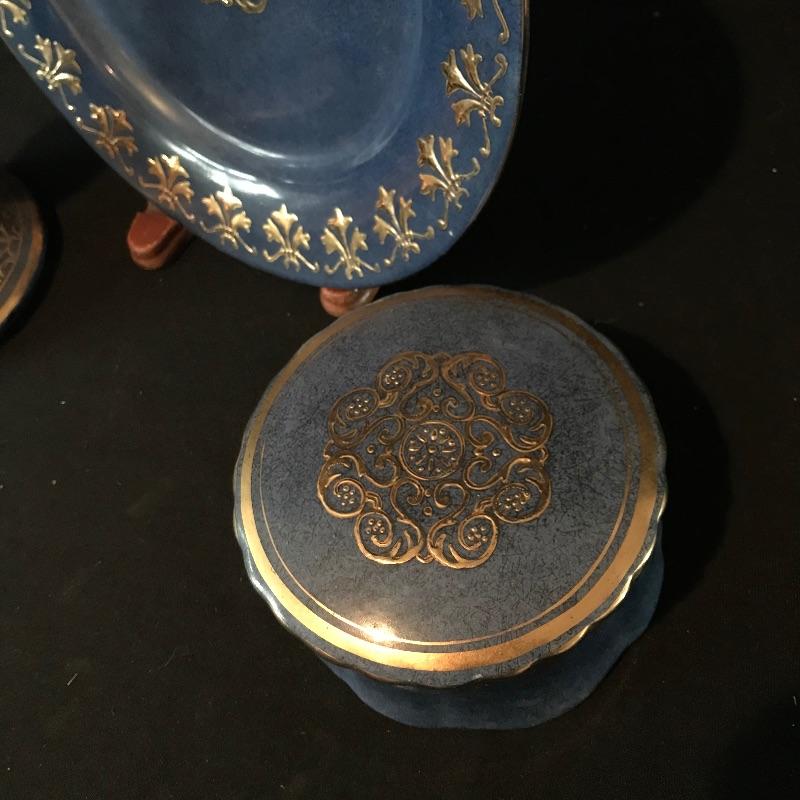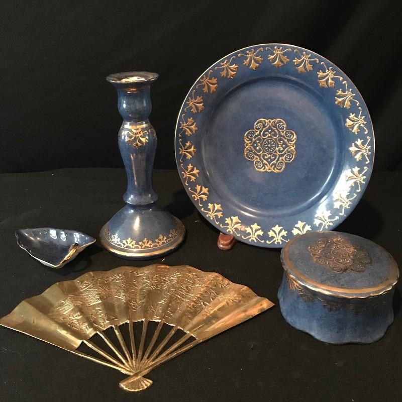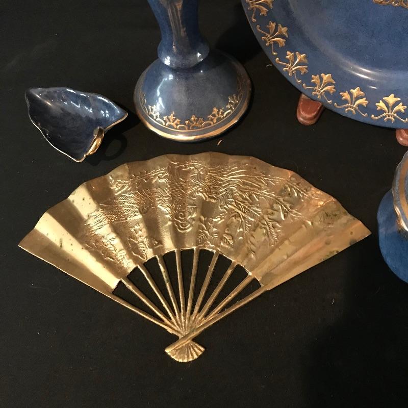 Stunning blue and gold Toyo China set with 9.75” plate, leaf bowl, round box and candle holder. Each piece has a gold rim in good shape and most have a lovely symmetrical designs. To complete the look, a brass fan measuring 11.25”. Fan has a couple age spots, see photos. Shipping available.