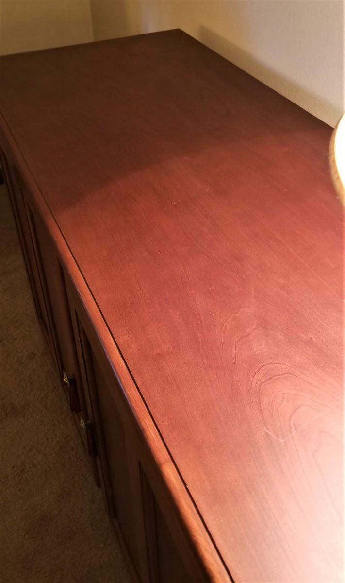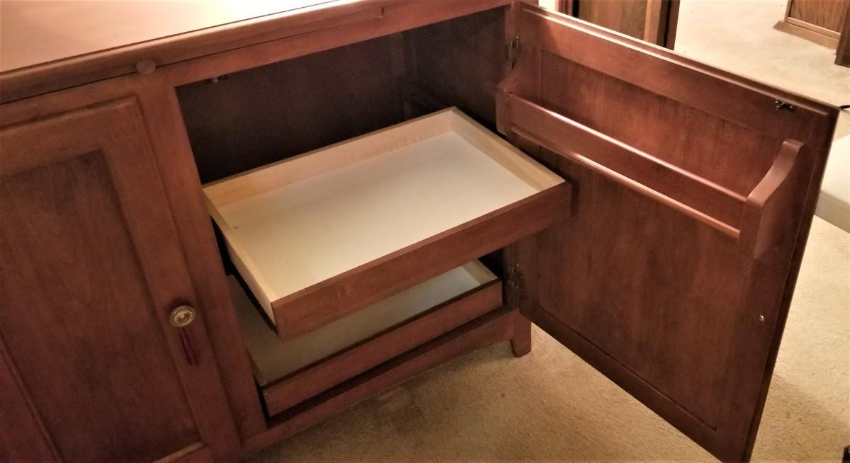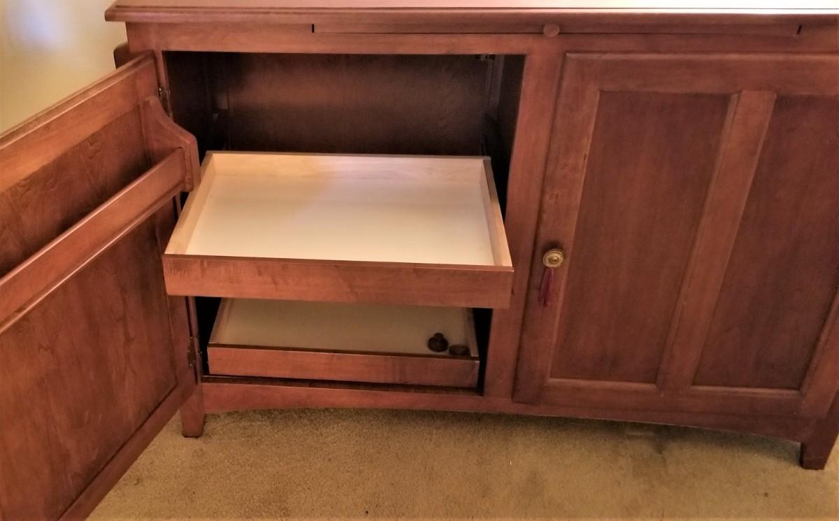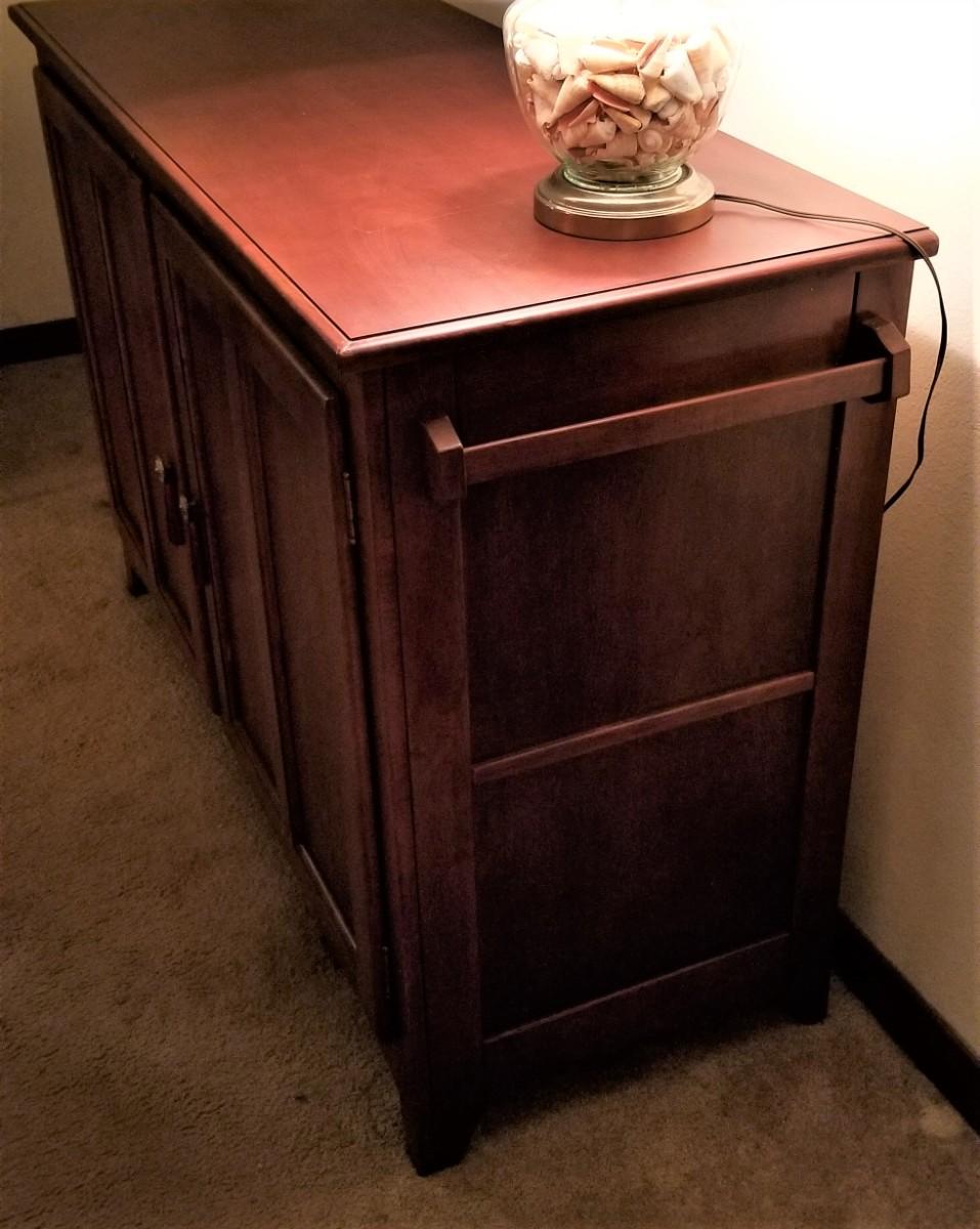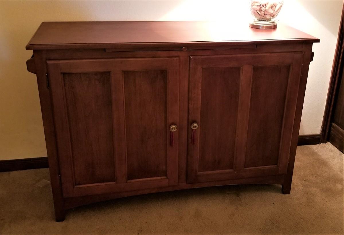 Purchased from Kirshman's Furniture in 2000 (we have the receipt) - cherry wood bar, laminated pull out shelves, towel racks on sides, clean, smooth action. Room for bottles, glasses, all sorts of bar stuff. Nice condition. Measures 35" tall, 52" across, 20" deep. Of course, it could be used as a regular sideboard - lots of storage here.