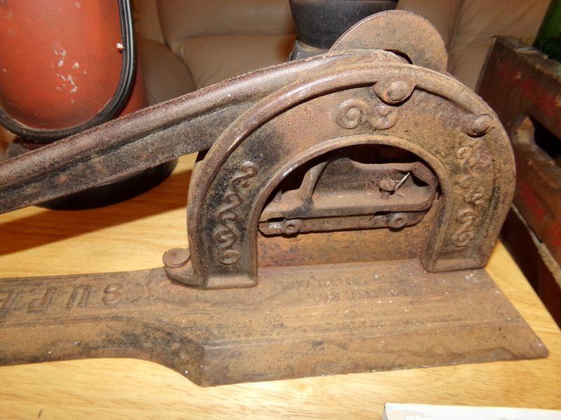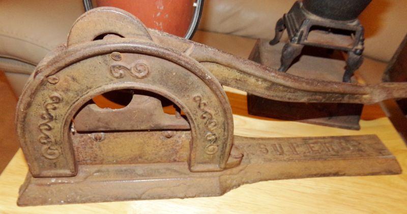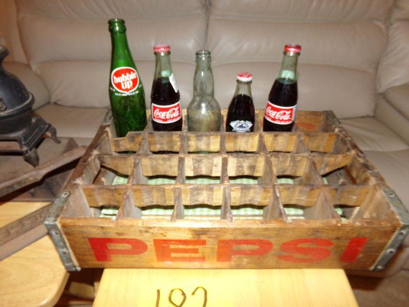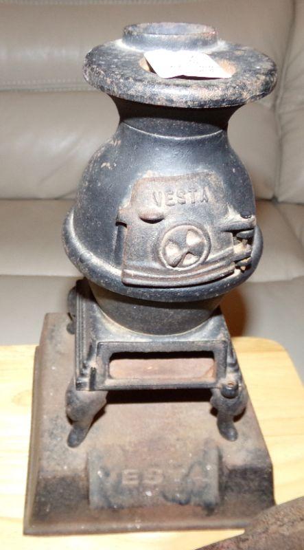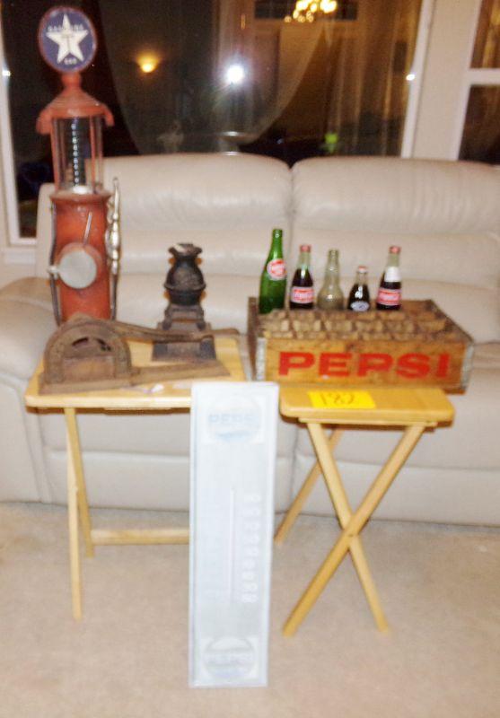 IRON SUPERB CIGAR CUTTER, VESTA CAST IRON SALESMAN SAMPLE WOOD OVEN, PEPSI CRATE W/FEW GLASS BOTTLES
