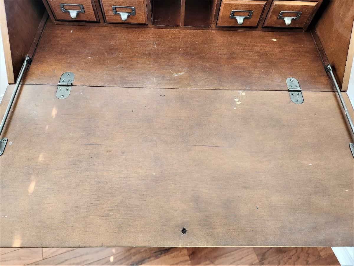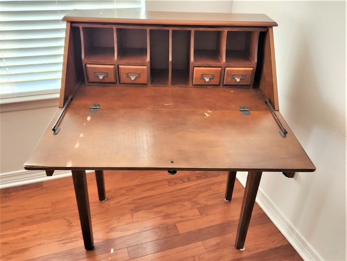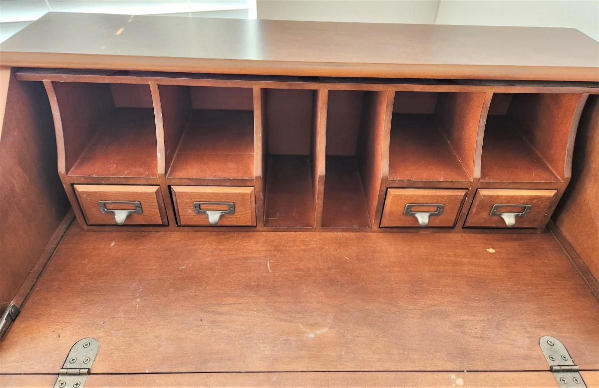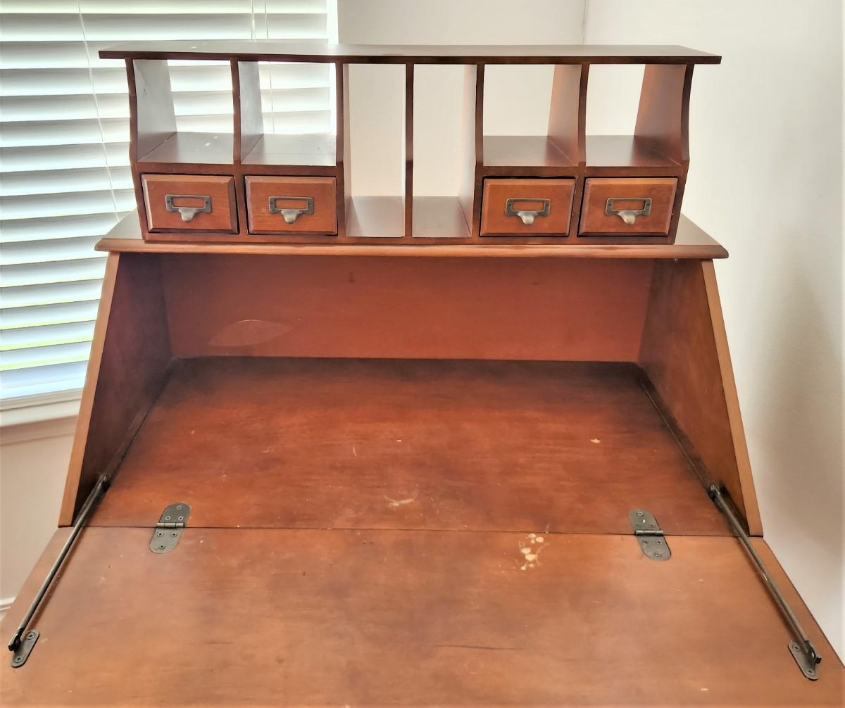 Interesting contemporary drop front desk - no maker noted. Inner compartments come out - 1 drawer. Used condition. 33" across, 17" deep, 41.5" tall.