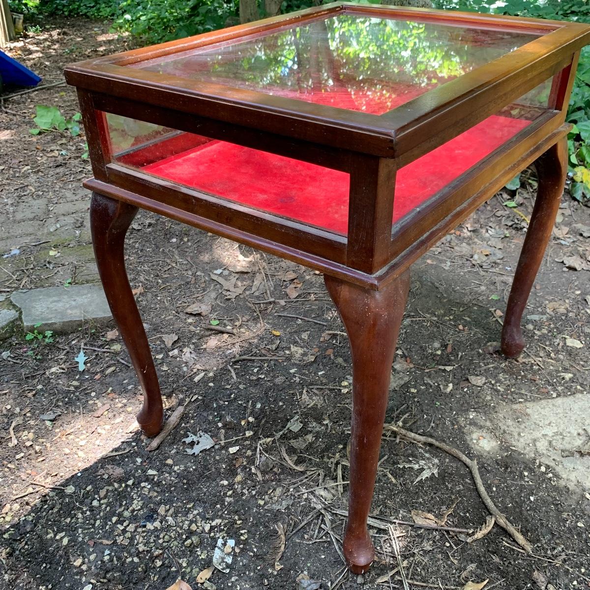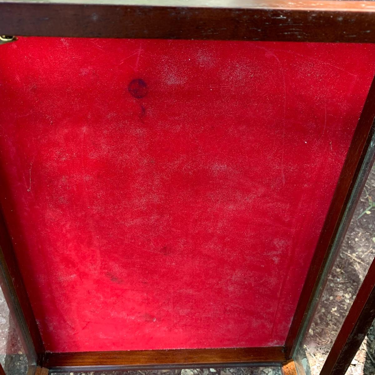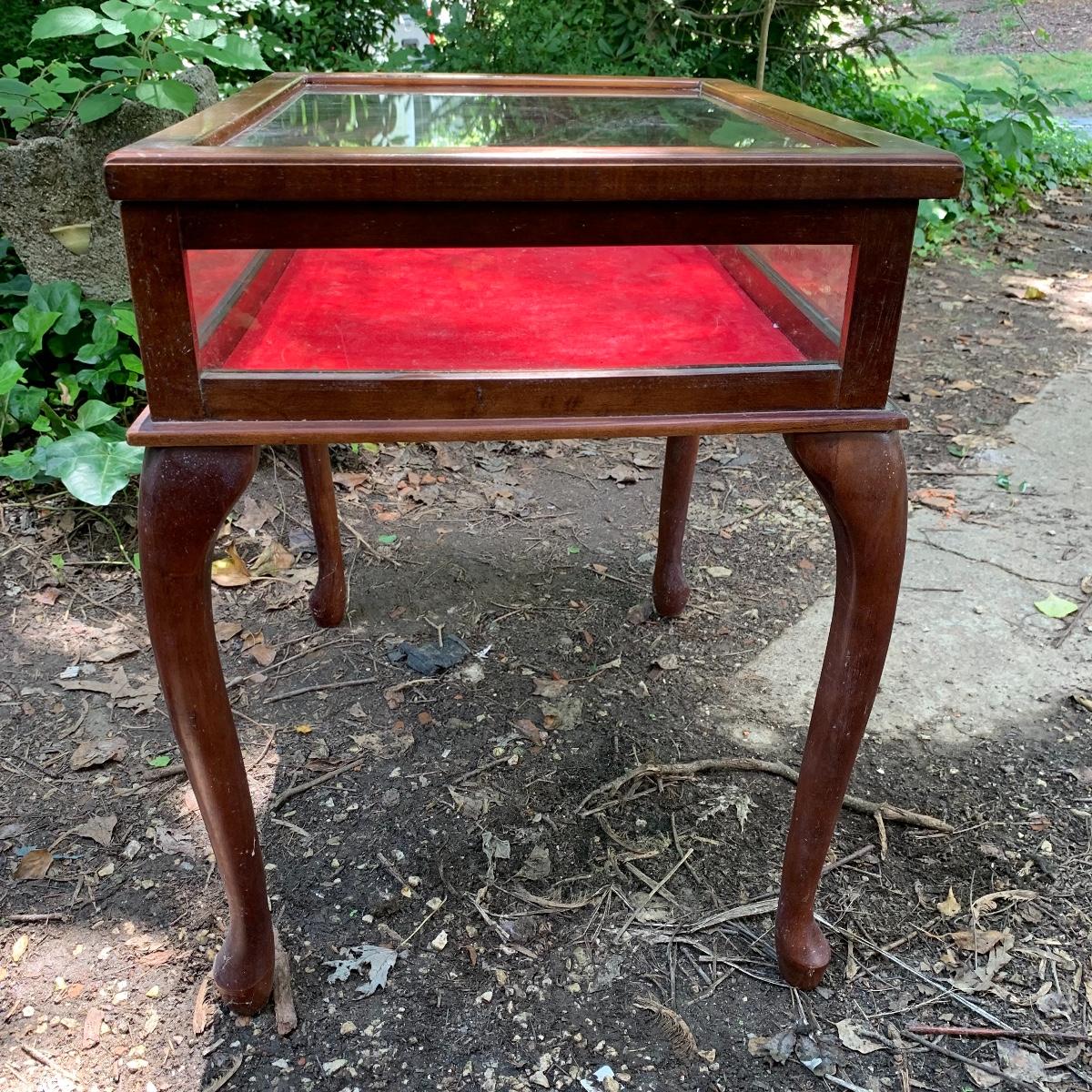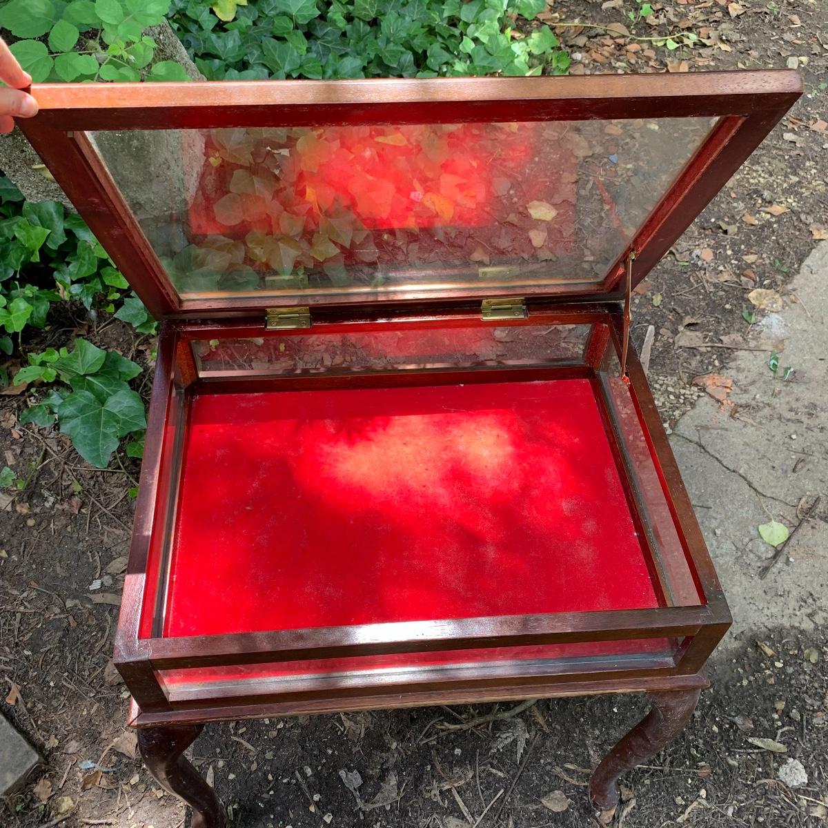 This is a unique curio table perfect for displaying your treasures & collectibles. Its previous owner displayed seashells in it and you’ll find remnants of seashell dust inside. It has wooden legs and a wooden frame, a glass top and glass sides, and on the inside there is a red velvety lining. The tabletop opens and has one hinge on the right side. It has accumulated some dust over the years and would benefit from a good cleaning. The dimensions of the table are 18” x 23” x 24”. Local pick up