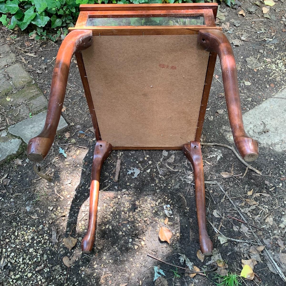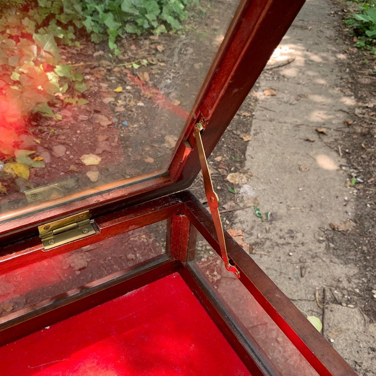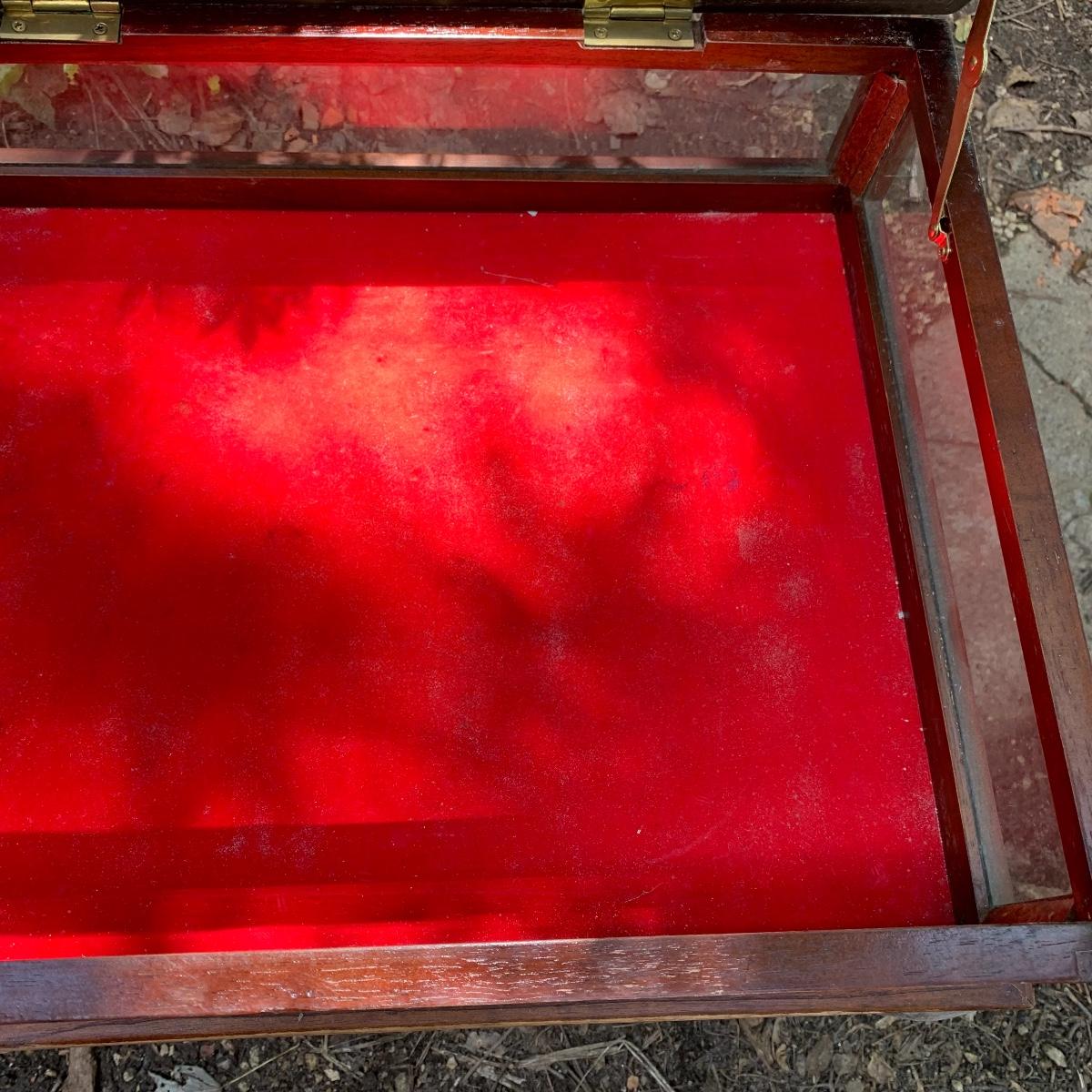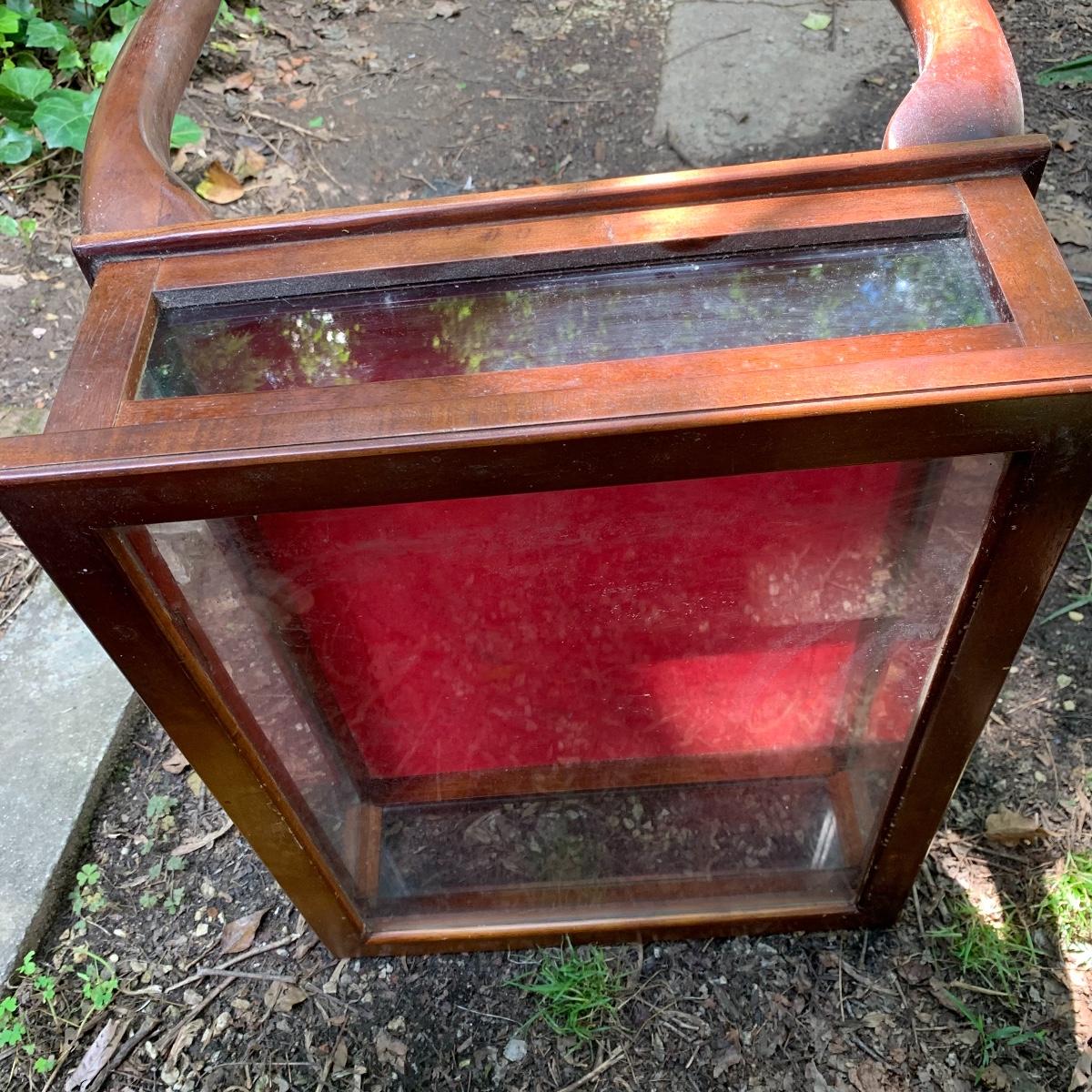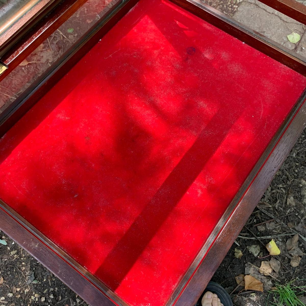This is a unique curio table perfect for displaying your treasures & collectibles. Its previous owner displayed seashells in it and you’ll find remnants of seashell dust inside. It has wooden legs and a wooden frame, a glass top and glass sides, and on the inside there is a red velvety lining. The tabletop opens and has one hinge on the right side. It has accumulated some dust over the years and would benefit from a good cleaning. The dimensions of the table are 18” x 23” x 24”. Local pick up