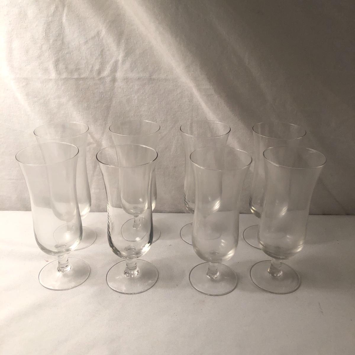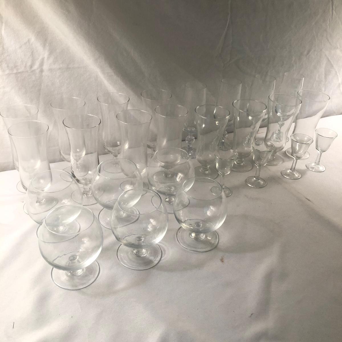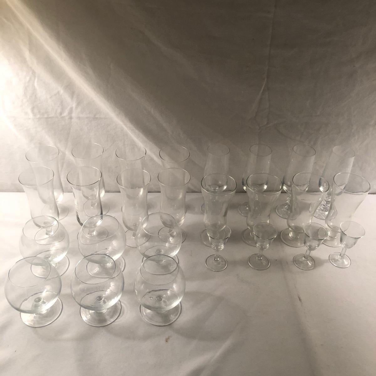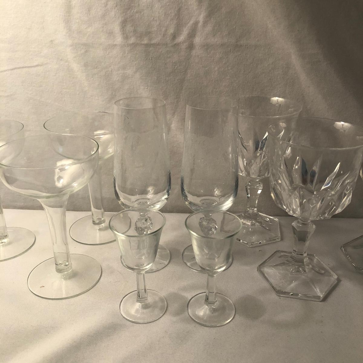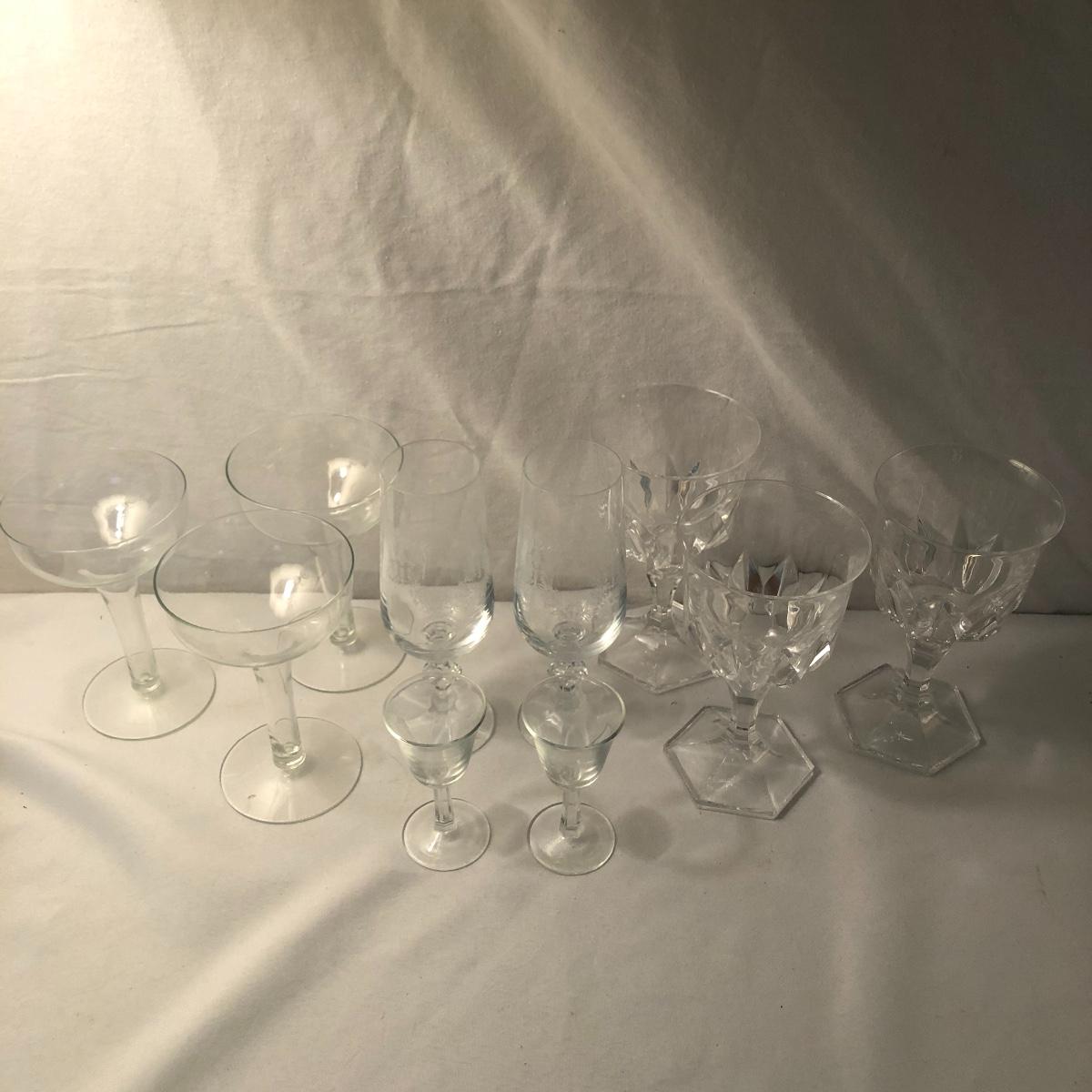 If expanding your glassware collection is your goal, this lot has just what you need. Seven short-stemmed clear glasses that have a curved body begin this lot. Eight glasses are originally pictured due to the fact that one was found broken after. Four glasses are very similar in style to the first eight and four small sampling glasses are included. Next is a set of six round bodied glasses with short stems, five cocktail glasses, and five stemmed geometric glasses. Lastly are four glasses with floral designs around the body and decorative stems. This variety of stemware is great for any hosting.