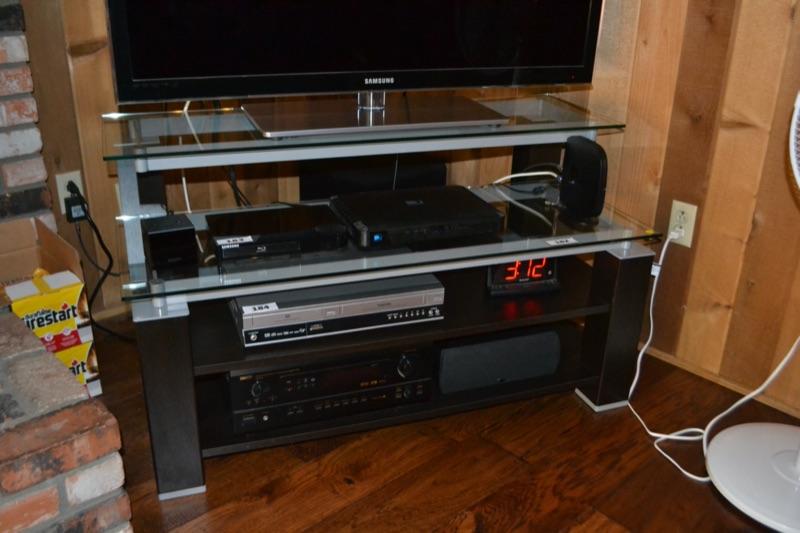 GLASS TV/MEDIA STAND. YOU ARE BIDDING ON STAND ONLY IN THE LOT, OTHER ITEMS SOLD IN DIFFERENT LOTS