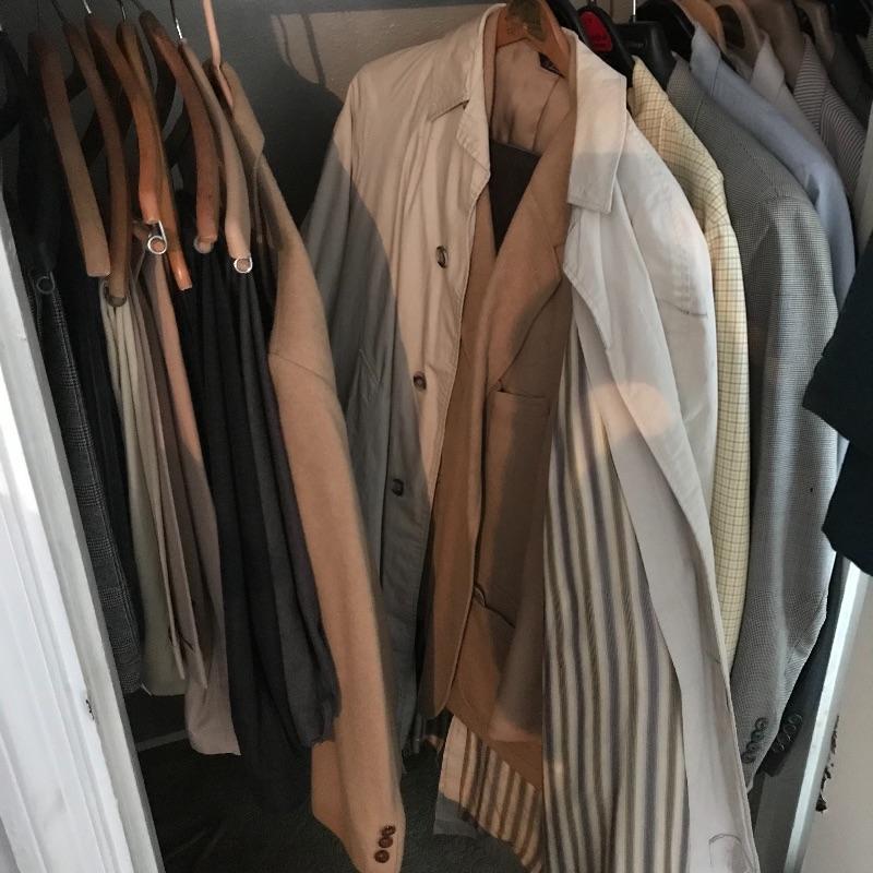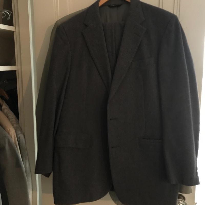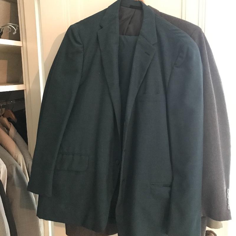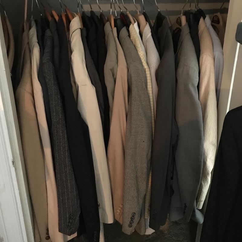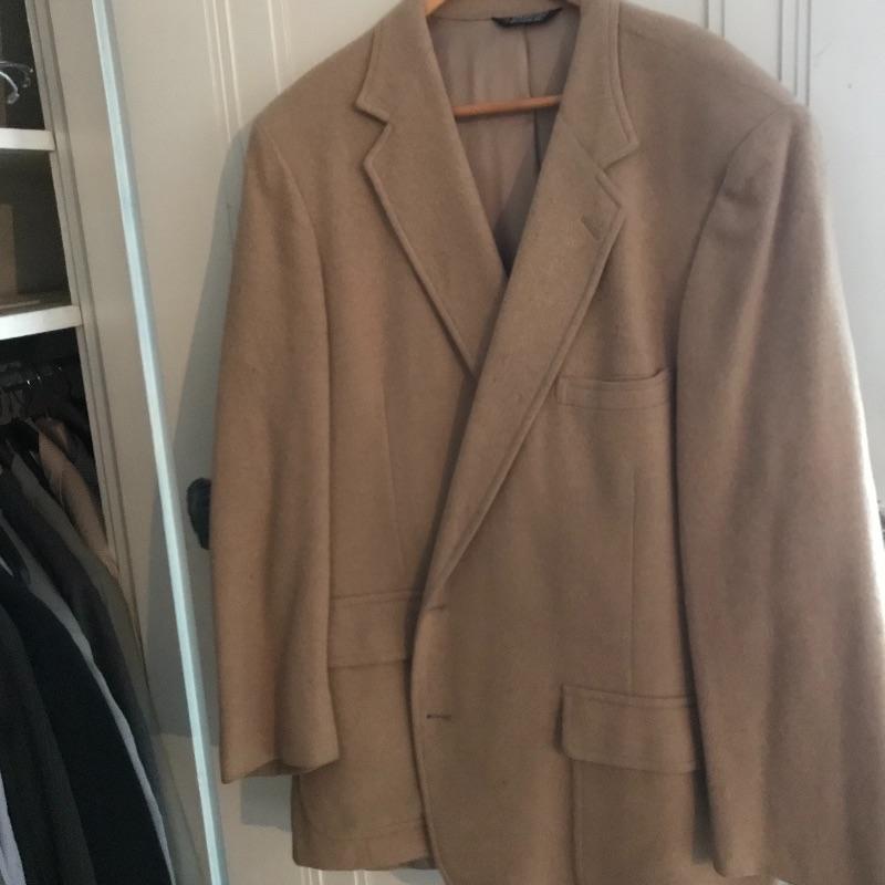 Over thirty articles of men’s business wear! Lot includes numerous suits, pants, and sport jackets for any occasion! Colors and fabrics from across the spectrum. Most are tailored and sizes are unknown, but they appear to be large to extra large sizes. Collection also includes not one, but two camel hair jackets! Stains can be found, it is possible they can be removed by a simple dry cleaning. Only a few labels are noted in photos, please come to the preview to see them all! No shipping.