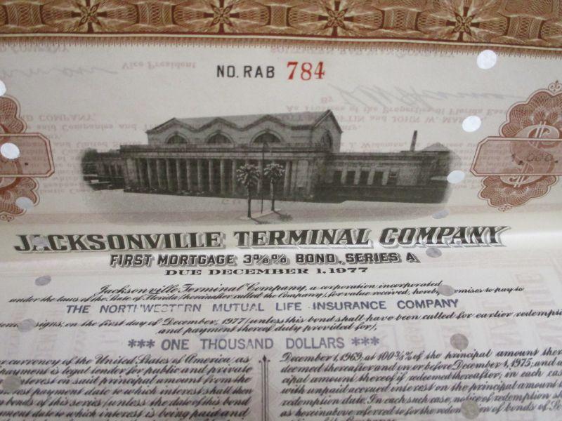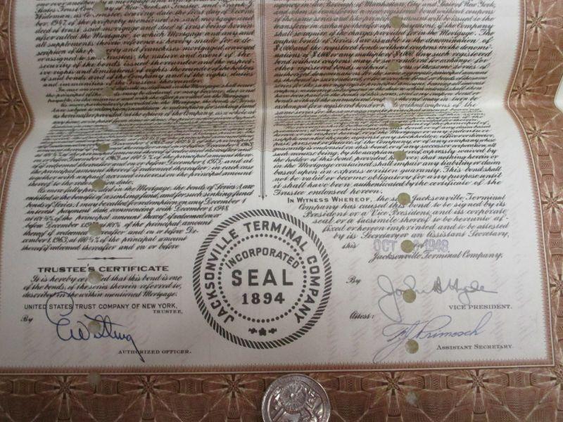 Lot 182 - Jacksonville Terminal Company 1948 Florida $1000 CSX Bond Certificate