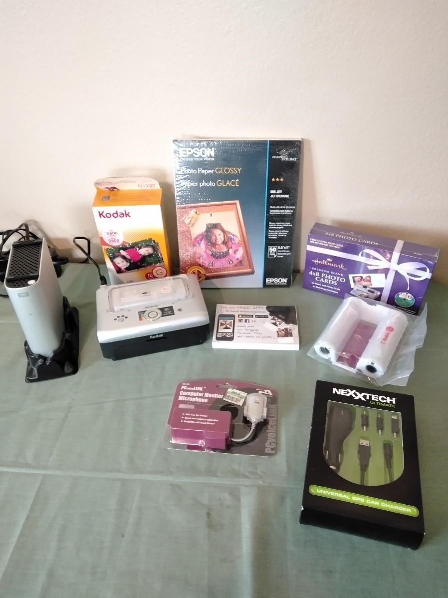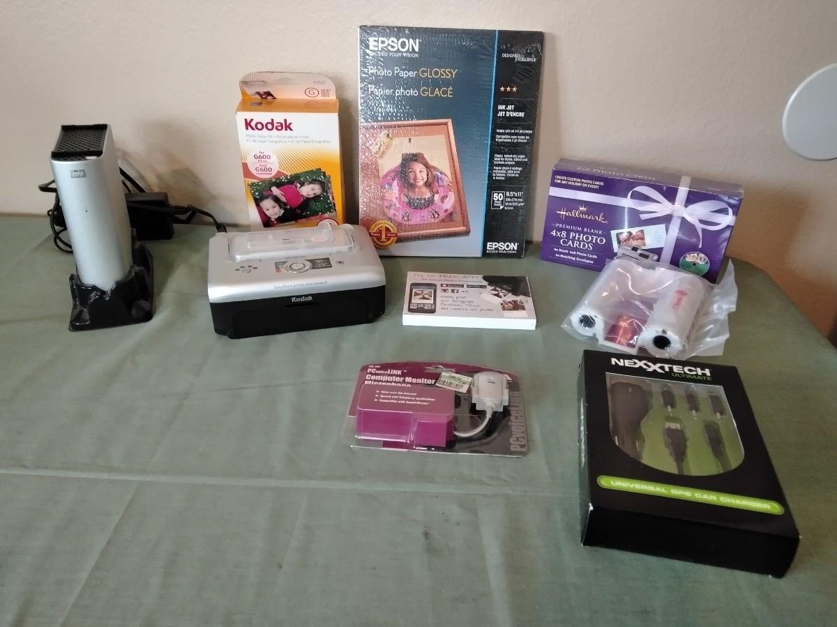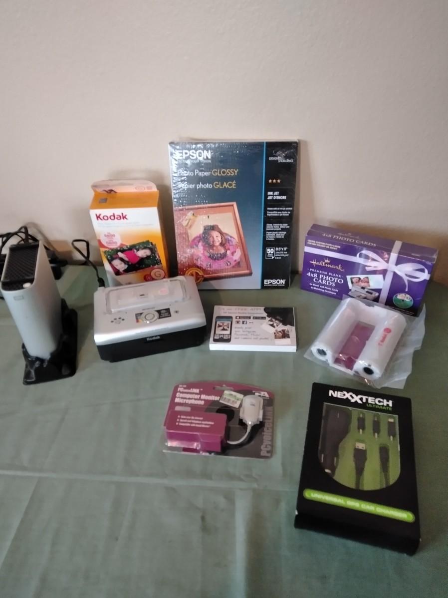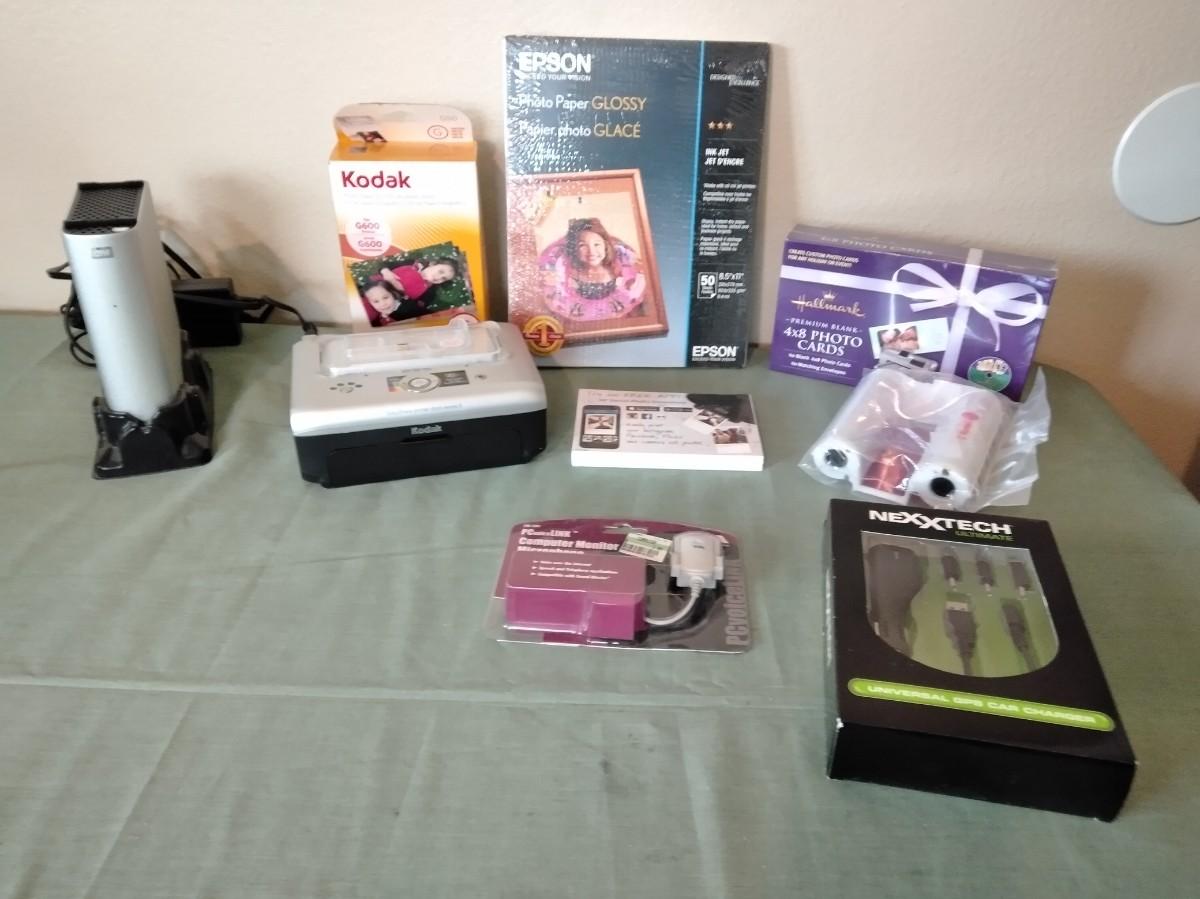 KODAK PRINTER WITH PAPER, ASSORTMENT OF ACCESSORY CABLES, AND MORE