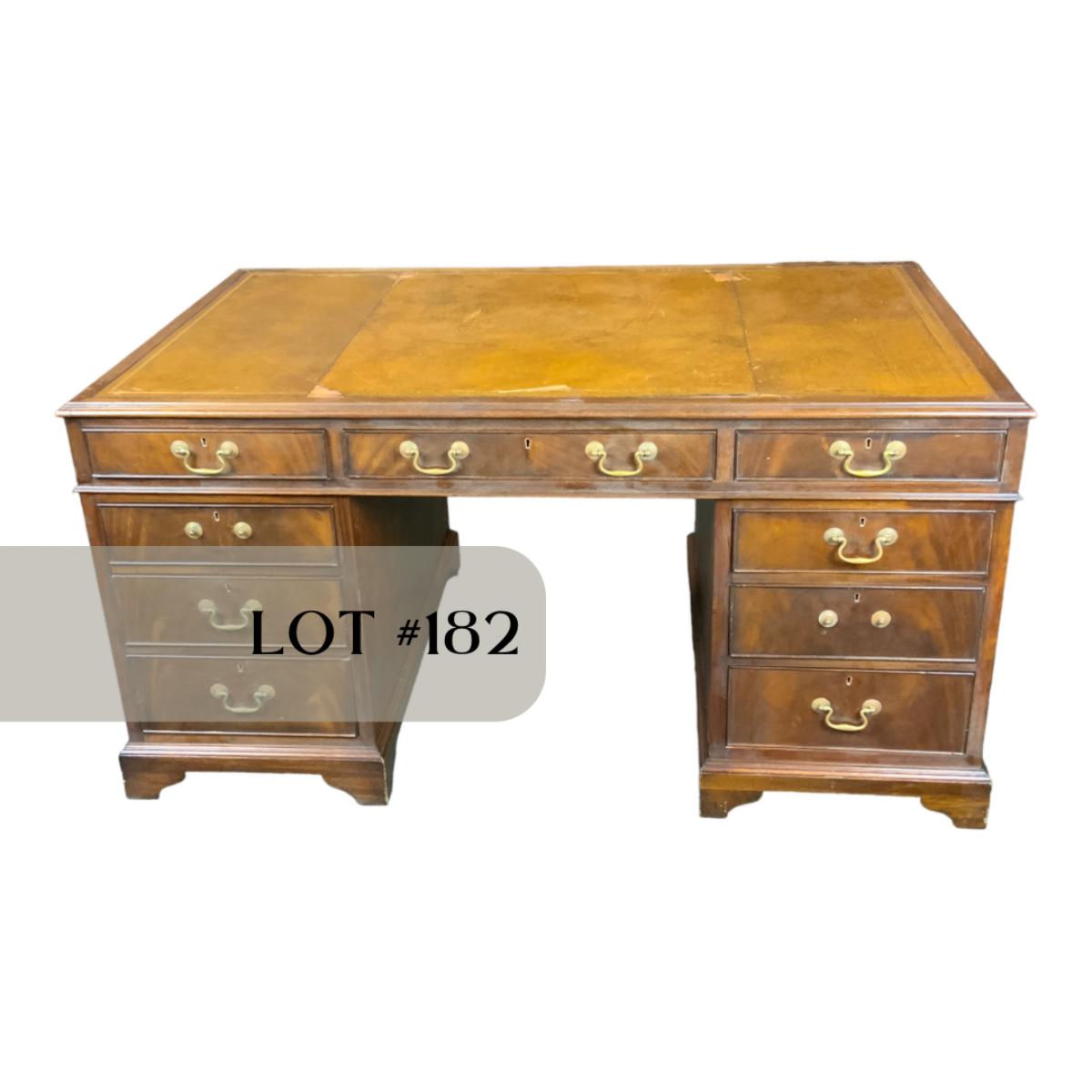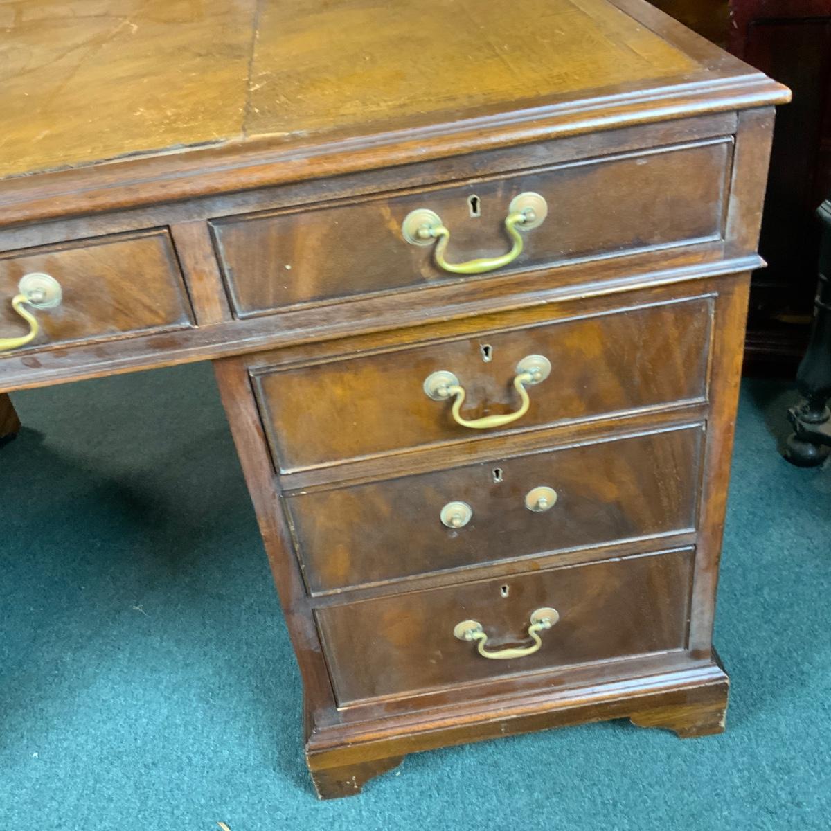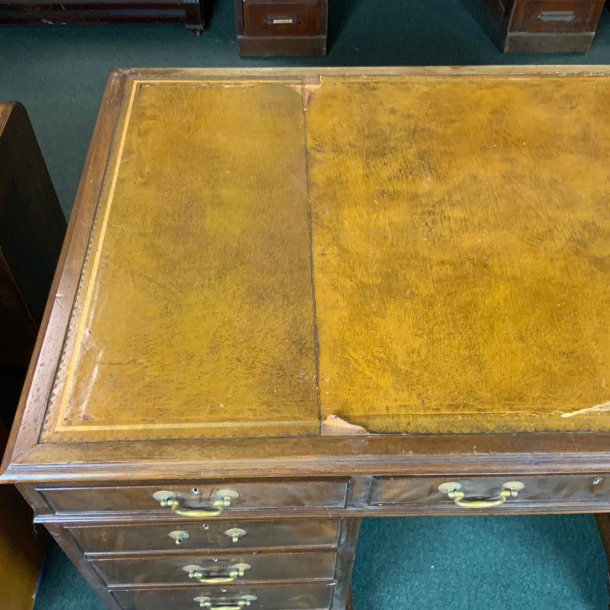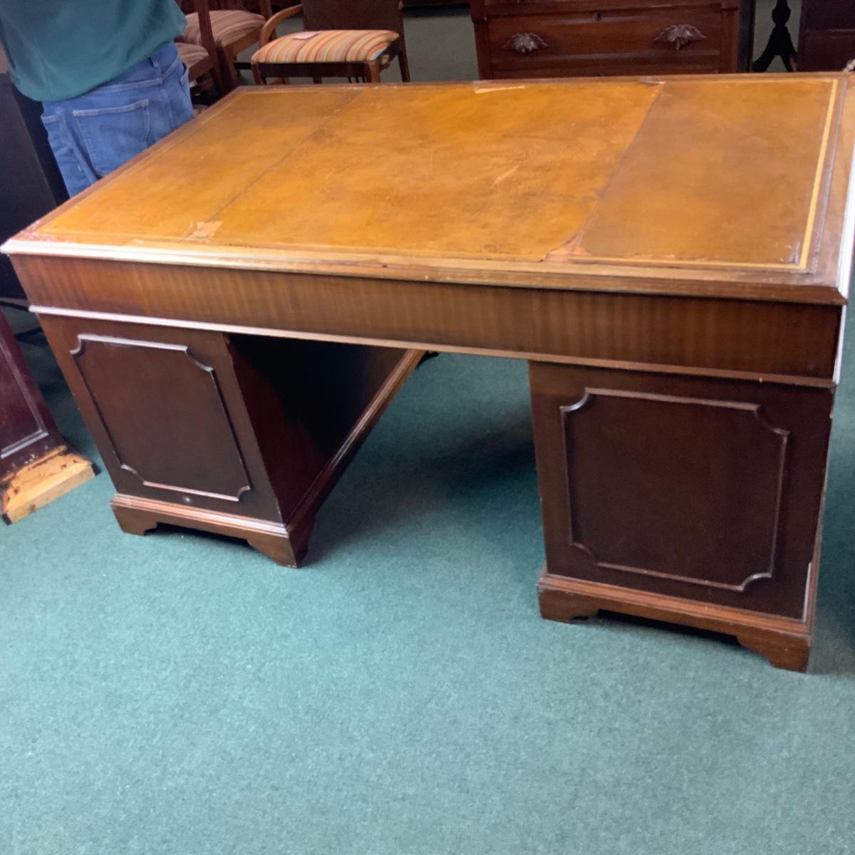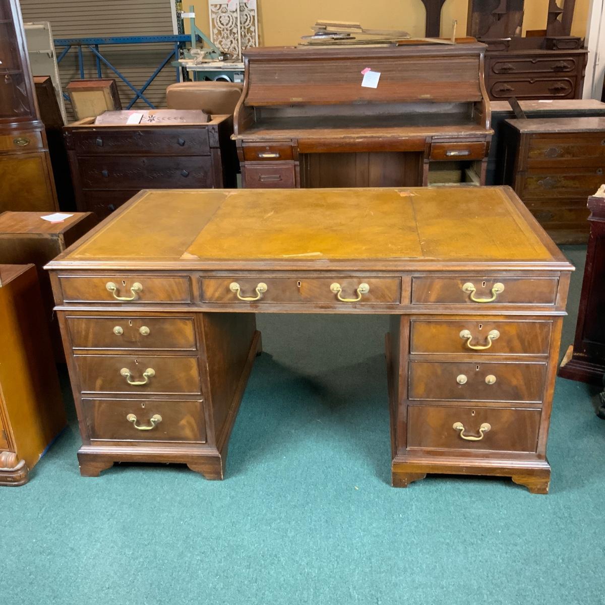 Leather-Top Executive Desk. Leather needs to be repaired. Or you could have glass cut and just appreciate the rustic look. //::\\ Please see photos for details and condition. No attempt has been made to hide any imperfections. All items listed in this auction are warehouse items, and need to be cleaned. A majority of the items need restoration as well. All items are sold AS IS and WITHOUT GUARANTEE. If you are uncertain about an item, DO NOT BID. Due to the nature of this online auction in-person inspection is HIGHLY recommended. All Sales are FINAL. Pick Up Times are FIRM. Please confirm with your own schedule that you can pick up in the scheduled times listed in the Terms and Conditions. Any questions please message the auctioneer. DO NOT Contact The Harp Gallery.