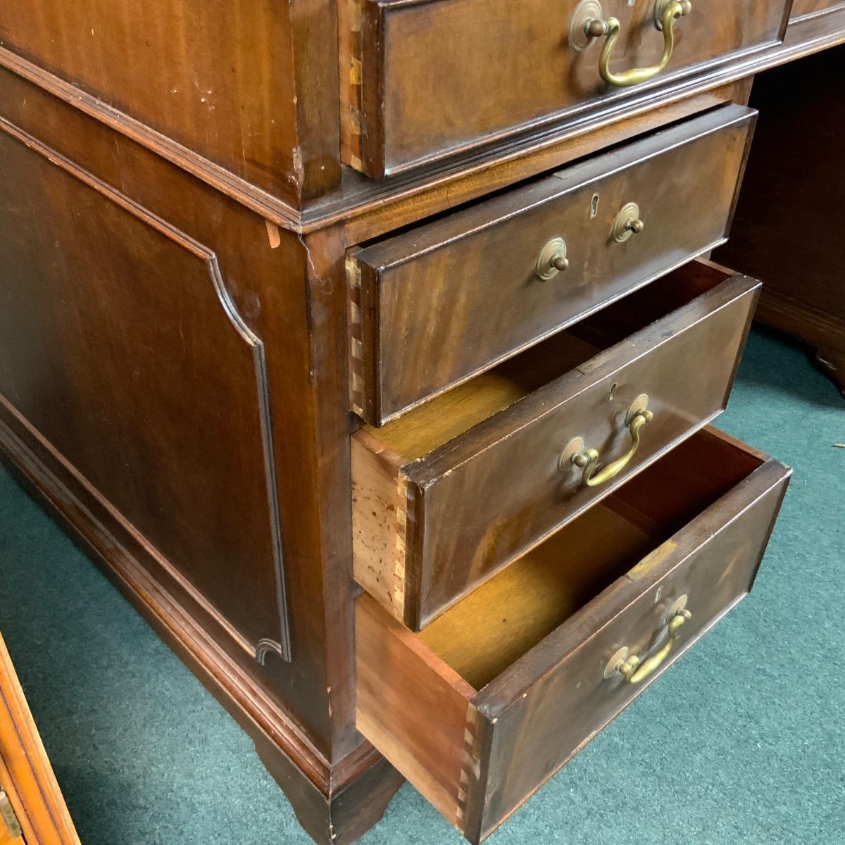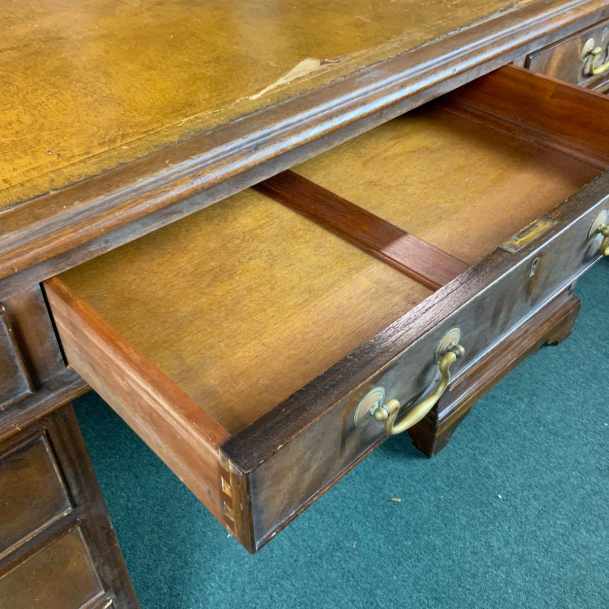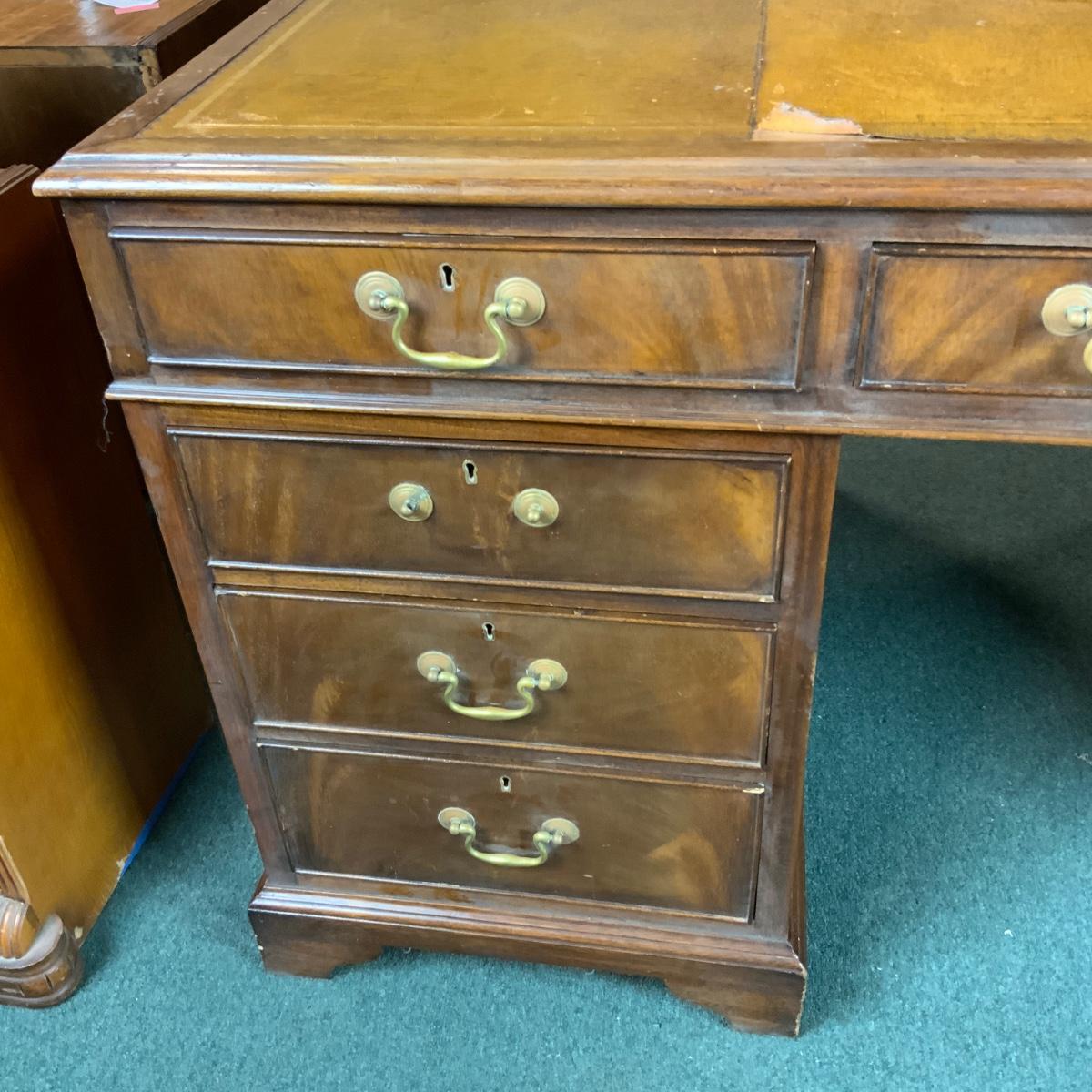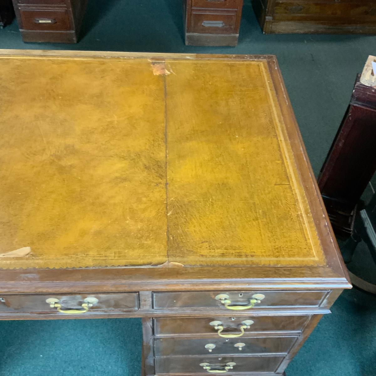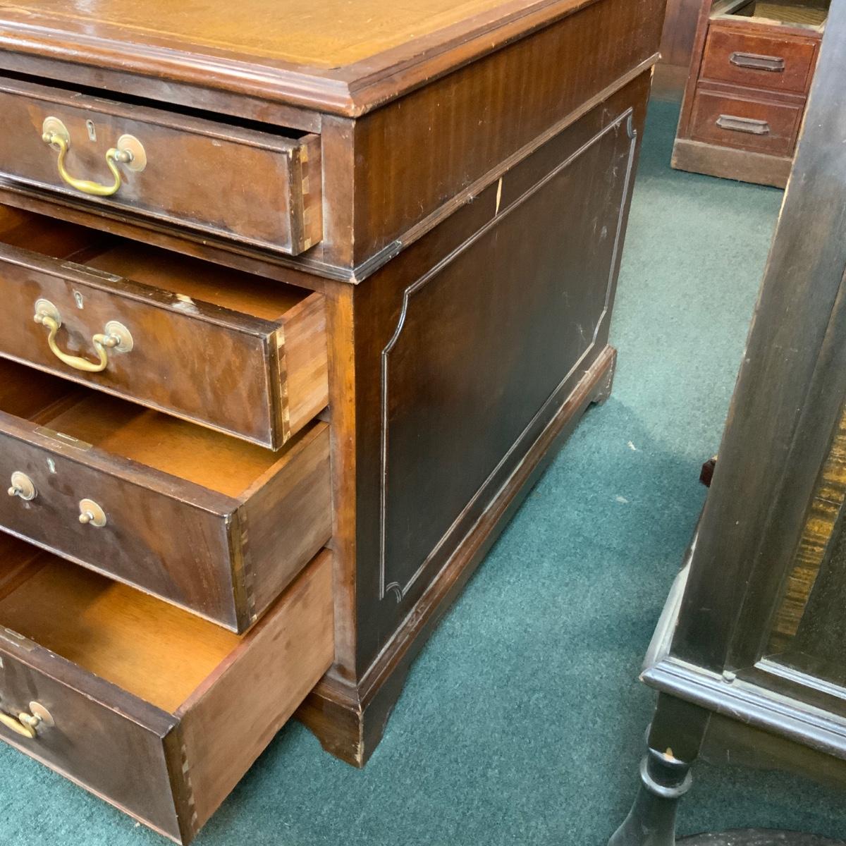 Leather-Top Executive Desk. Leather needs to be repaired. Or you could have glass cut and just appreciate the rustic look. //::\\ Please see photos for details and condition. No attempt has been made to hide any imperfections. All items listed in this auction are warehouse items, and need to be cleaned. A majority of the items need restoration as well. All items are sold AS IS and WITHOUT GUARANTEE. If you are uncertain about an item, DO NOT BID. Due to the nature of this online auction in-person inspection is HIGHLY recommended. All Sales are FINAL. Pick Up Times are FIRM. Please confirm with your own schedule that you can pick up in the scheduled times listed in the Terms and Conditions. Any questions please message the auctioneer. DO NOT Contact The Harp Gallery.
