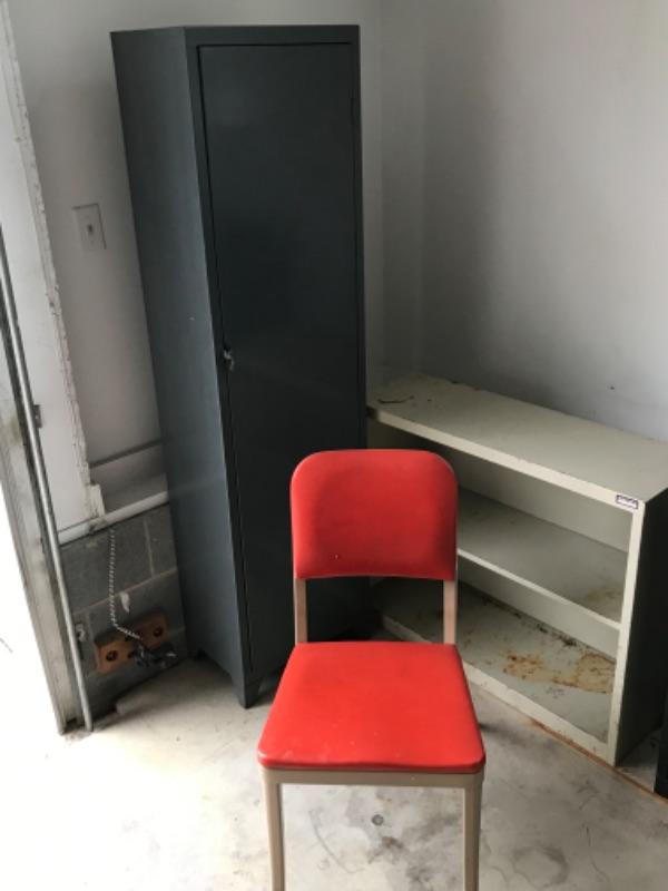 Tan metal shelf , tall metal cabinet with shelves, metal chair with orange vinyl seat