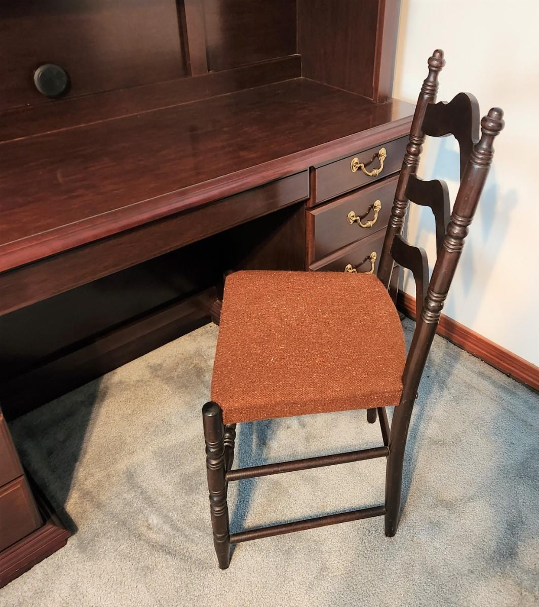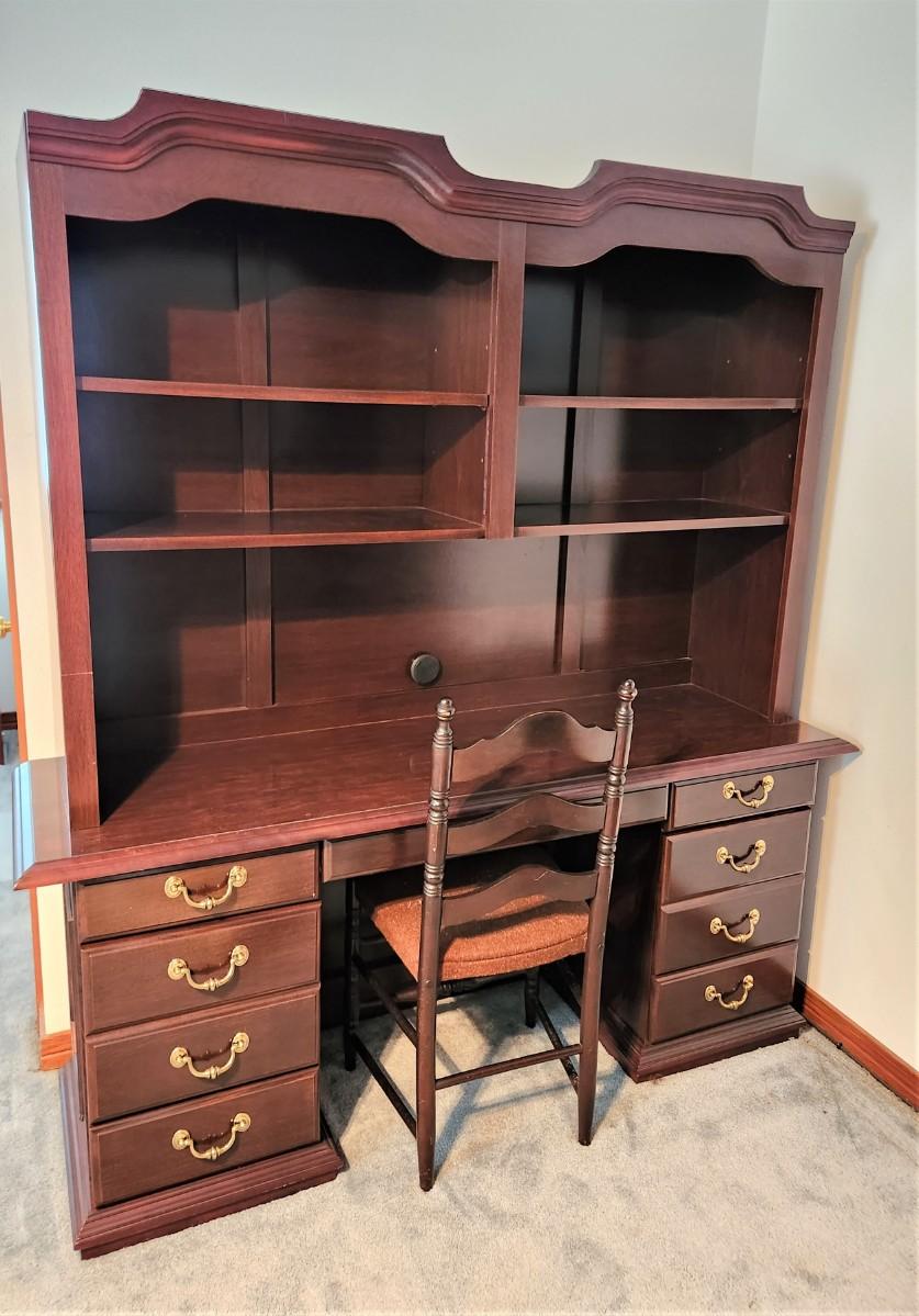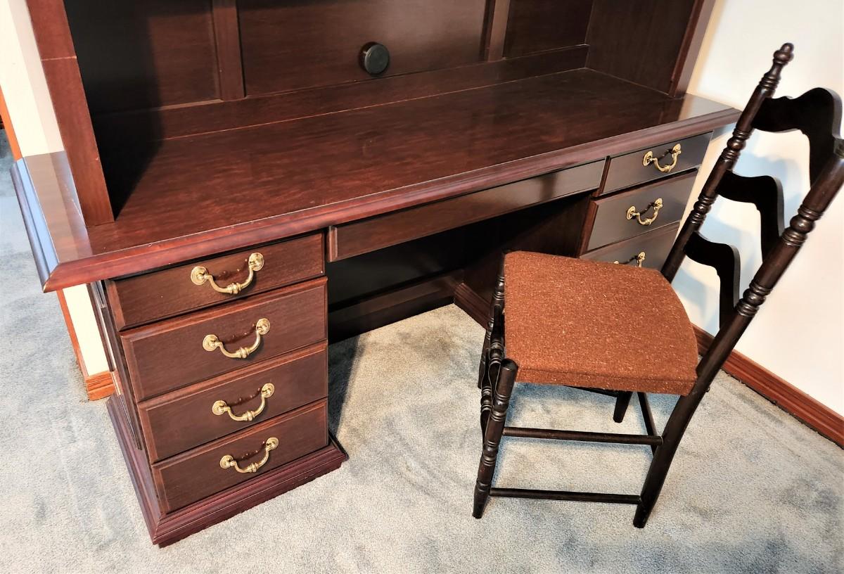 Great mahogany finish desk/bookcase combo with rush-bottom chair - no maker noted. Good used condition. 6 feet tall, bookcase comes off. 66" across, 19" deep. 7 drawers, 2 file drawers. Chair is 18" across, 16" deep and 38" tall. Note: This set is upstairs and buyer will need to be able to move it without assistance.