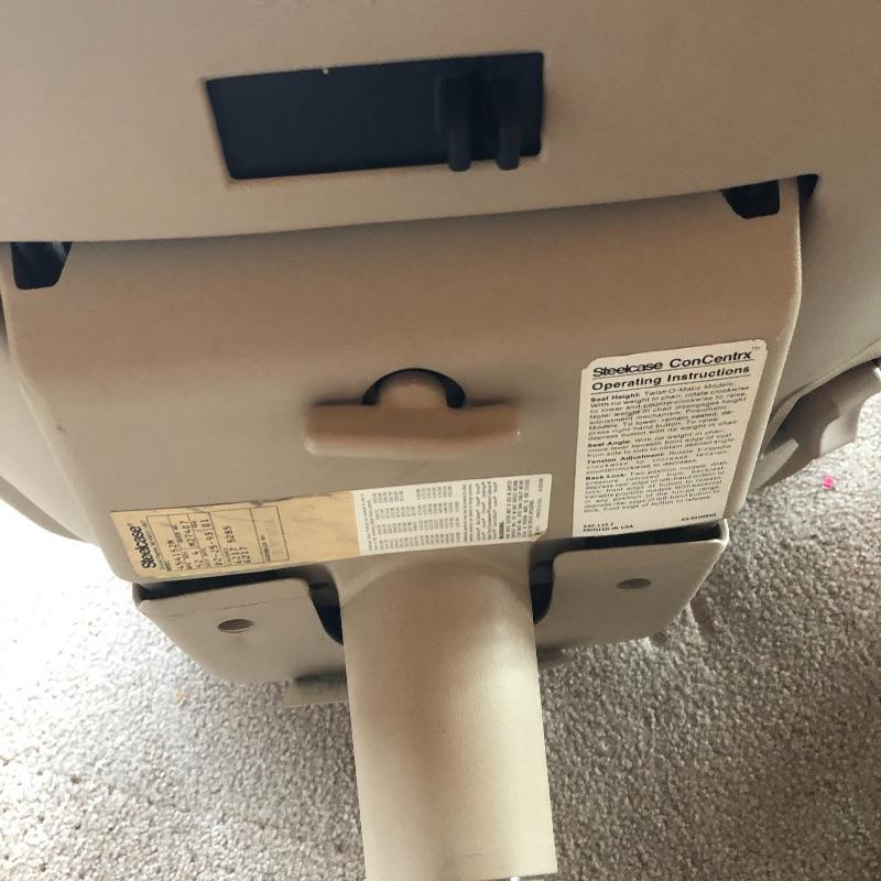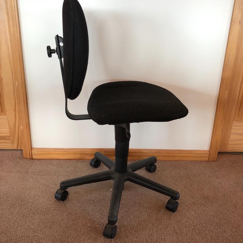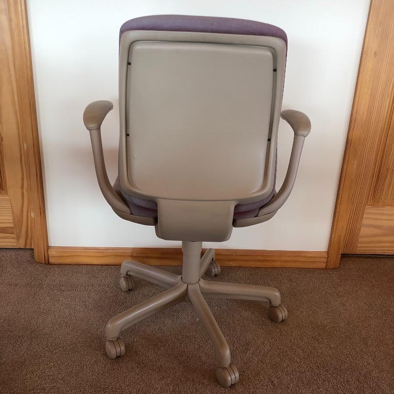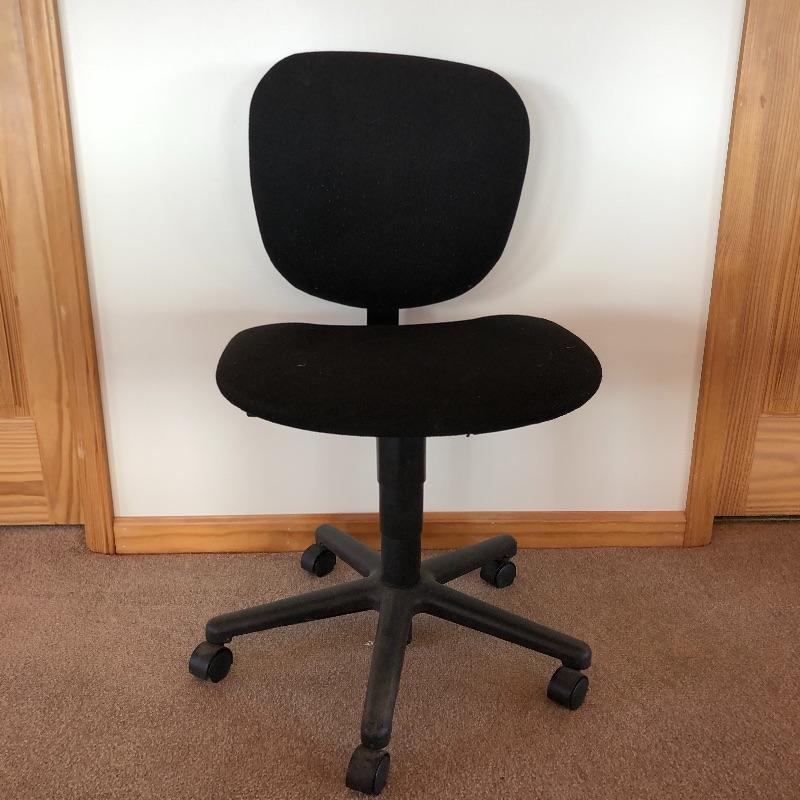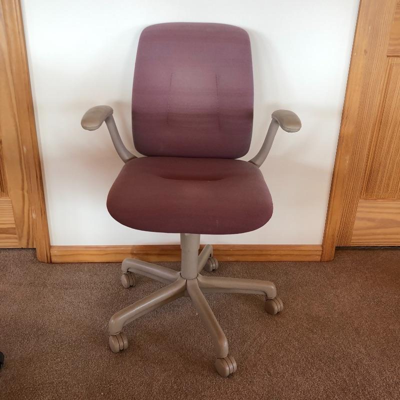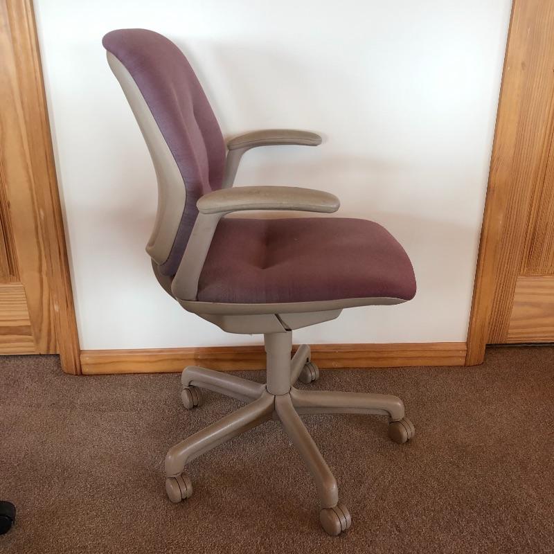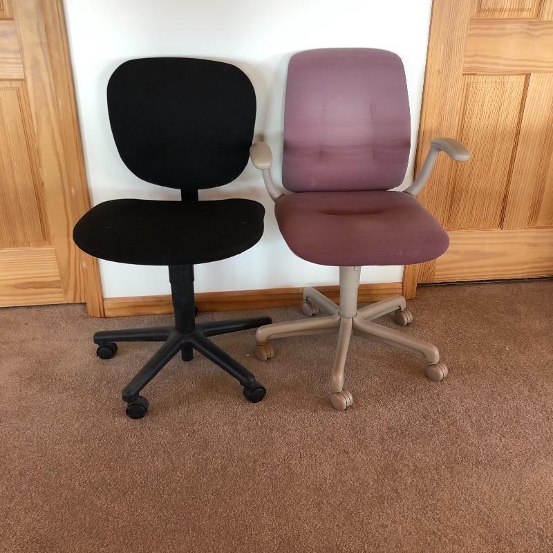 This pair of office chairs that roll and swivel, will be great for your home or office. Lot includes one armless chair and one Steelcase brand office chair with arms. Both are adjustable height wise.