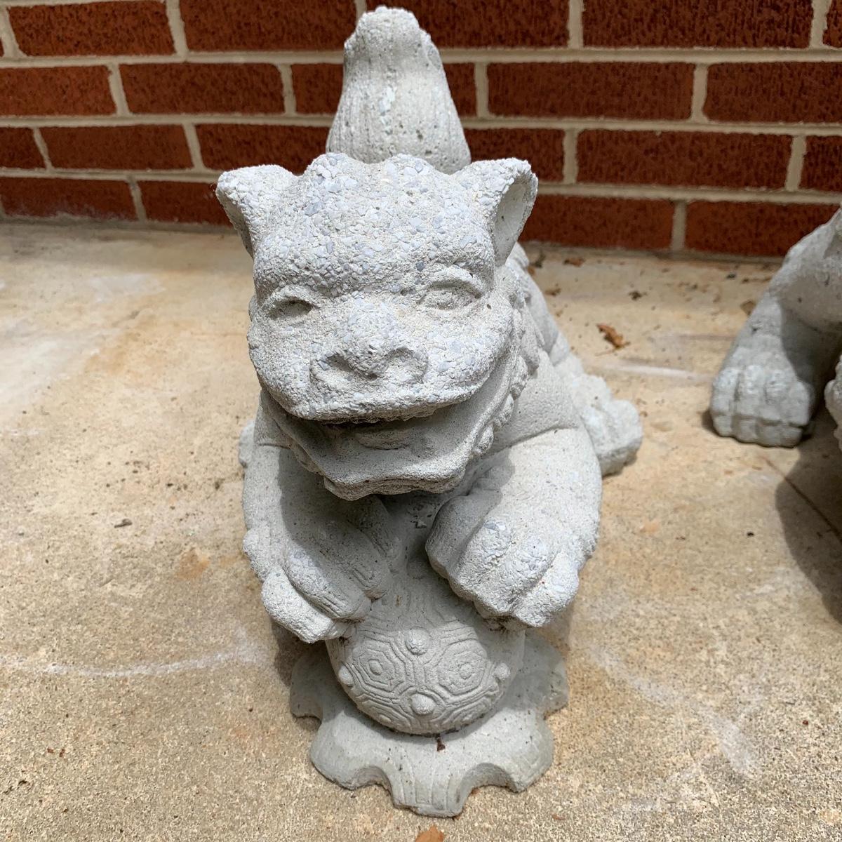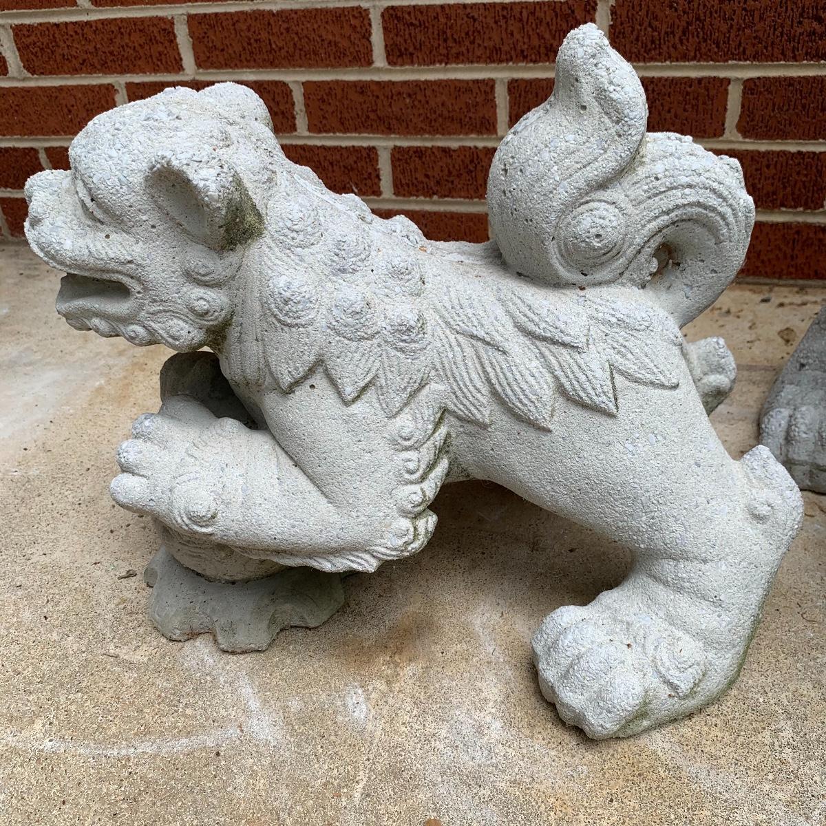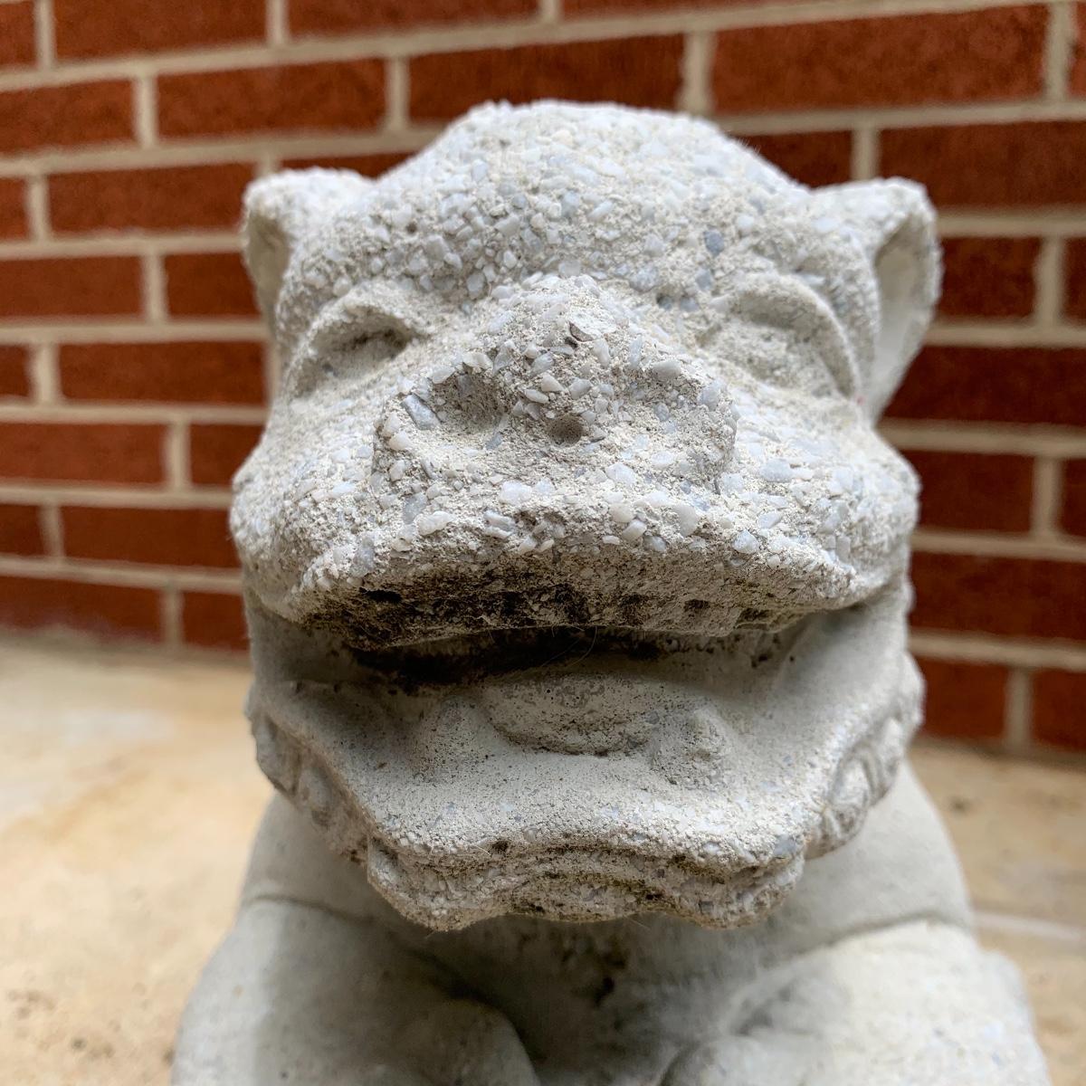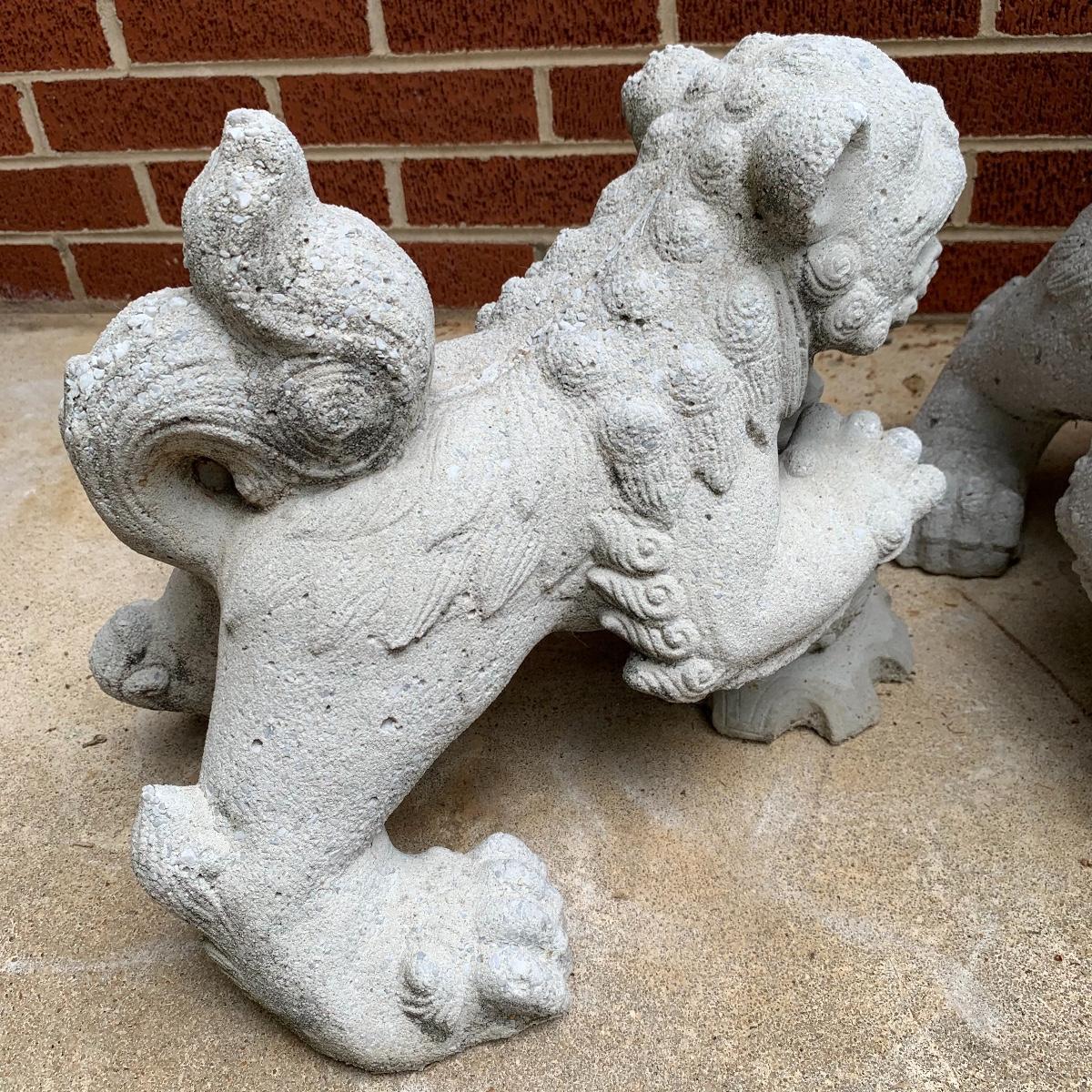 This lot consists of two matching stone fu dog statues. Their front paws are perched atop a ball . Although they are matching, one is made from finer stone particles, while the other is more coarse. They are both beautiful and interesting. They show signs of wear from being outside. They are approximately 16” long and 13” tall. They are quite heavy. Local pickup only. Please be aware of their weight and that the winning bidder will need to move them from the back patio of a home with stairs.