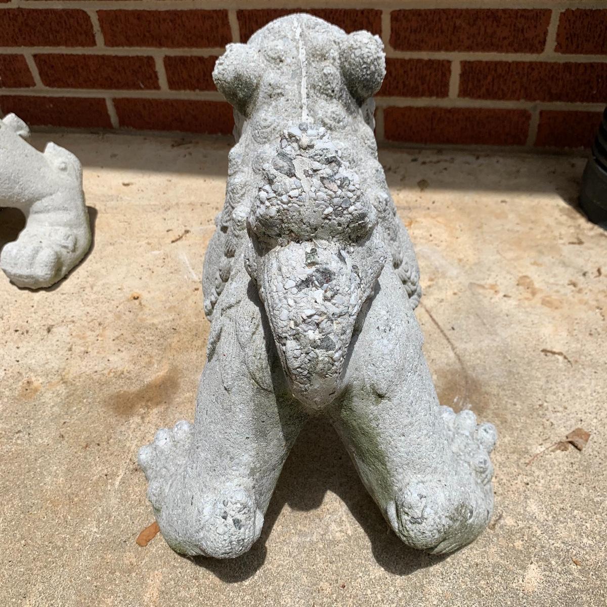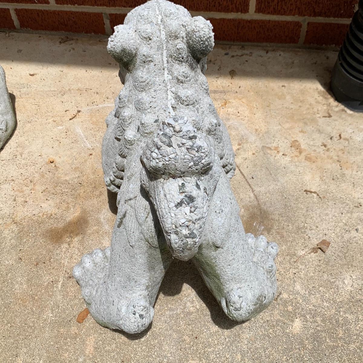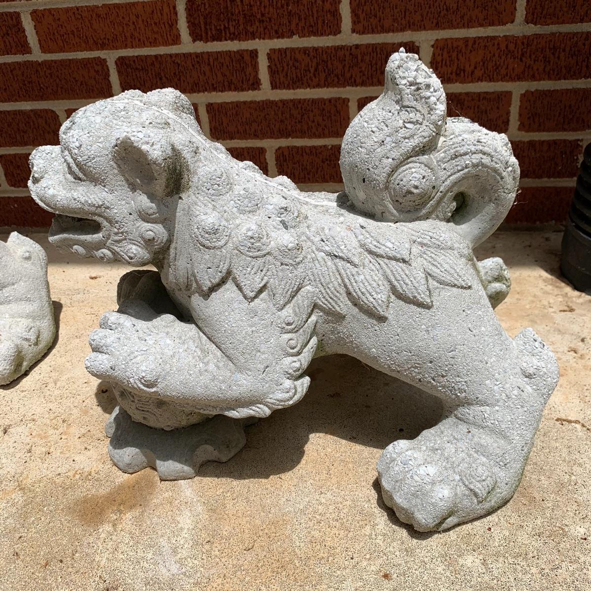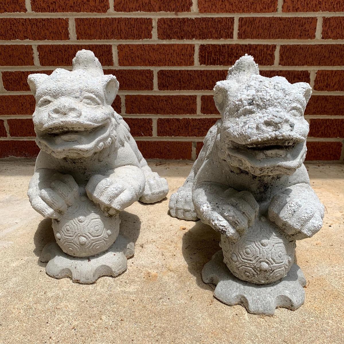This lot consists of two matching stone fu dog statues. Their front paws are perched atop a ball . Although they are matching, one is made from finer stone particles, while the other is more coarse. They are both beautiful and interesting. They show signs of wear from being outside. They are approximately 16” long and 13” tall. They are quite heavy. Local pickup only. Please be aware of their weight and that the winning bidder will need to move them from the back patio of a home with stairs.