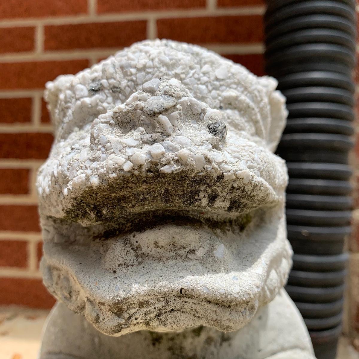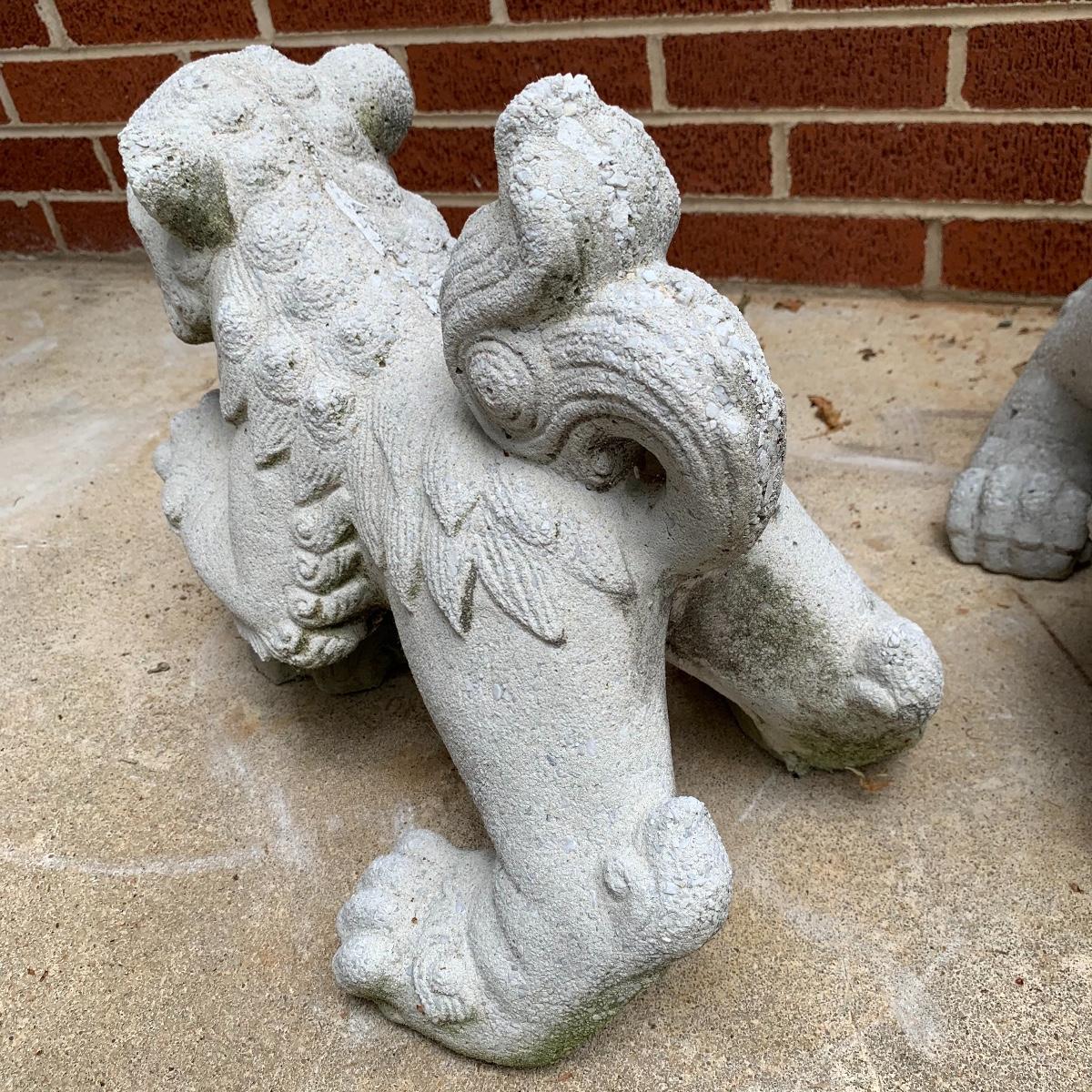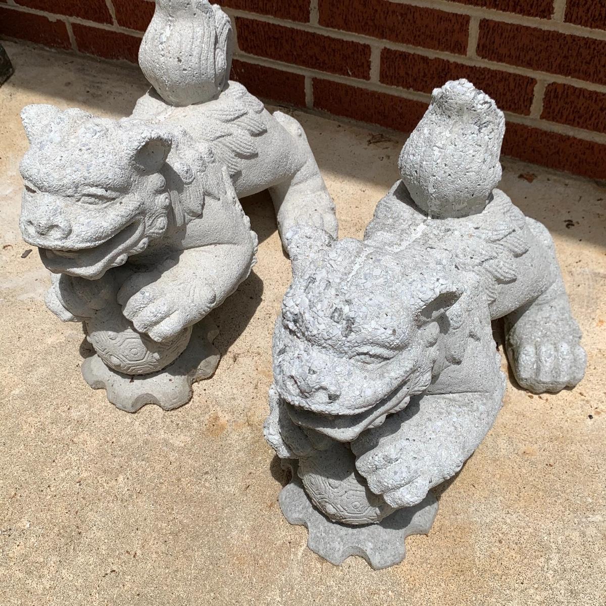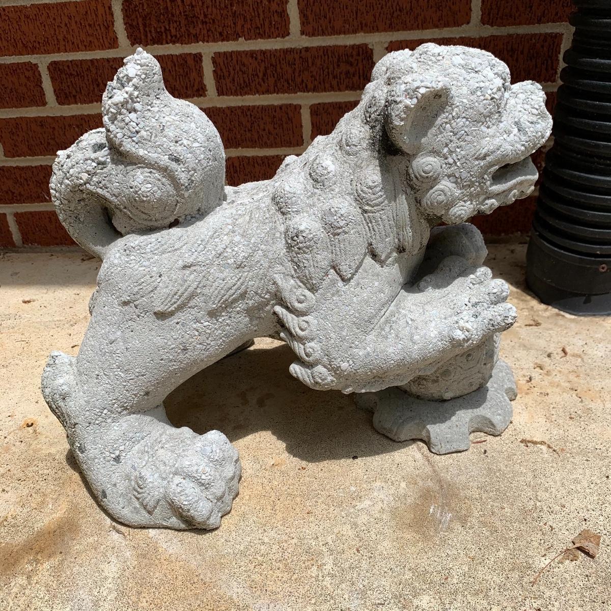This lot consists of two matching stone fu dog statues. Their front paws are perched atop a ball . Although they are matching, one is made from finer stone particles, while the other is more coarse. They are both beautiful and interesting. They show signs of wear from being outside. They are approximately 16” long and 13” tall. They are quite heavy. Local pickup only. Please be aware of their weight and that the winning bidder will need to move them from the back patio of a home with stairs.