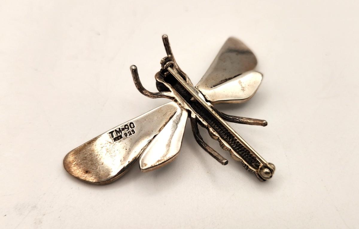 Rather heavy, marked Sterling with Artist's mark of TM-90. Nicely detailed dragonfly brooch, measures 2.5" across at wingspan.