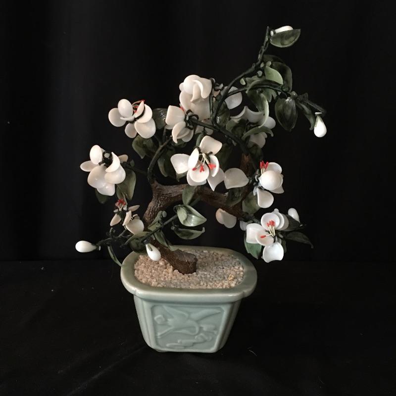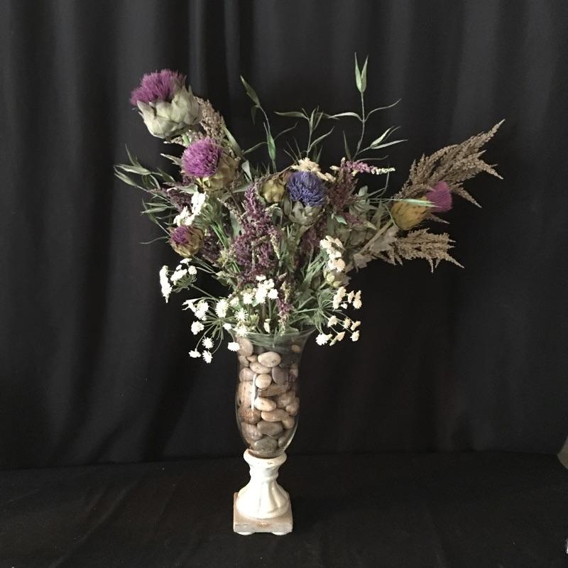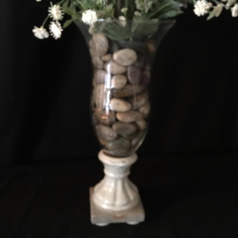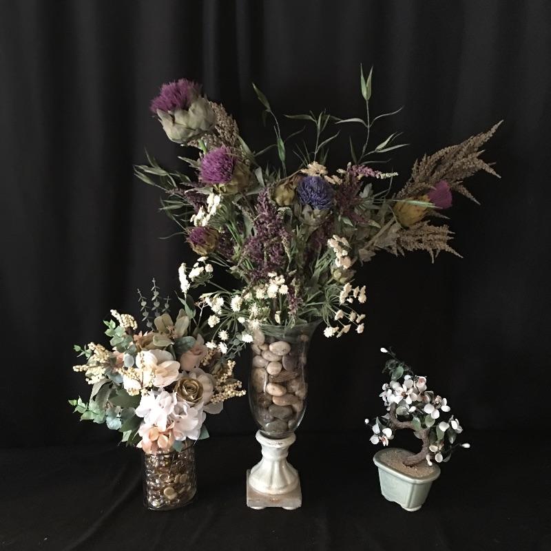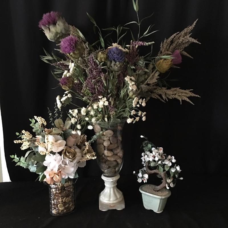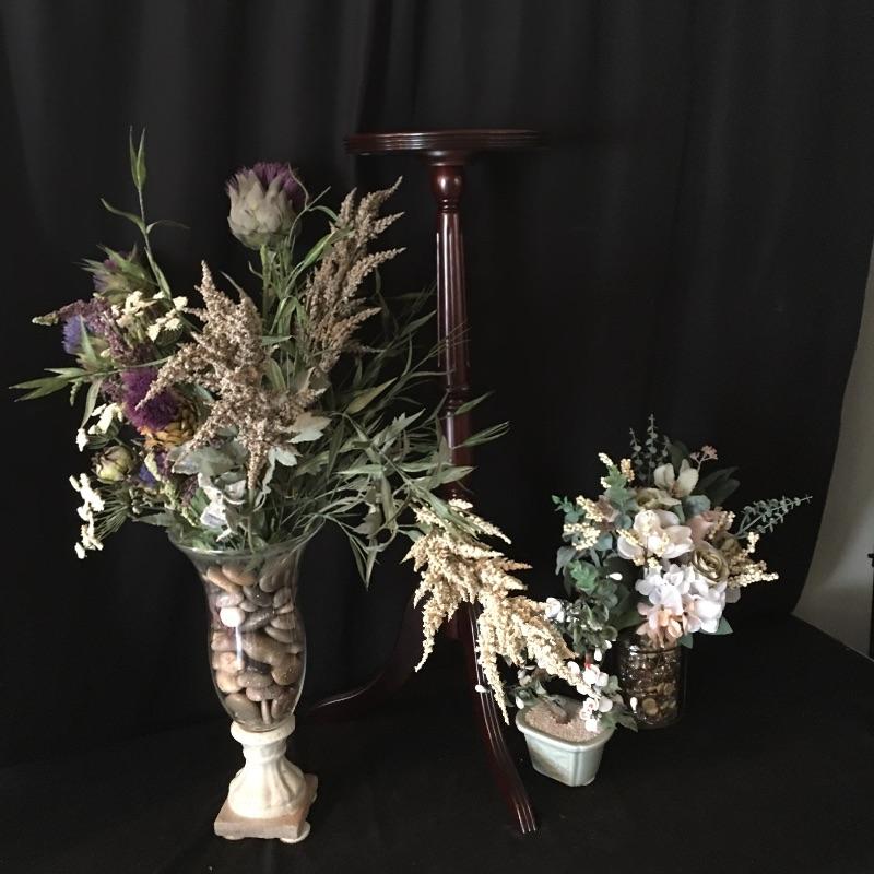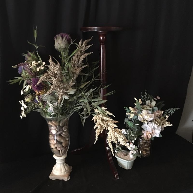 This trio of faux flowers includes one glass vase with stones and flowers, one glass vase with metal frame and flowers and a bonsai style tree with what appears to be glass petals and leaves. Also includes a Bombay Pedestal that measures 35” tall and has some scratches on top, see pictures.