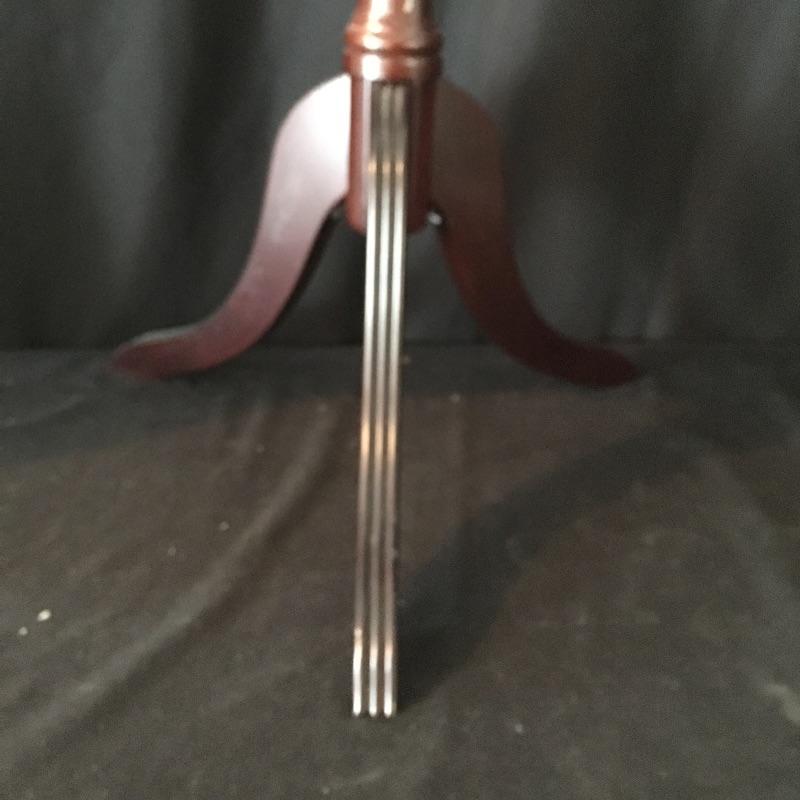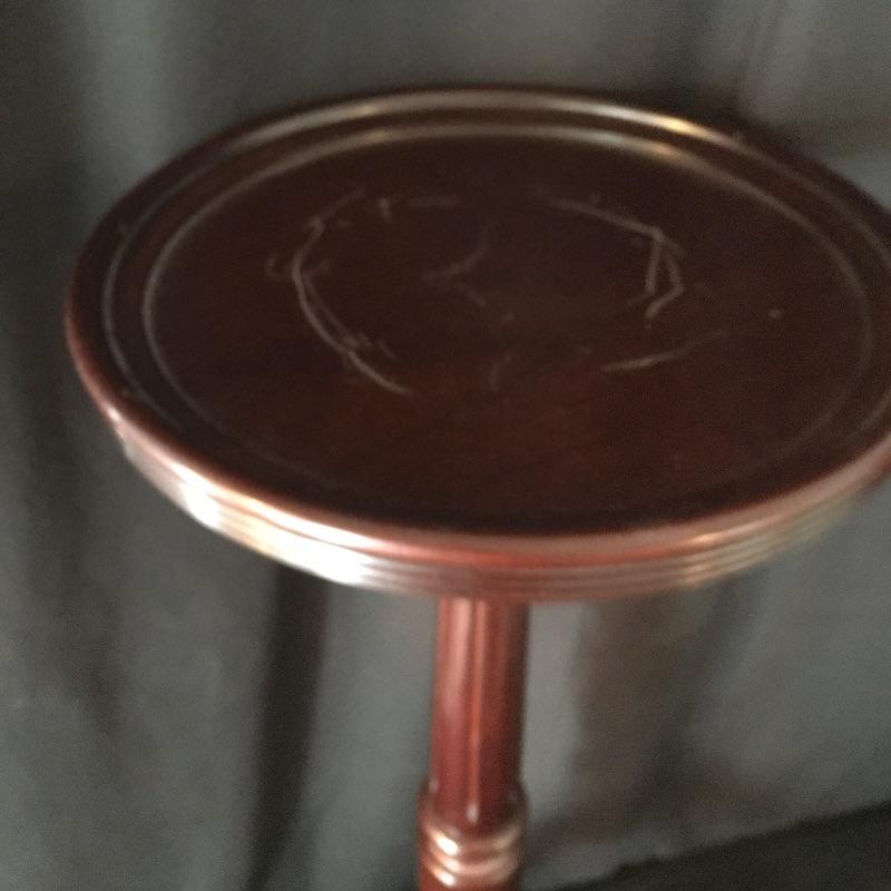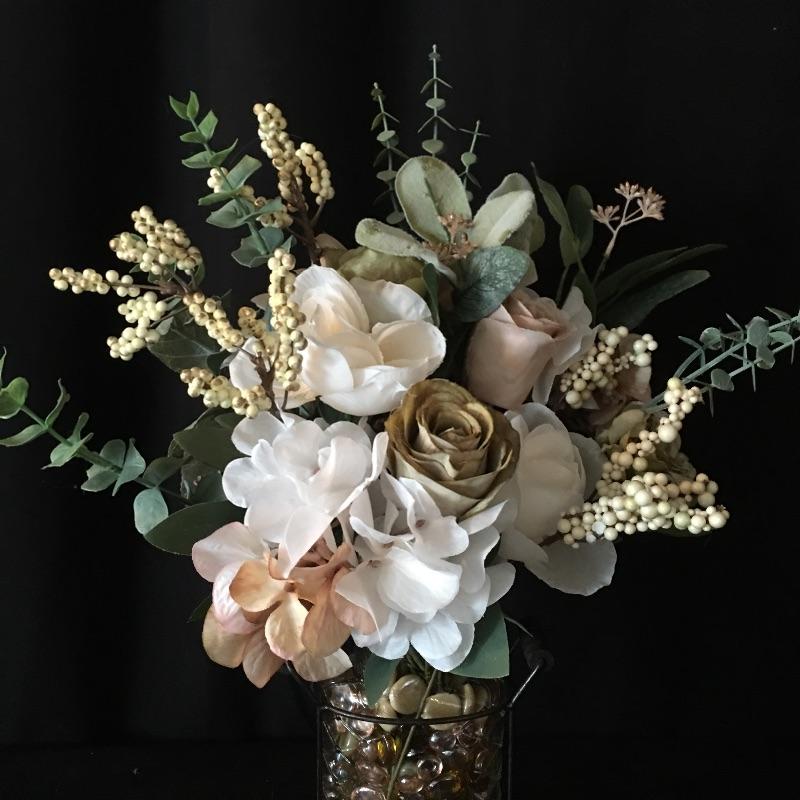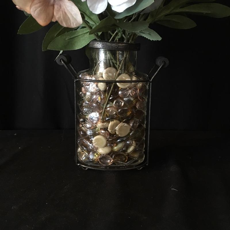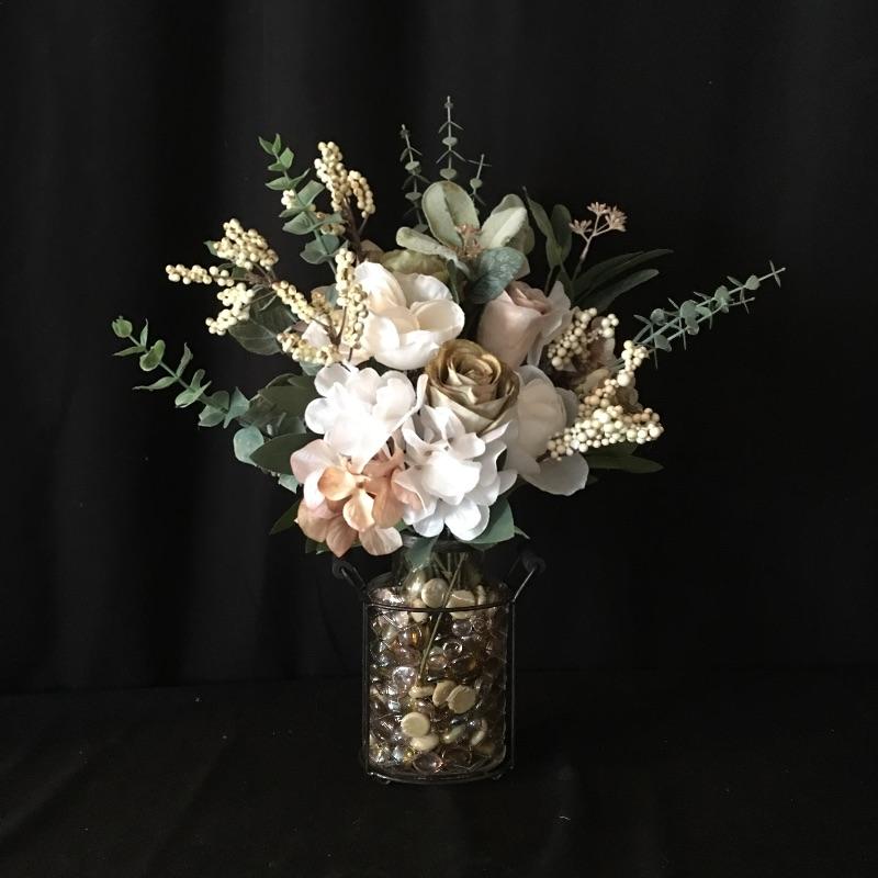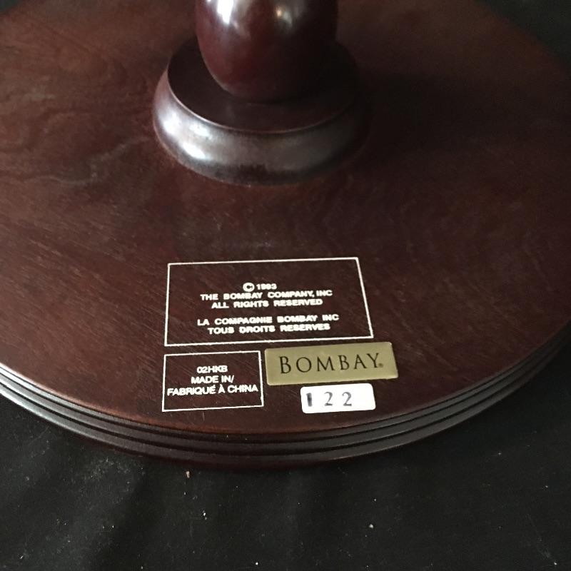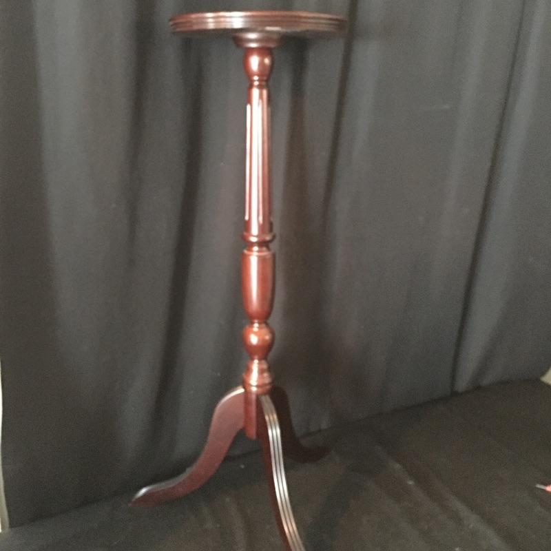 This trio of faux flowers includes one glass vase with stones and flowers, one glass vase with metal frame and flowers and a bonsai style tree with what appears to be glass petals and leaves. Also includes a Bombay Pedestal that measures 35” tall and has some scratches on top, see pictures.